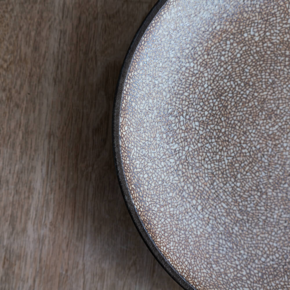 器全体に広がるひびのような模様は、かいらぎのちぢれた表情をモチーフに、一枚ずつ施されたもの。自然に生まれるかいらぎや貫入とは少し異なり、あらかじめ下絵として描かれた線と、焼成による釉薬のにじみが重なって、やわらかな奥行きのある表情に仕上がっています。均一になりすぎない揺らぎがあり、同じものはひとつとしてありません。