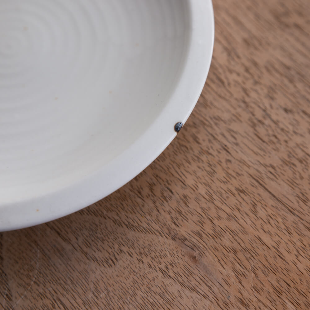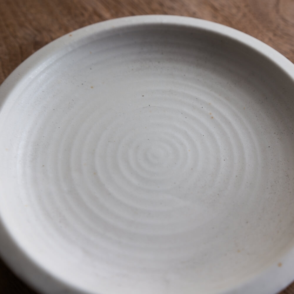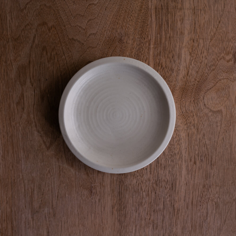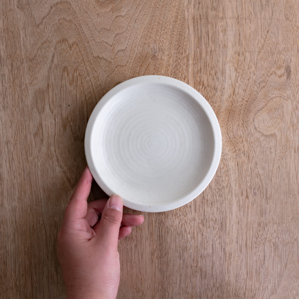 縁にさりげない段差をつくった「括り手」の意匠が特徴。盛り付け部分と縁の間に動きが生まれ、シンプルながら少し表情のある佇まいに。手にしたときの指掛かりとしても心地よく、扱いやすい形です。