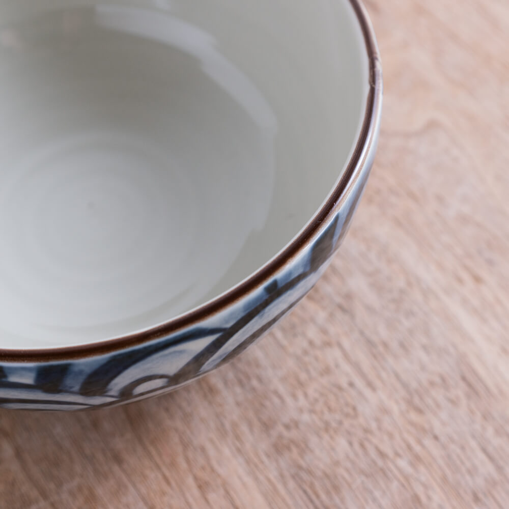口縁部には焦げ茶の釉薬を巻き、白と藍のコントラストを調和。落ち着きのあるラインが、全体の雰囲気を整えています。