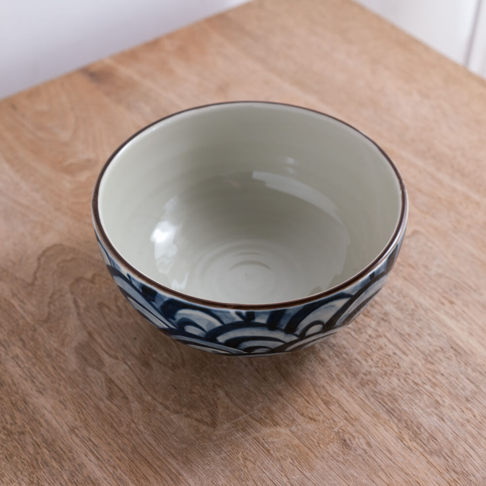 外側にかけてふっくらと膨らむ丸みが、このうつわの大きな魅力のひとつ。波模様の力強さとは対照的に、フォルムはやさしく柔らかい印象で、食卓に置いたときに“ほっとする雰囲気”をつくってくれます。手に添わせたときも持ちやすく、見た目だけでなく機能面でも心地よい形です。