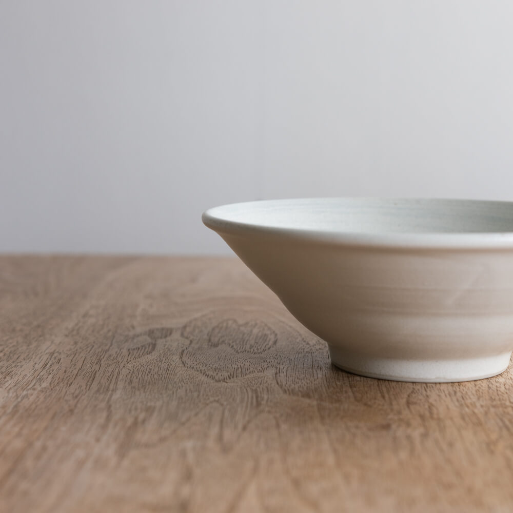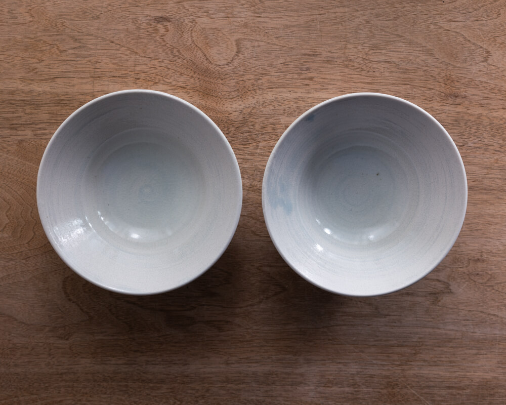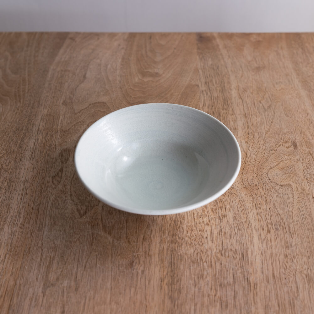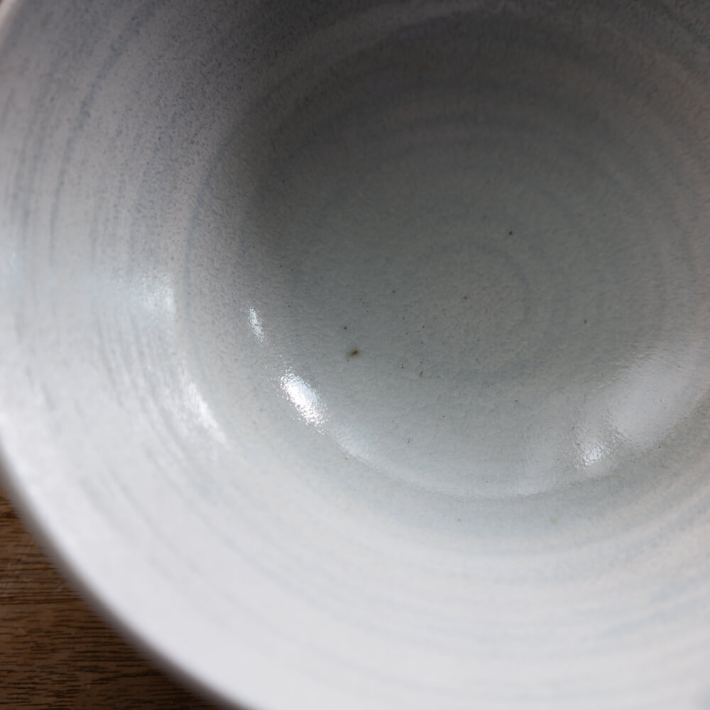 ほんのり青みを帯びた白釉に、ろくろ目の渦がやさしく浮かぶ16.5cmの深鉢です。 さらりとした氷のような質感が、日々のごはんをすっと受け止めてくれる一枚。 和食器の落ち着きと、洋のテーブルにも合わせやすいシンプルさを併せ持っています。