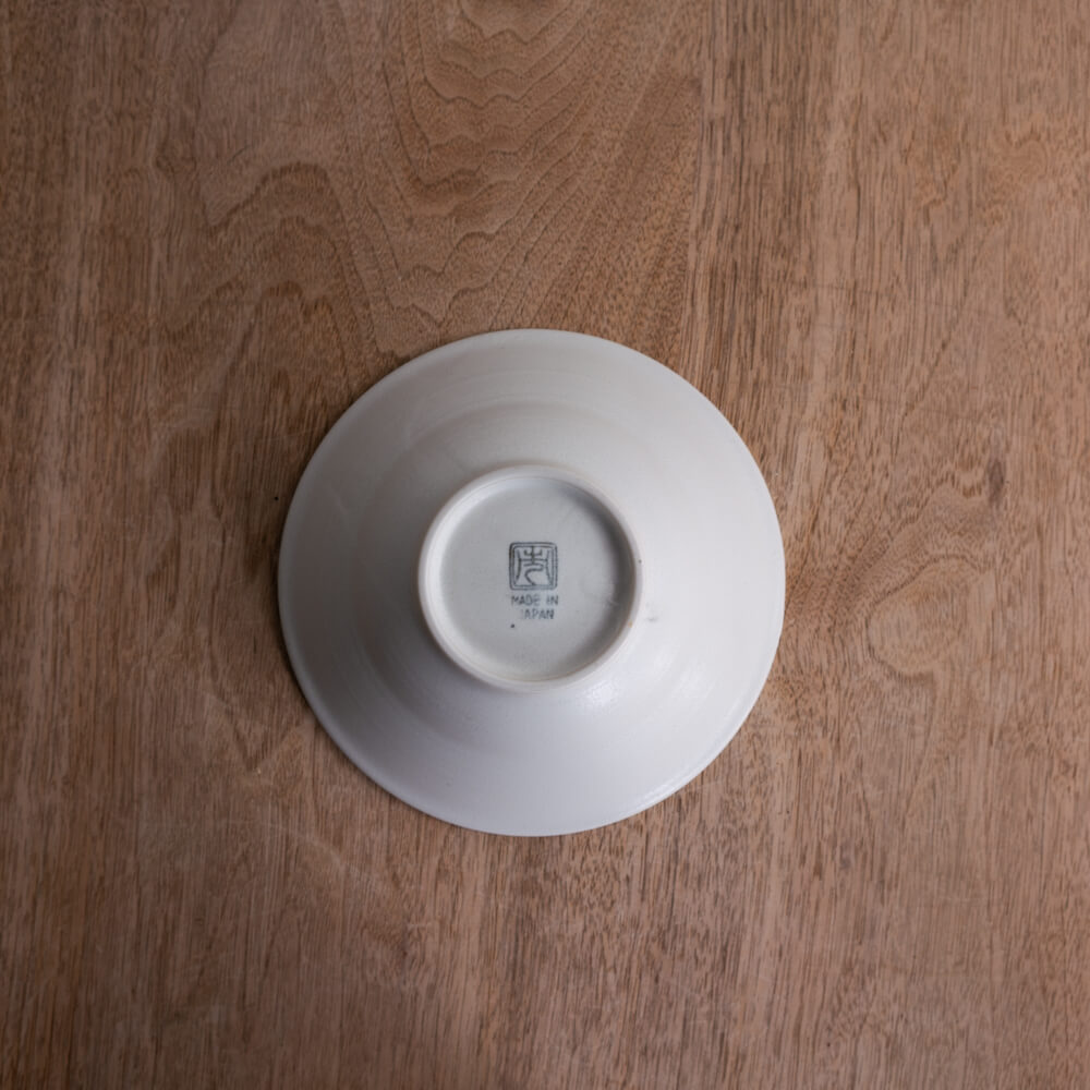 うっすらと青みを帯びた白釉が全体を包み、見込みにはろくろ目の渦模様がやわらかく続いています。 均一な真っ白ではなく、ごく細かな濃淡や点があることで、料理をのせたときに陰影が生まれ、素材の色味を引き立ててくれます。