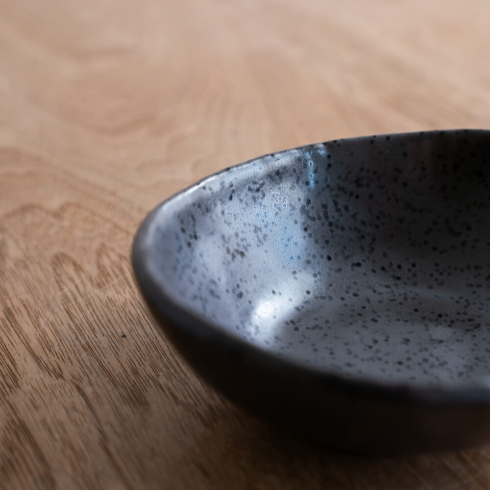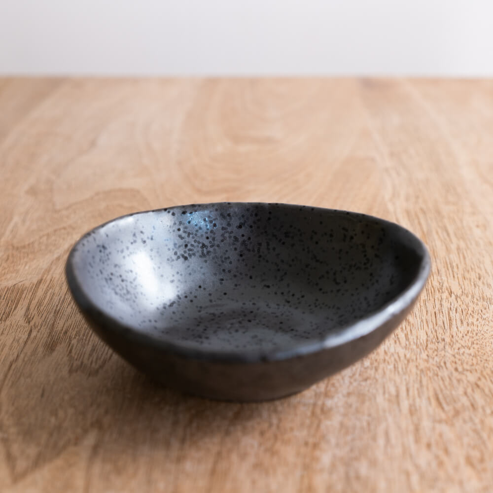 くすんだ黒のマット釉に、細かなつぶ模様。手のひらにころんと収まる変形シルエットが、日々の食卓にさりげないリズムを生む4寸サイズの小鉢です。和食器らしい土のあたたかさと、モダンな表情をあわせ持った器なので、和洋どちらのメニューにもすっと馴染みます。