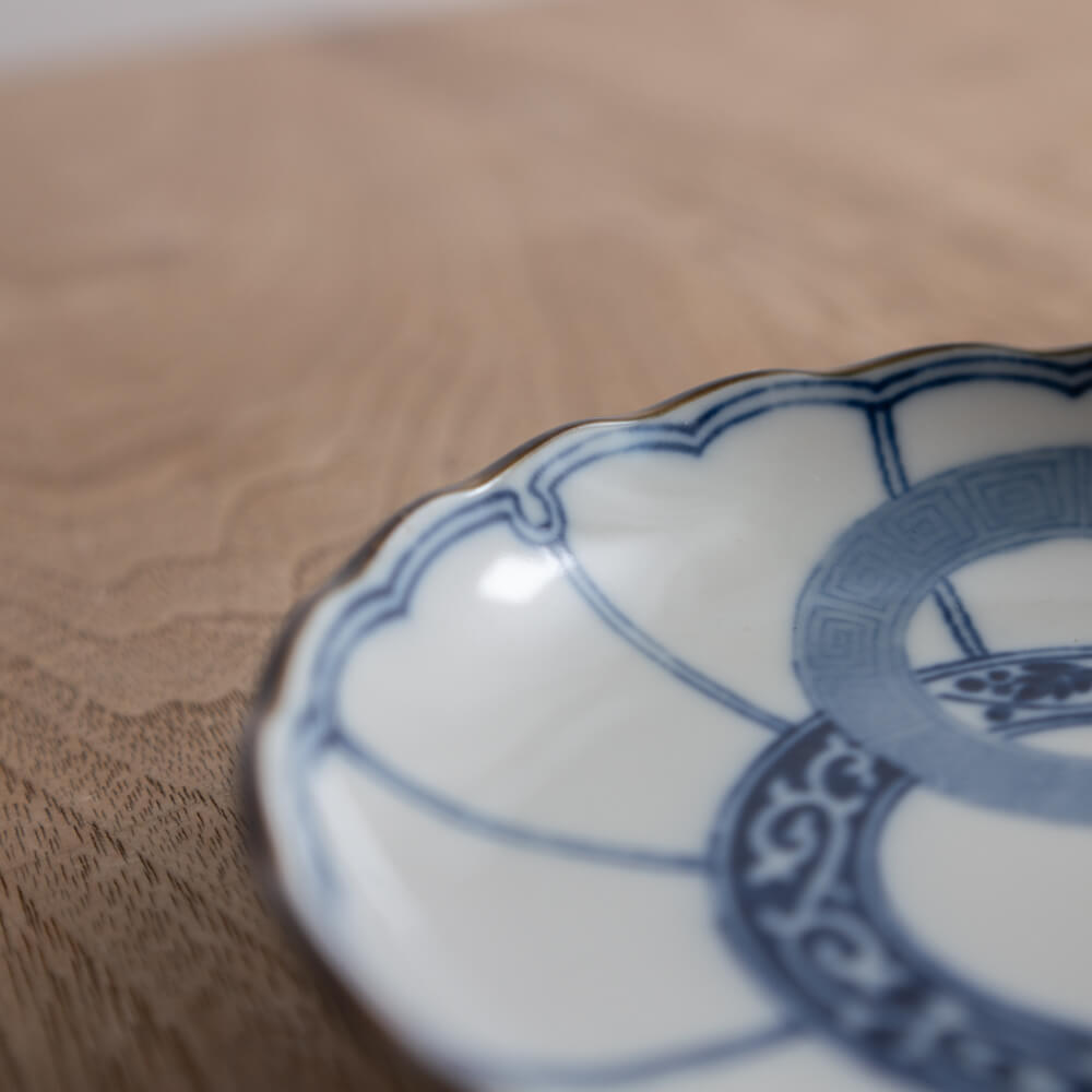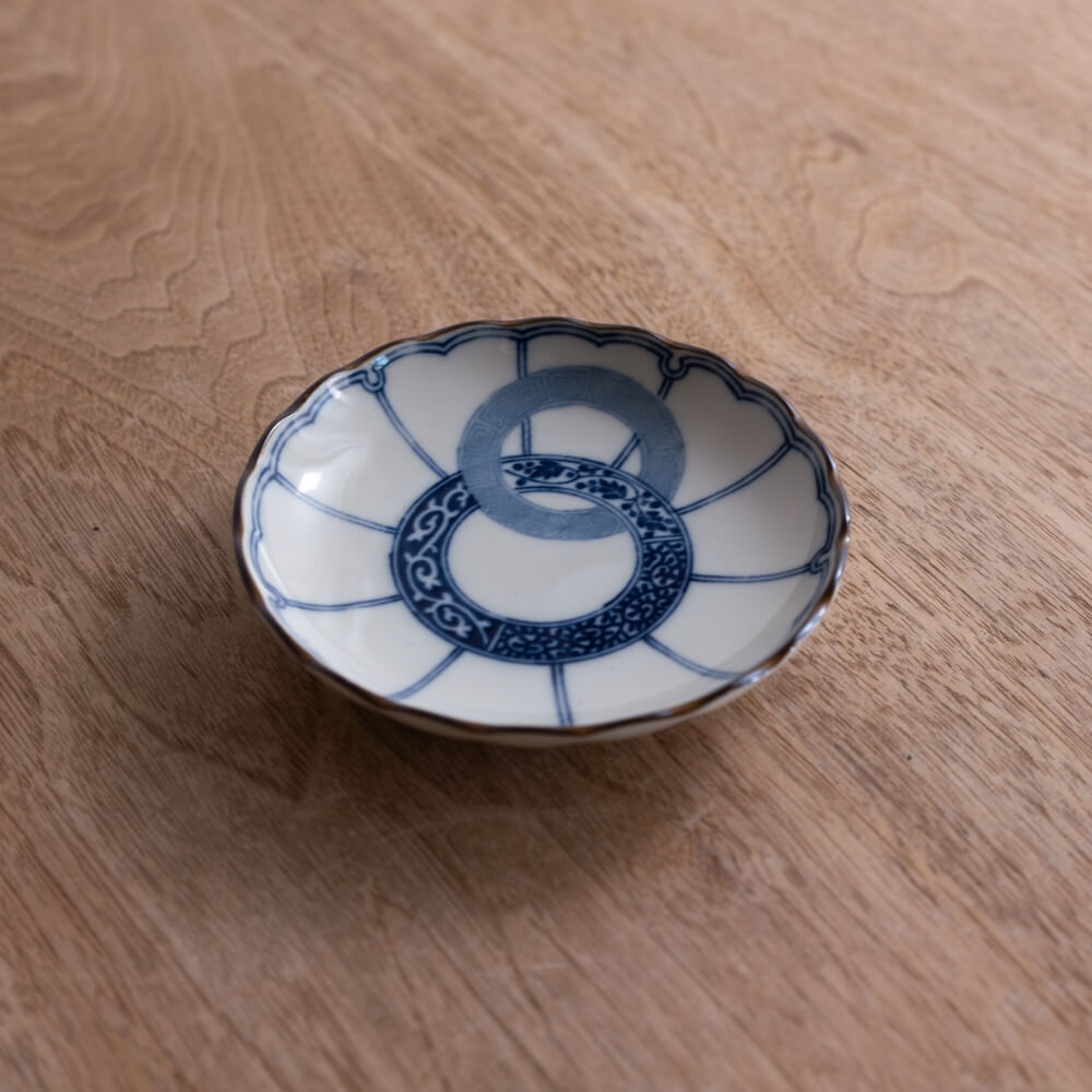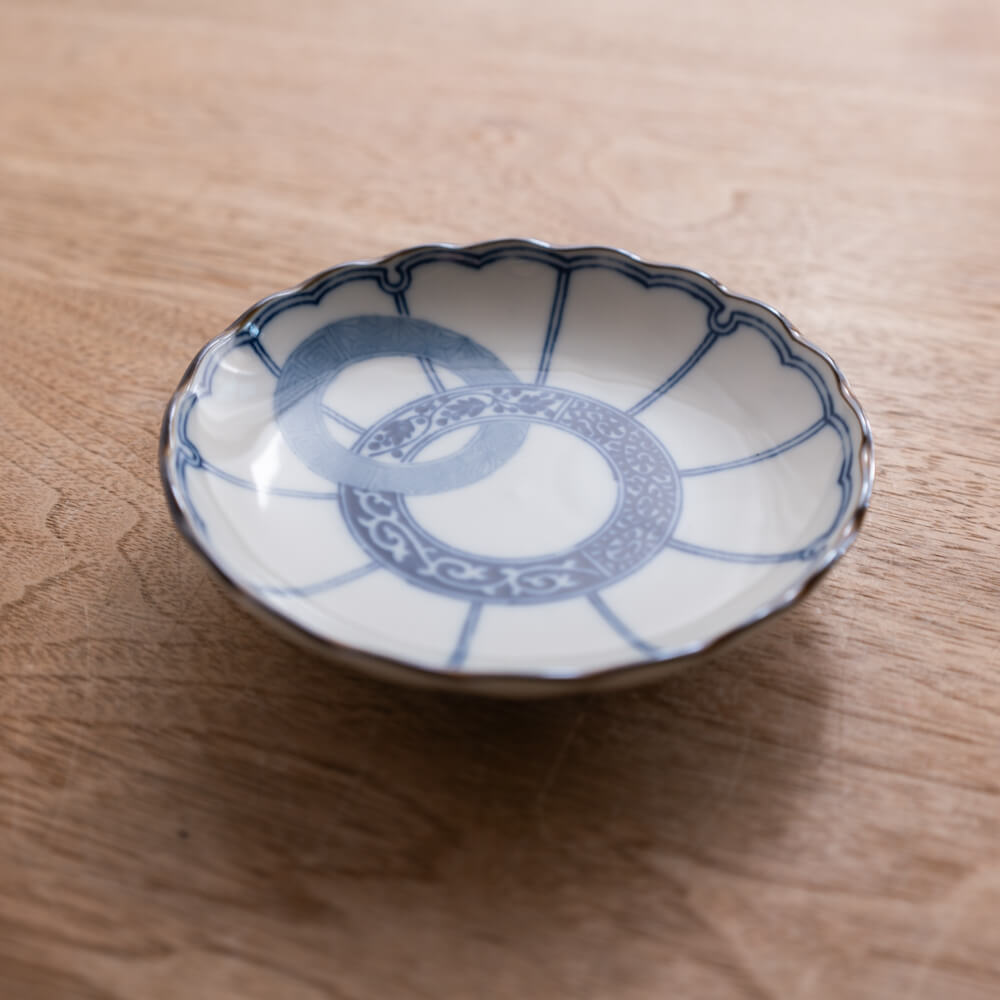 淡い呉須の重なりと、菊割のリズムあるライン。指先に収まる小皿ながら、テーブルに置くだけで日本の意匠美を感じられる一枚です。磁器ならではのつるりとした質感と、やや立ち上がった縁が使いやすく、副菜・お漬物・菓子皿まで幅広く活躍します。