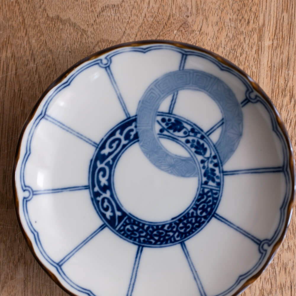 中央に描かれた二重の輪文は、濃淡をつけた呉須で奥行きを表現。一方は繊細な幾何文様、もう一方は唐草調の意匠と、表情の異なる二つの輪が重なり合い、視線を惹きつけます。控えめなのに存在感がある、現代の食卓に馴染むデザインです。