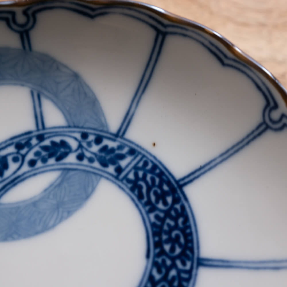 磁器ならではの明るい白と、透明感のある青。さらに縁にはほんのりと施された“縁錆”のようなブラウンの化粧が入り、アンティークの趣を感じさせます。シンプルな食卓にも、和の膳にも調和し、器同士の相性を選びません。