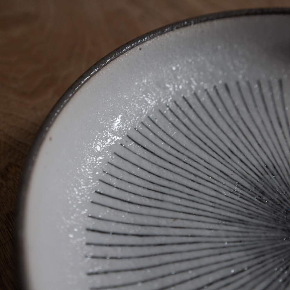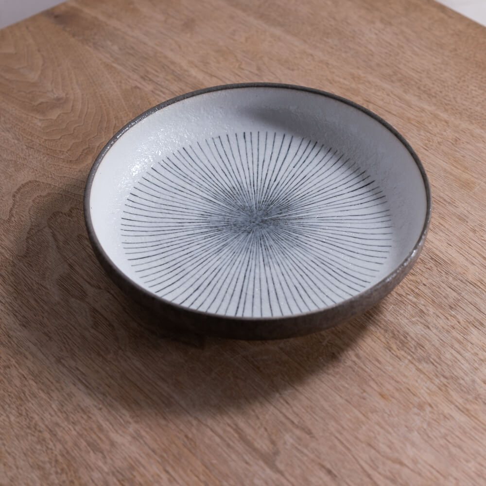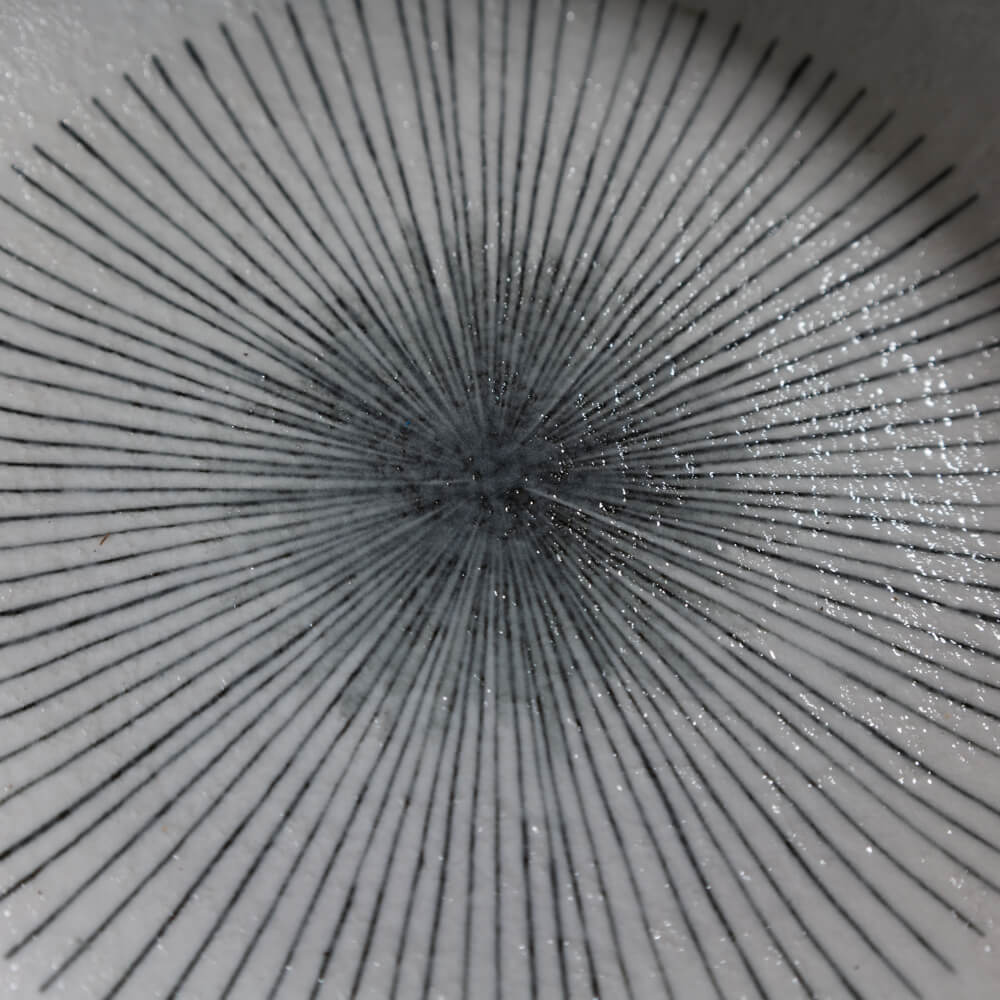 中心から外へ伸びる放射状の十草は、器の奥行きを自然に強調。盛り付けた料理が中央へふわりと収まり、視線が料理に向かいます。和食はもちろん洋食にも馴染む、現代的な線文様です。
