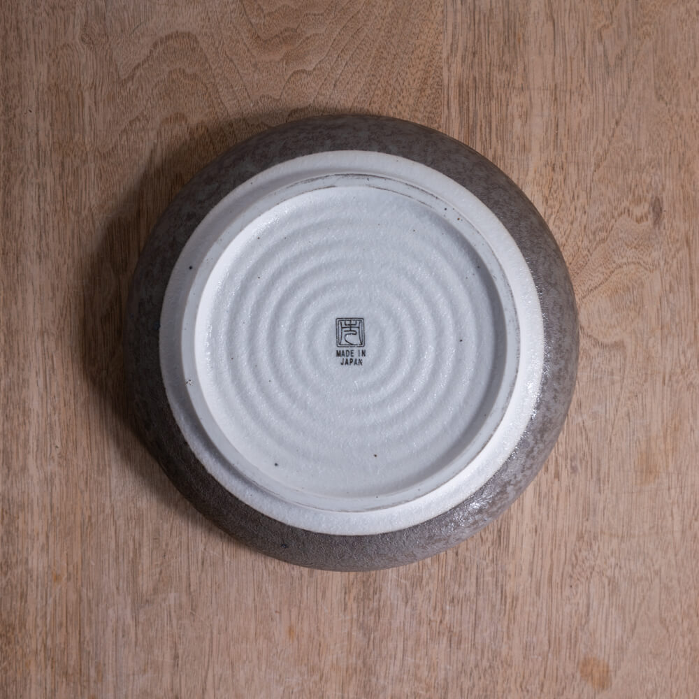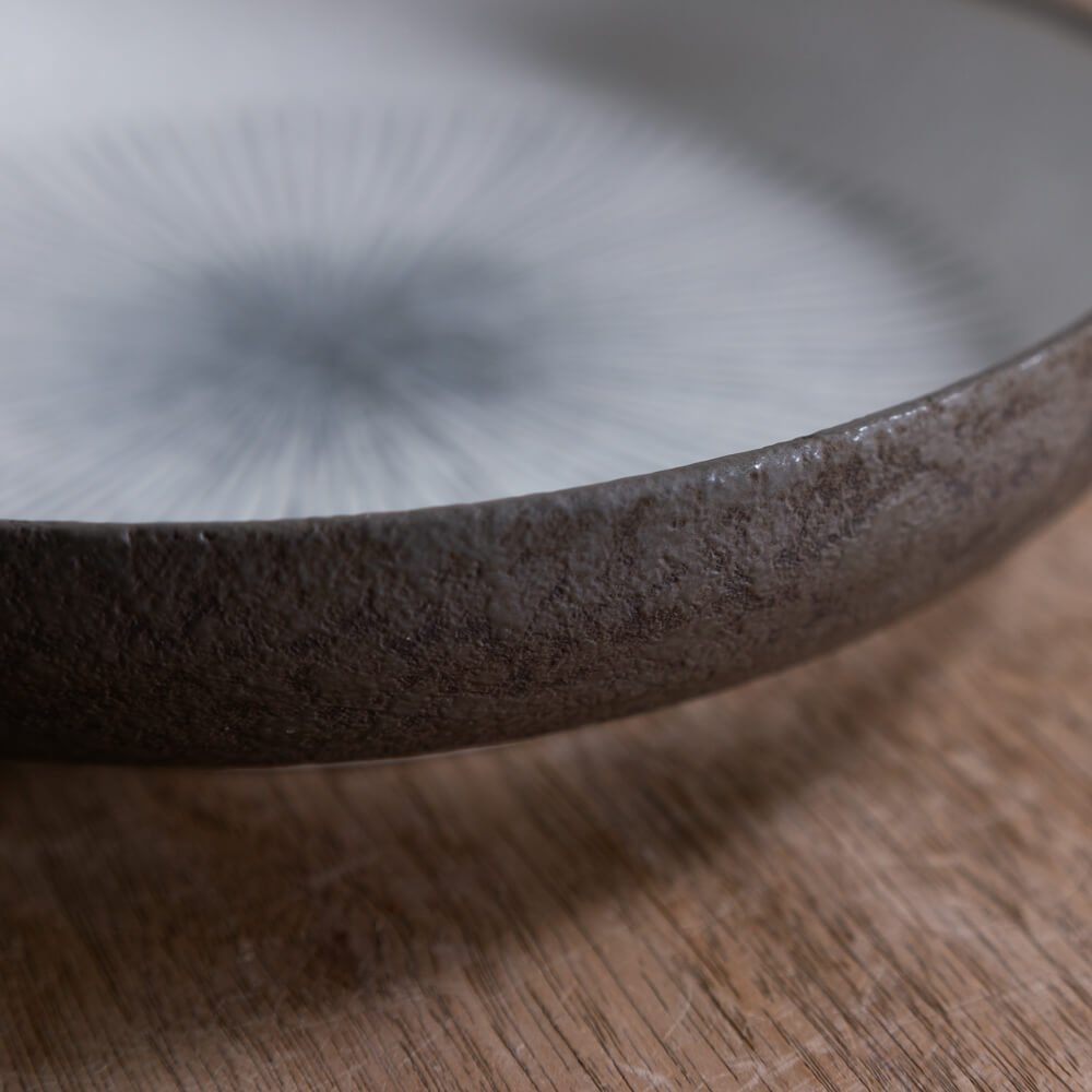 やや深さをもたせた郷巻フォルムに、中心から放射状に伸びる十草。白釉の上で細い黒線が“光の筋”のように広がり、盛りつけた料理に自然な陰影を与えてくれます。表面に細かな凹凸がキラッと反射。外側は焼き締めのようなマットな質感で、手に持ったときの温かさが心地よい。和・洋問わず使えて、パスタ・カレー・炒め物・サラダまで幅広く受け止める万能な一枚です。