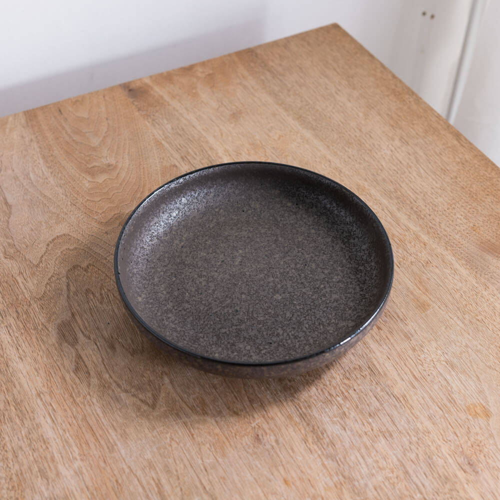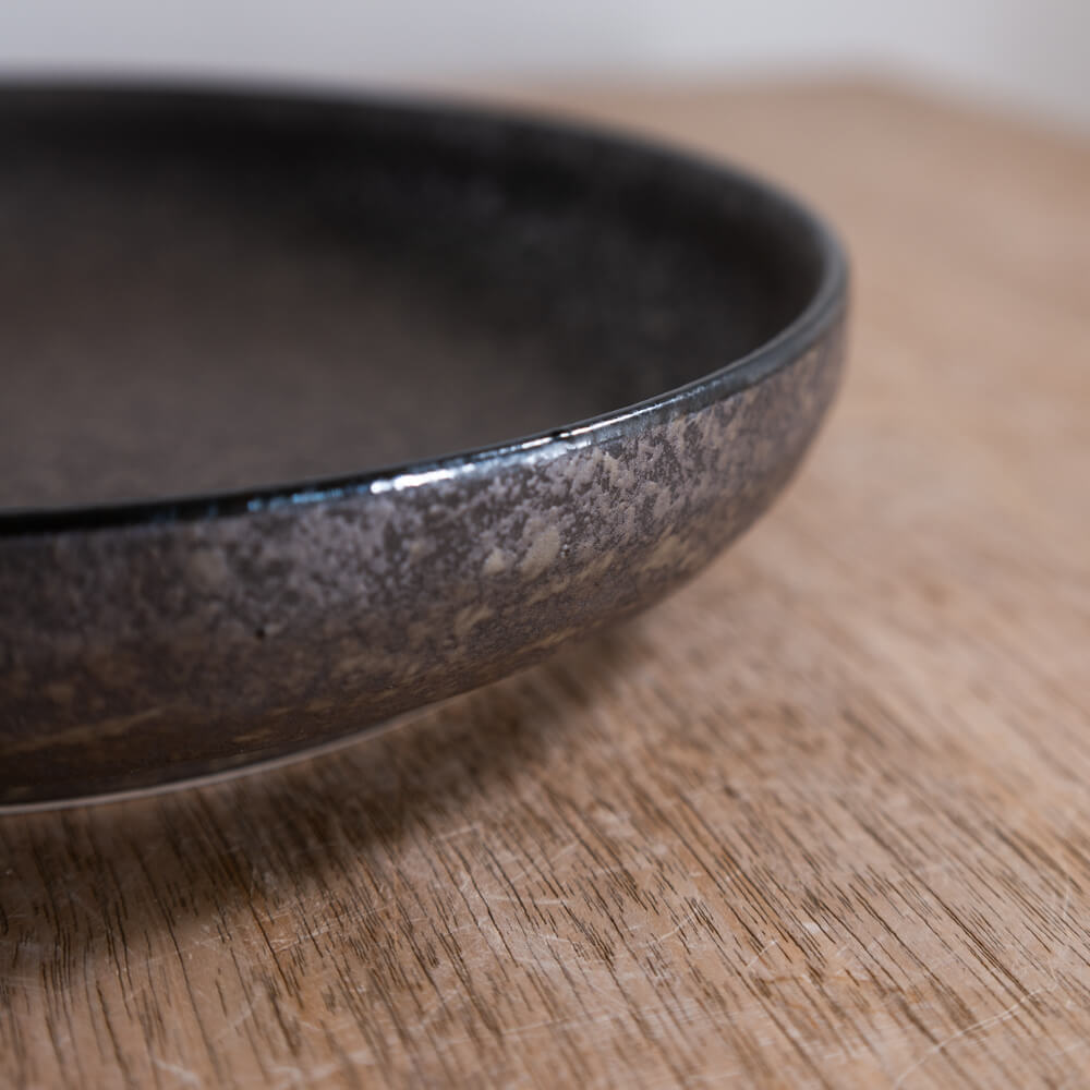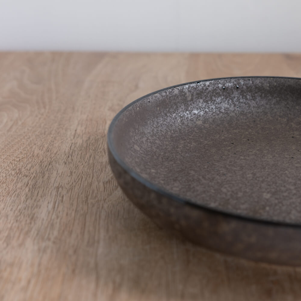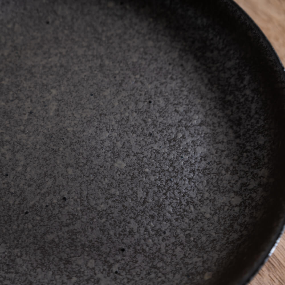 しっとりとした黒マットの上に、細かな粒状の模様が霜のように広がる七寸の深皿。均一でない濃淡が焼きものらしい奥行きを生み、料理の色を自然に際立たせてくれる和食器です。パスタ・メイン料理・ワンプレートまで幅広く使える万能サイズで、日常の食卓に落ち着いた雰囲気を添えます。