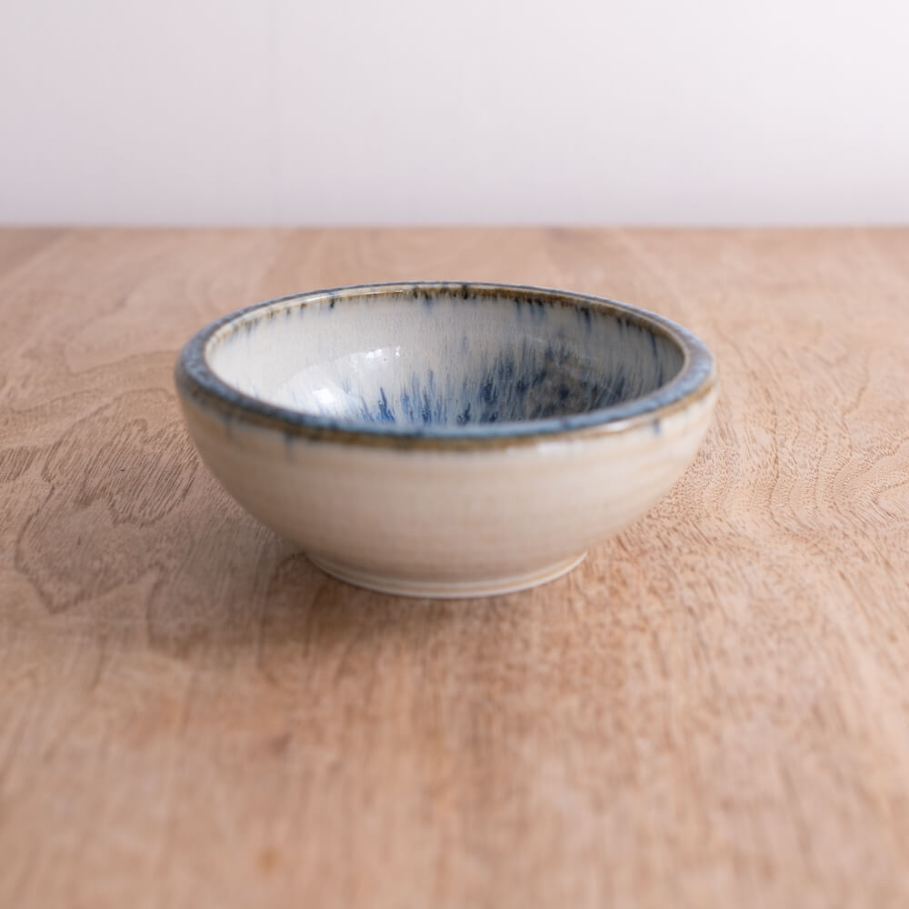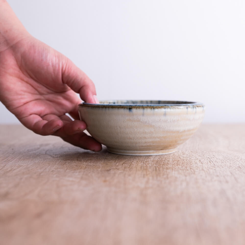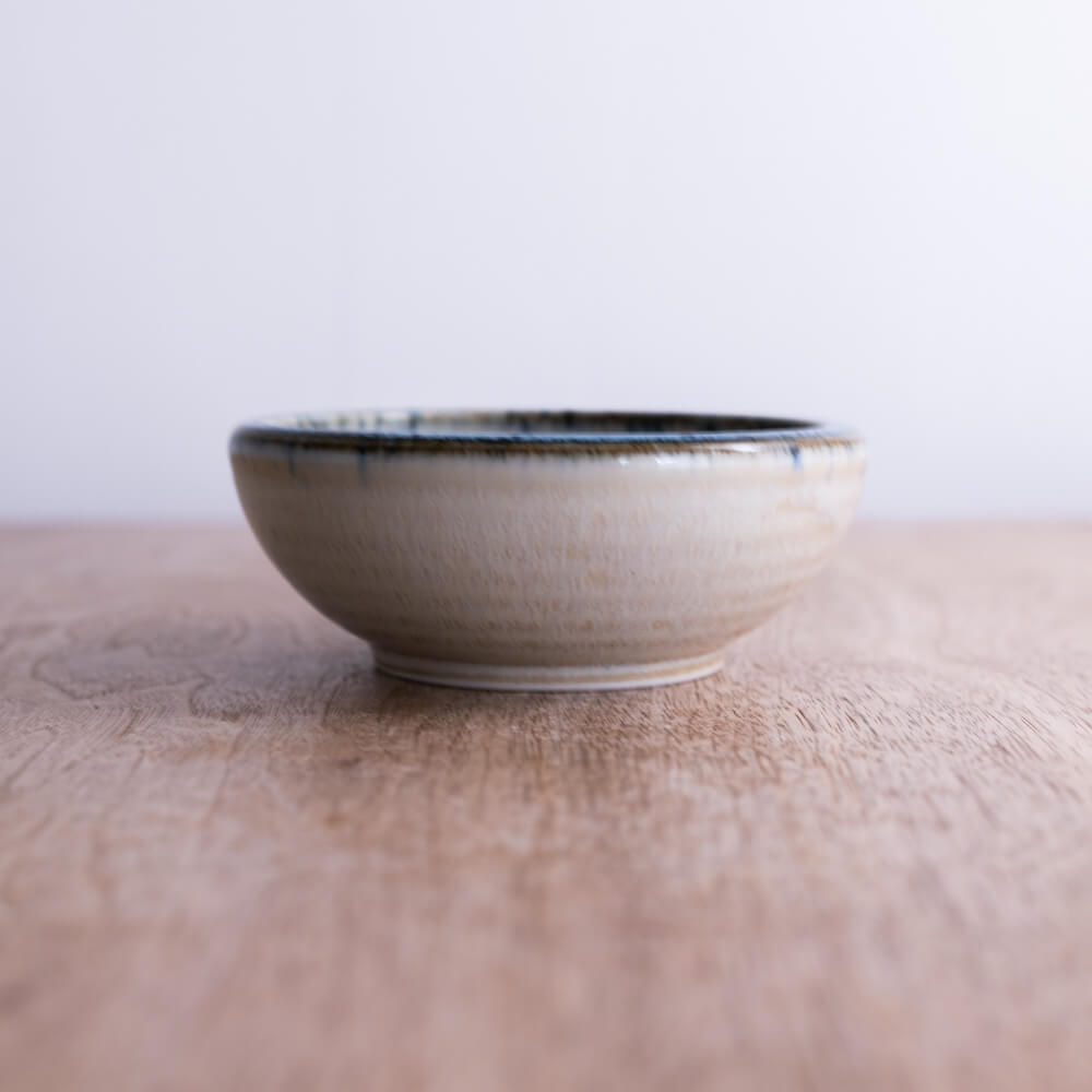 括り手”がつくるほどよい厚み。縁まわりは約5mm。持った瞬間に感じる“丸みと厚み”が、小鉢とは思えない安心感につながります。縁が絞られた設計のため、スープ・副菜・和え物など、汁気のある料理にも使いやすく、食べる動作が自然と整うのも魅力です。