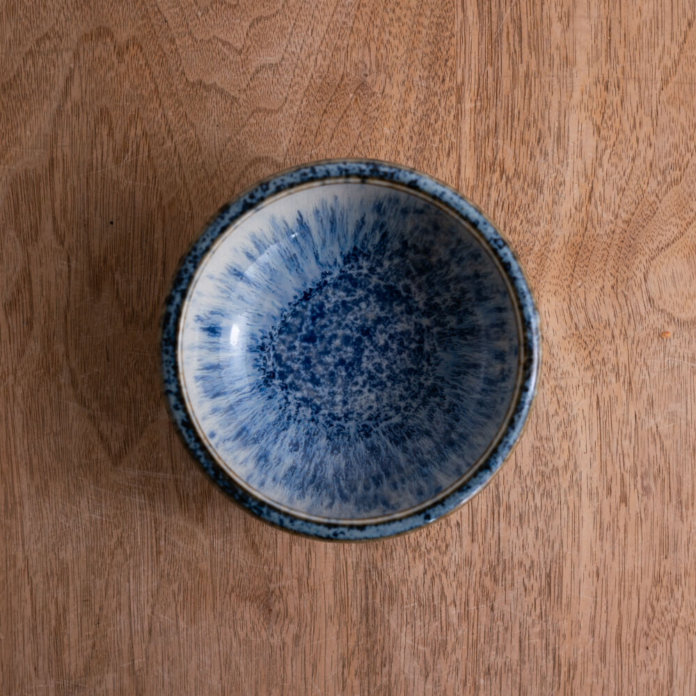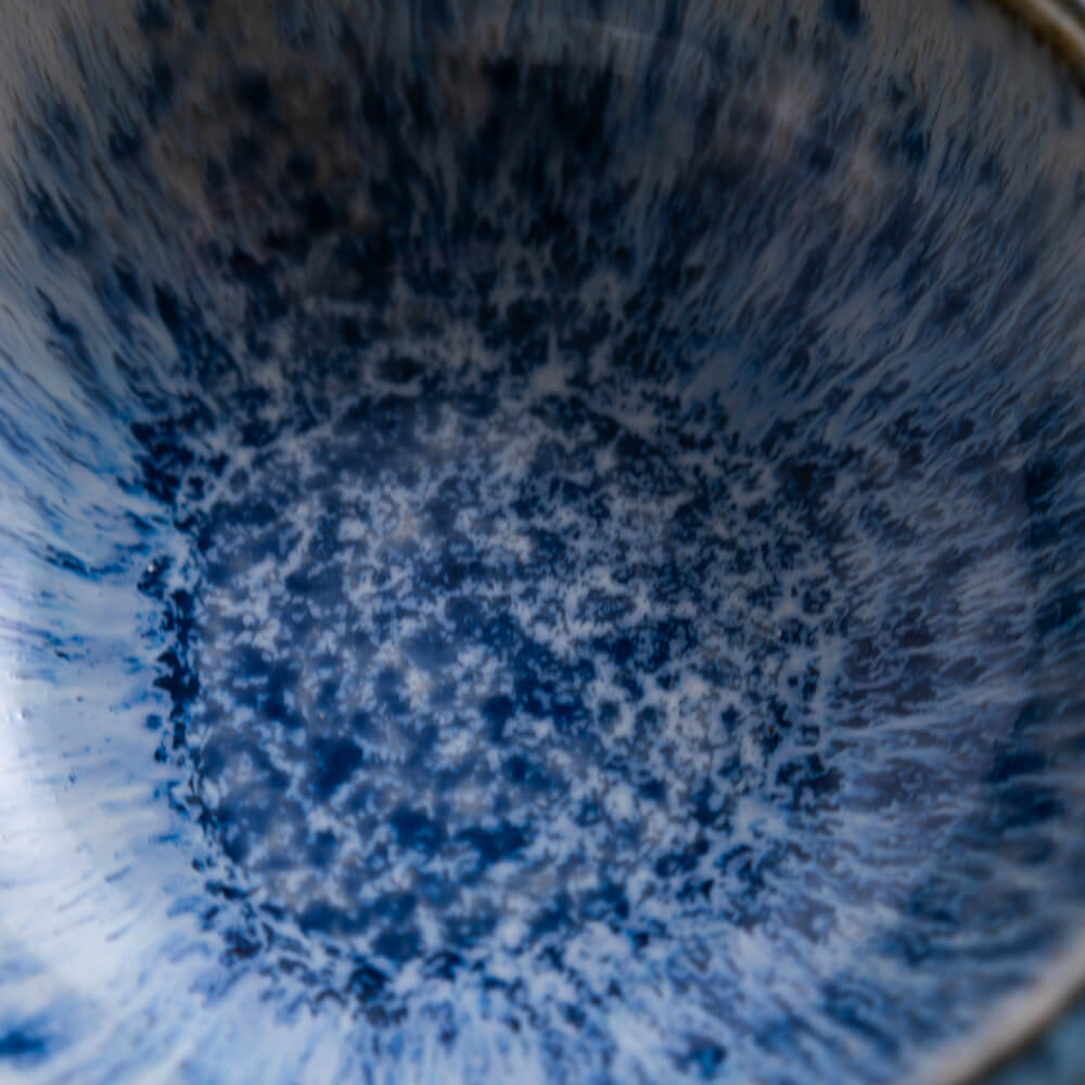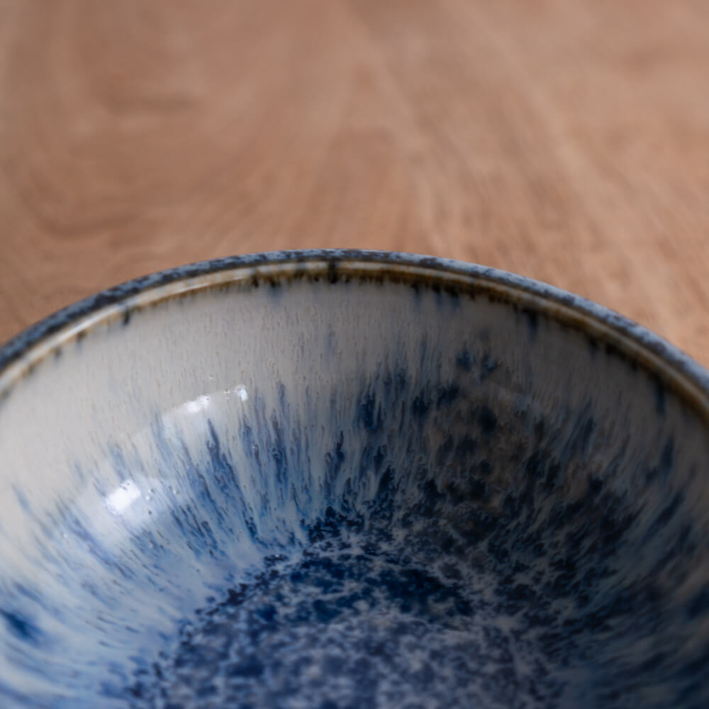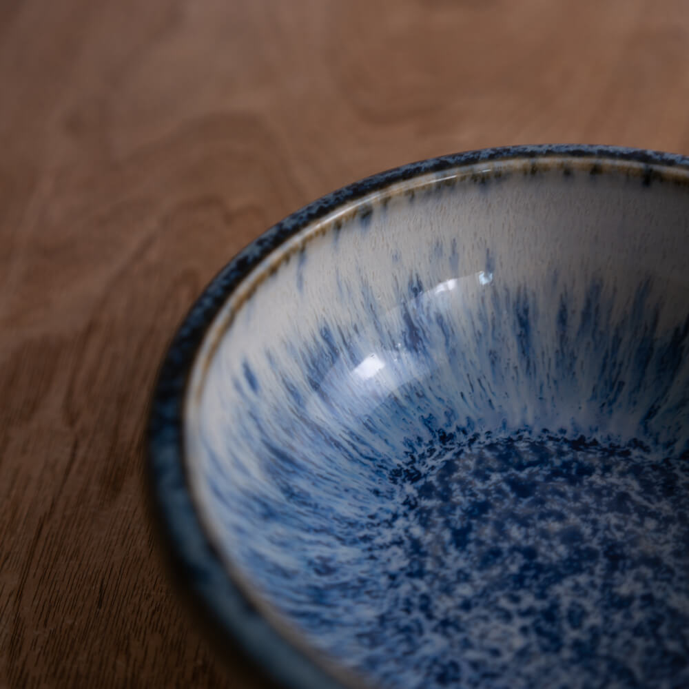内側に広がる青釉は、まるで水しぶきが弾けるように細かい結晶模様をつくり、中心へ向かうほど濃く深く。外側に向けては淡く、透明釉との重なりによって柔らかいグラデーションが生まれています。光の入り方で表情が変わり、料理を盛ったときも自然と視線を引き寄せてくれます。