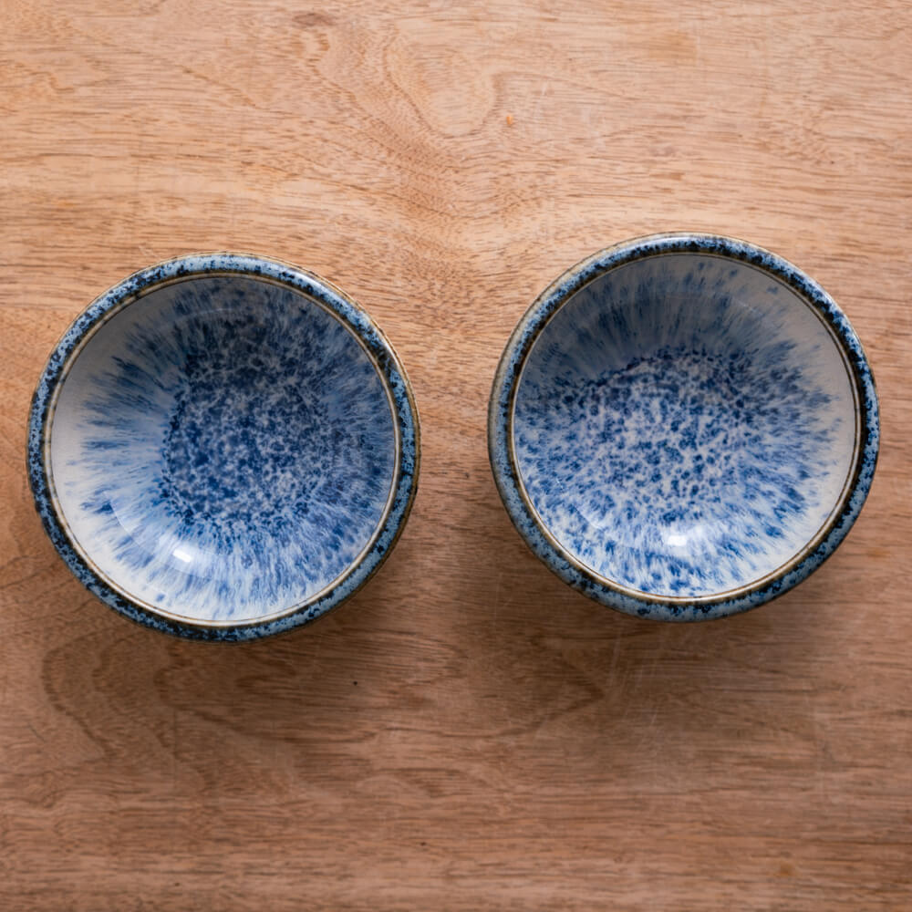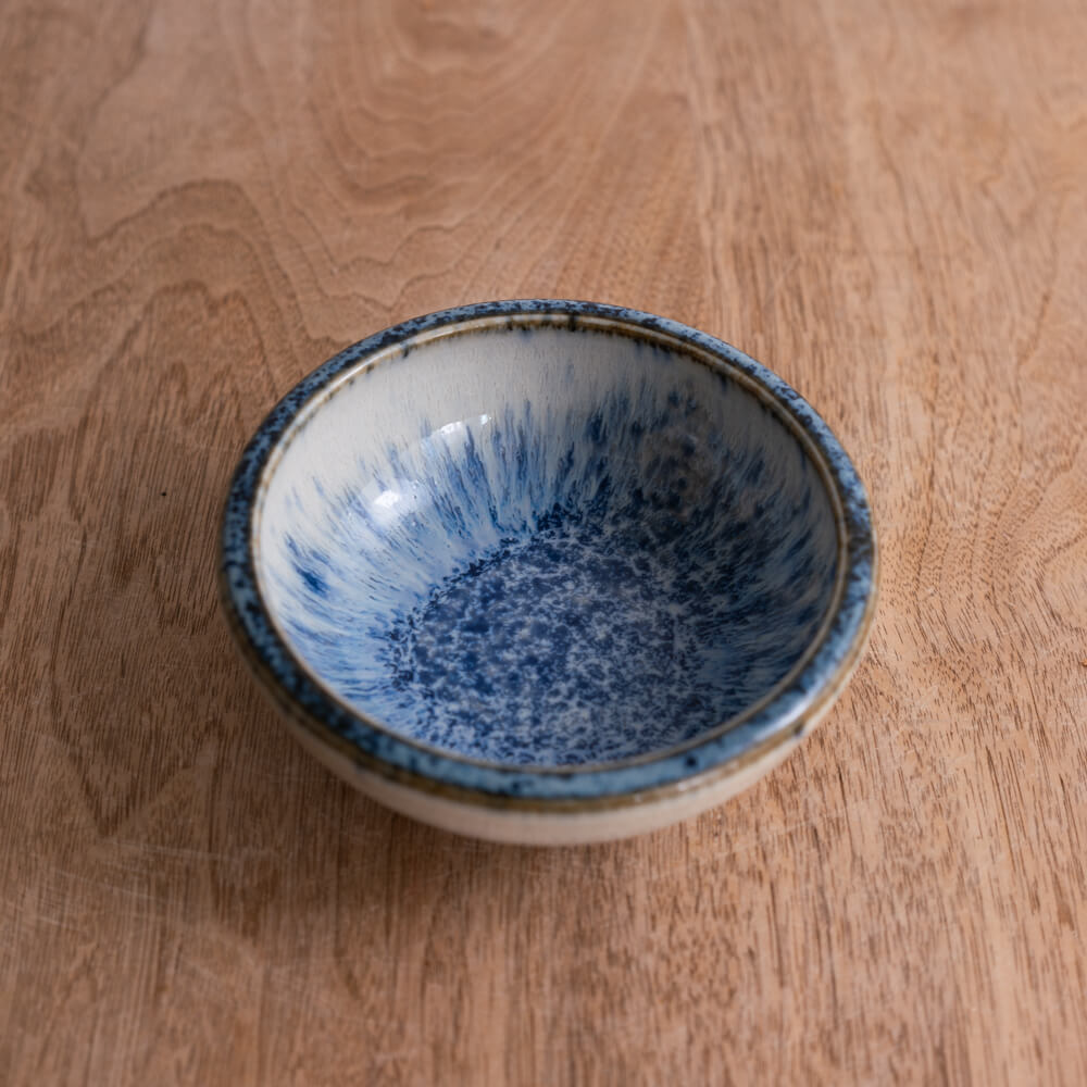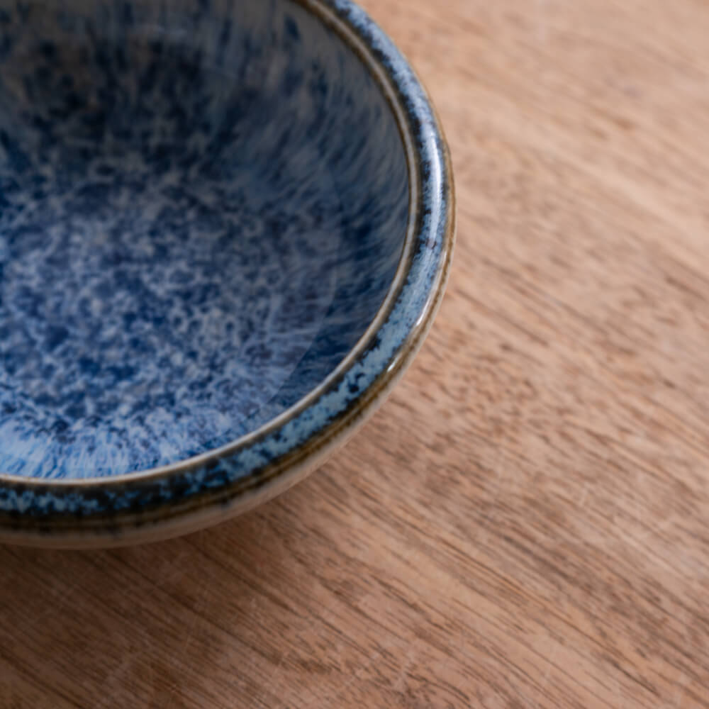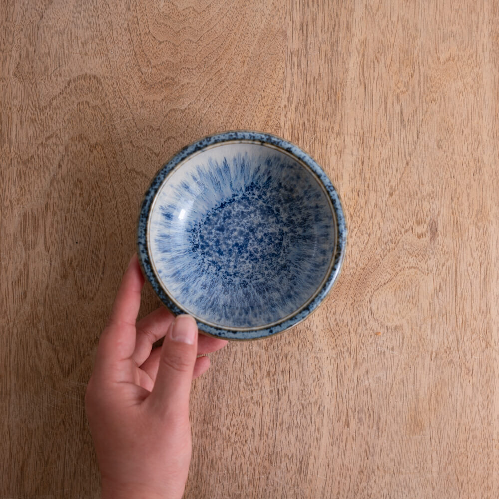 内側に広がる青釉は、まるで水しぶきが弾けるように細かい結晶模様をつくり、中心へ向かうほど濃く深く。外側に向けては淡く、透明釉との重なりによって柔らかいグラデーションが生まれています。光の入り方で表情が変わり、料理を盛ったときも自然と視線を引き寄せてくれます。