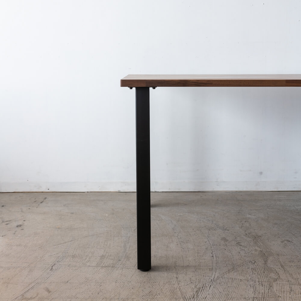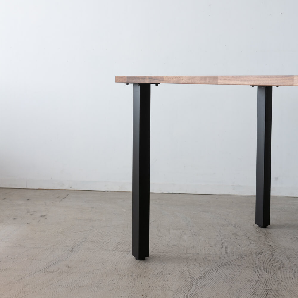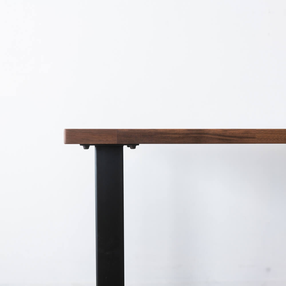 マットブラックのスチール脚は、すっきりと直線的なフォルム。重厚なウォールナット天板との対比が美しく、空間を引き締めます。