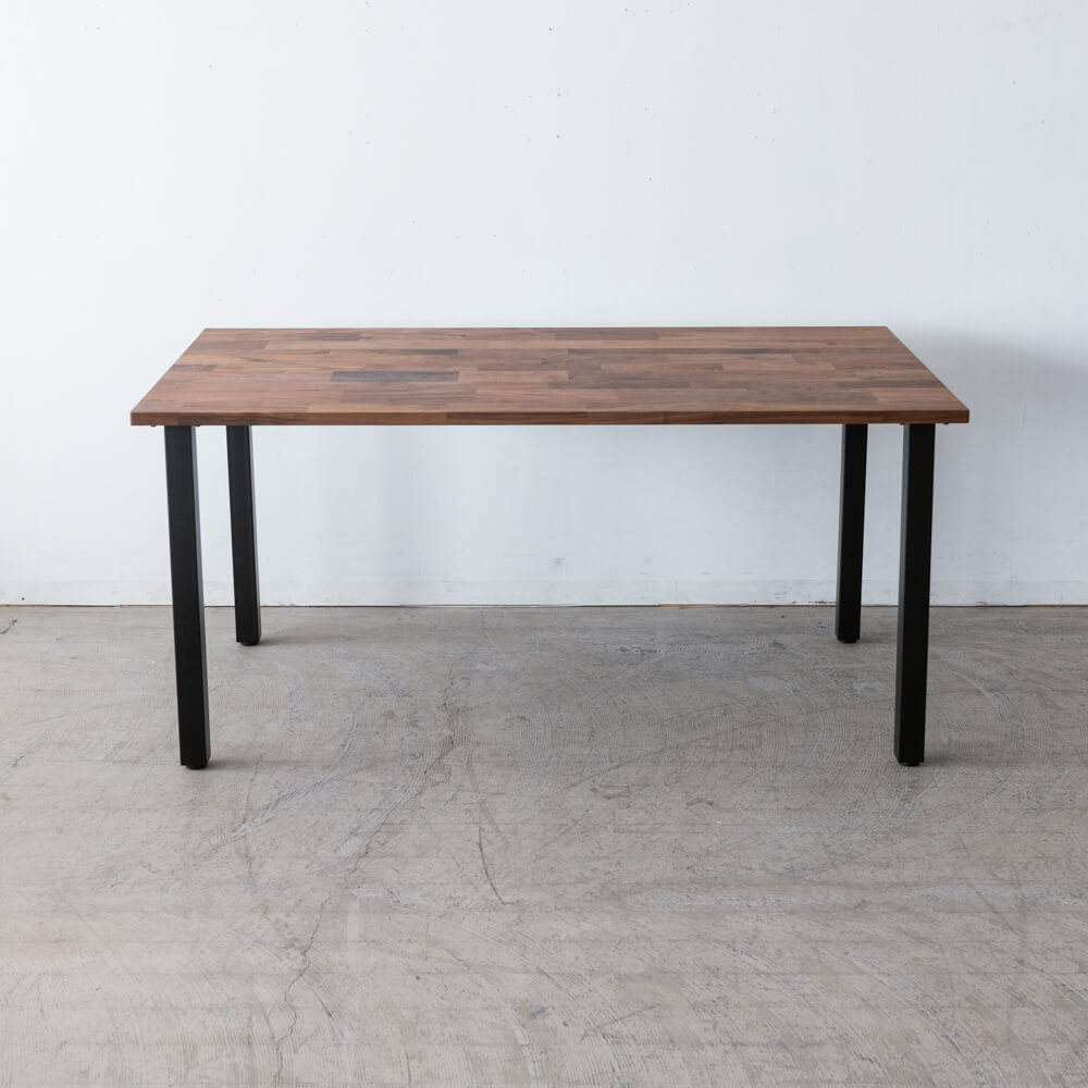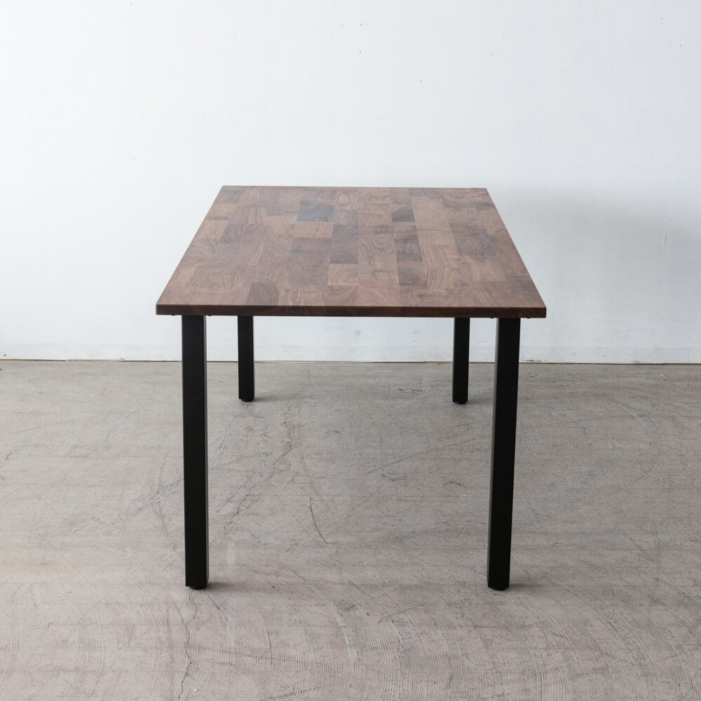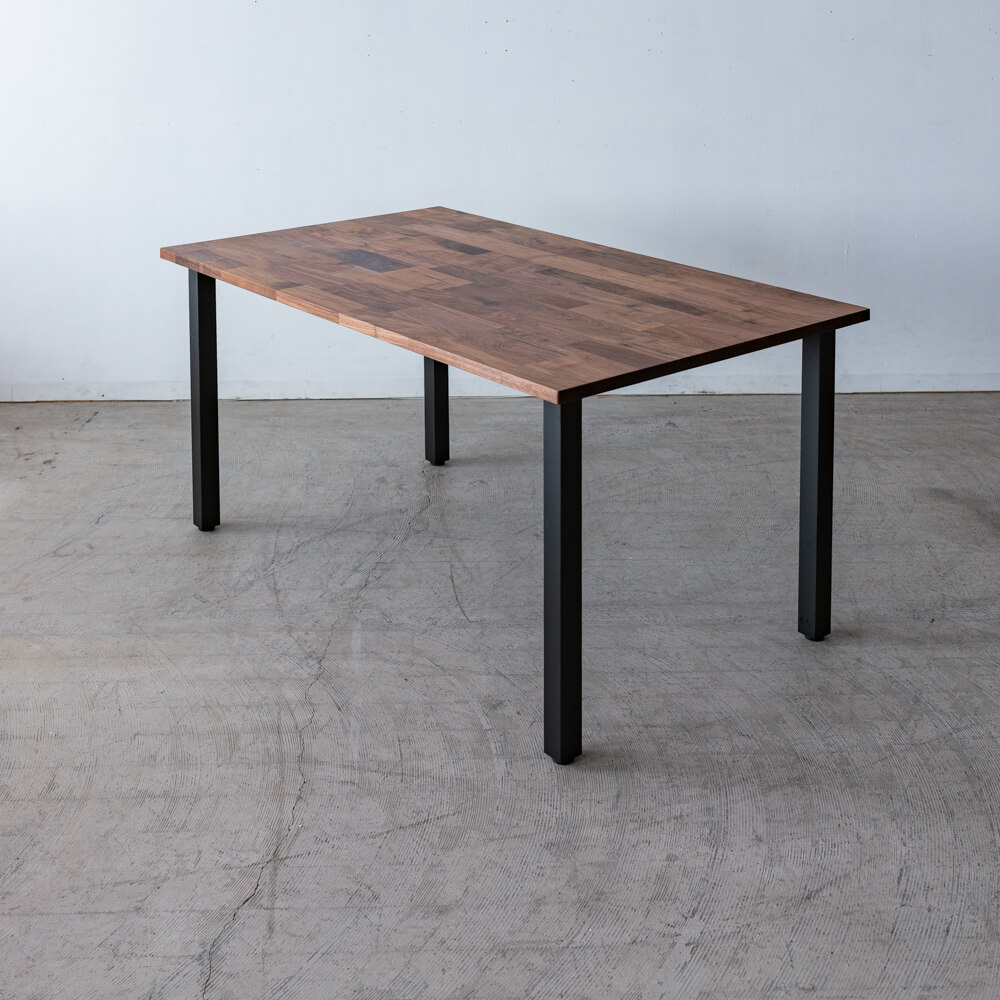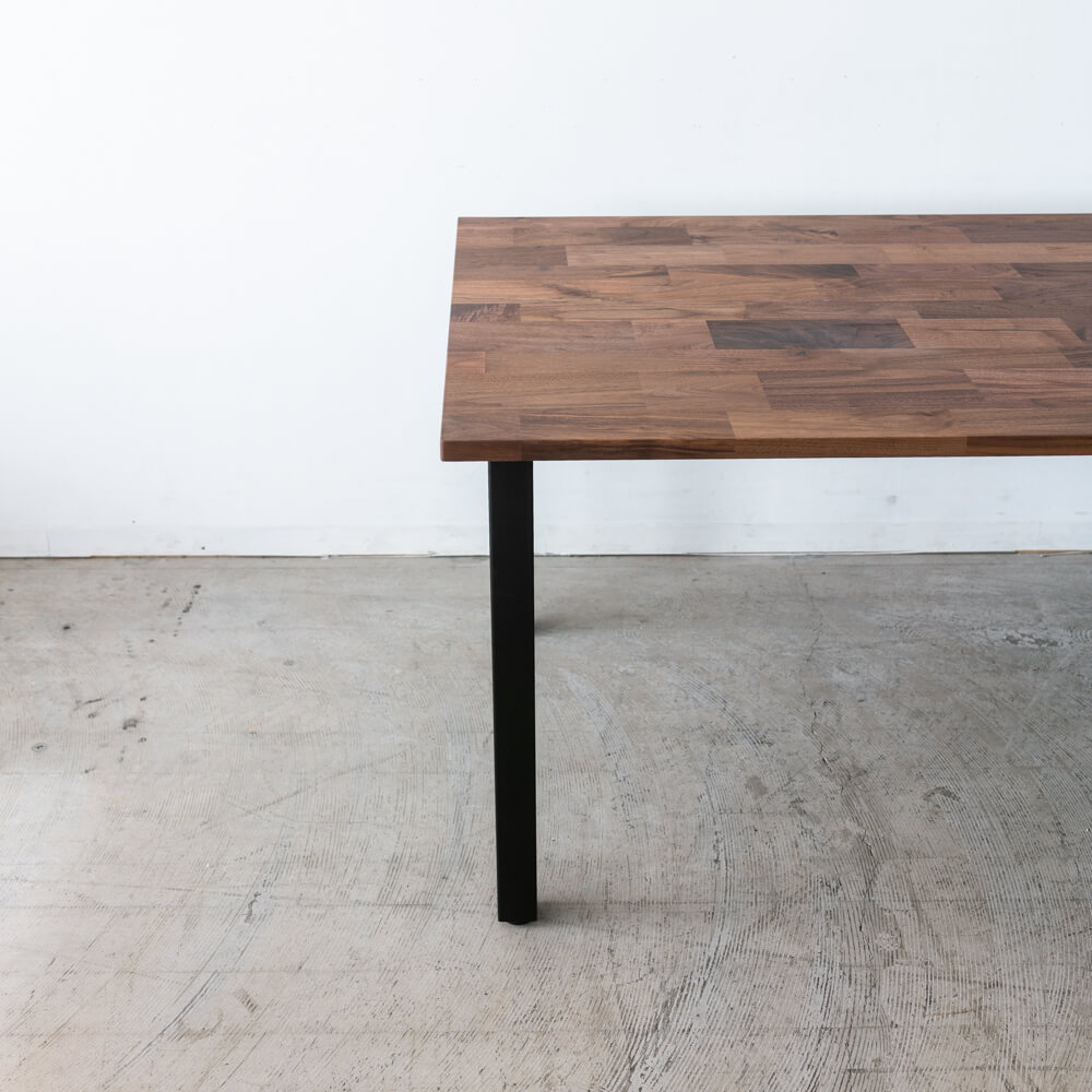 マットブラックのスチール脚は、すっきりと直線的なフォルム。重厚なウォールナット天板との対比が美しく、空間を引き締めます。