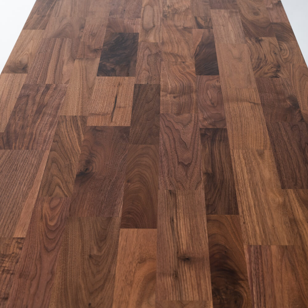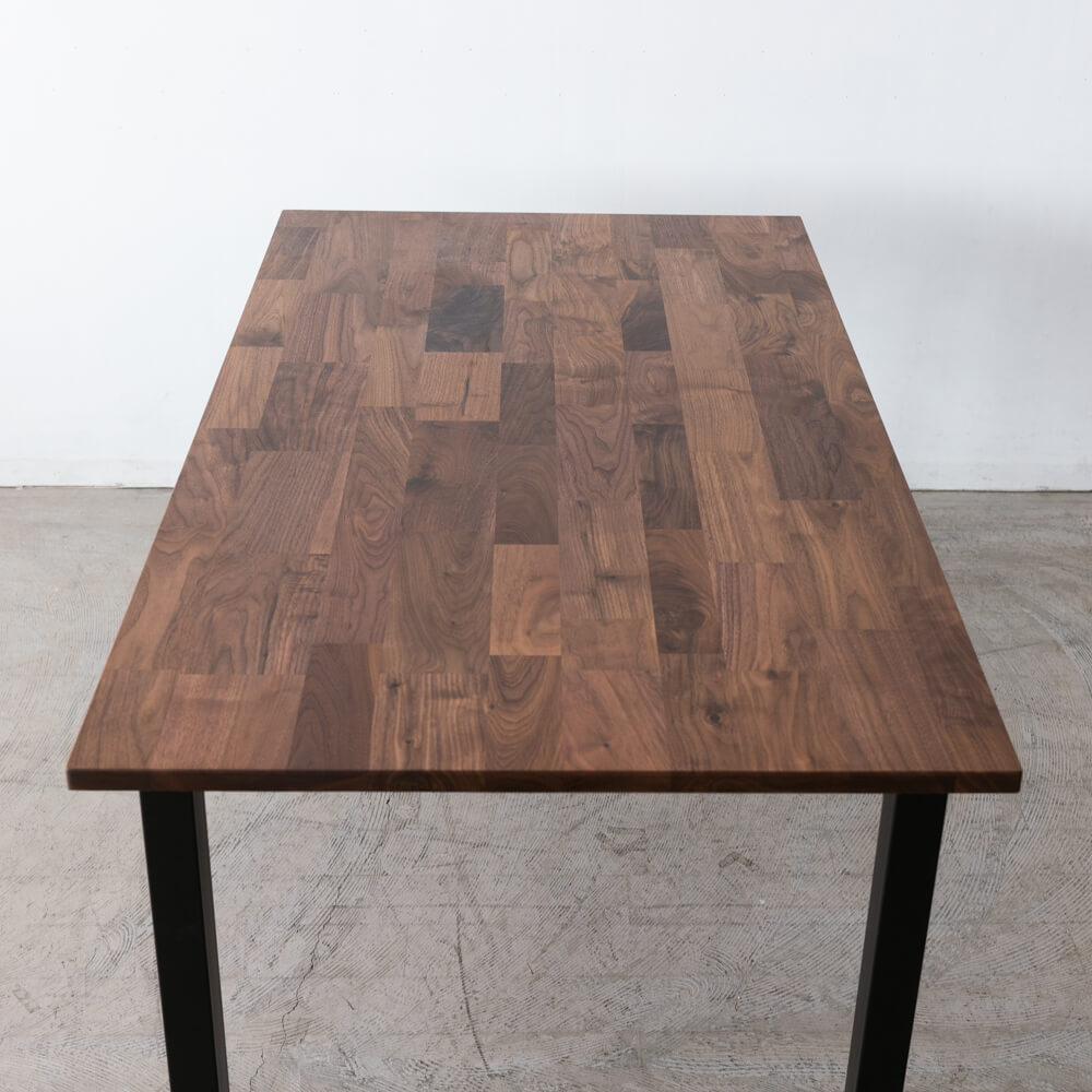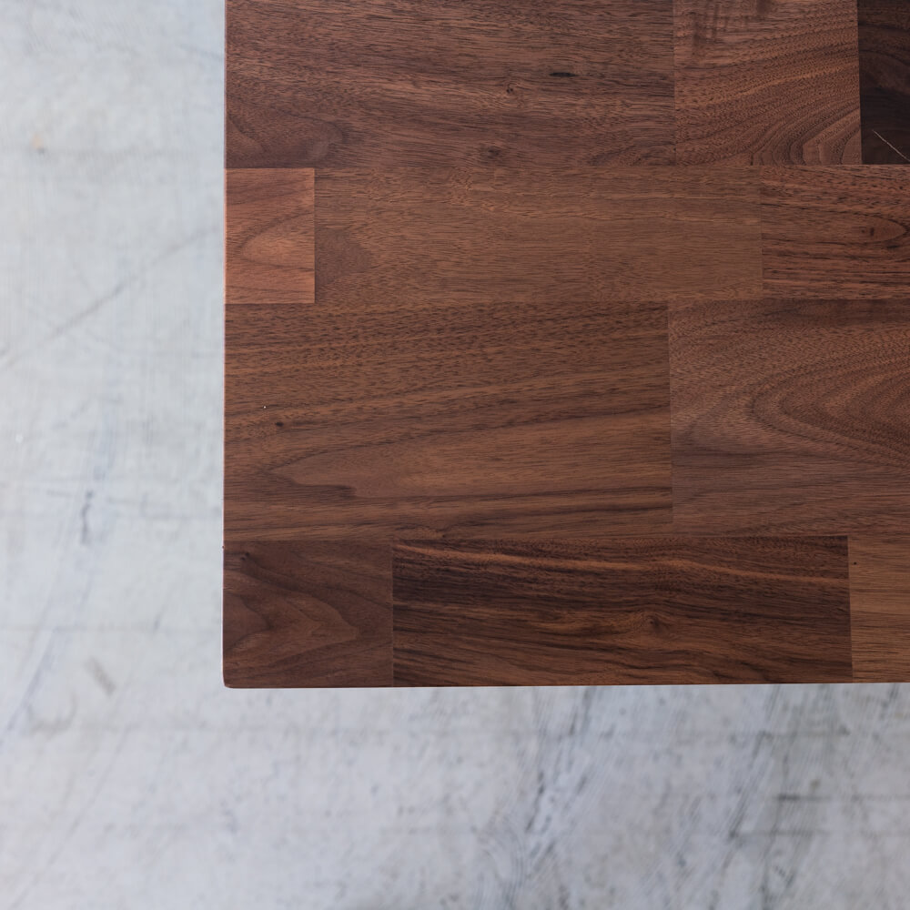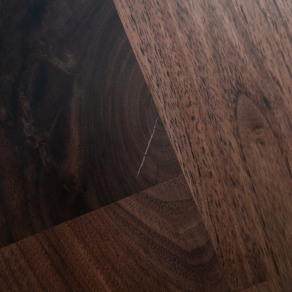 異なる色味と木目を組み合わせたモザイクハギ天板は、ウォールナット特有の深いブラウンと穏やかな木目が、ひとつのテーブルの中で美しいリズムを奏でます。光の角度や時間帯によって見え方が変わり、日々の食卓に静かな変化をもたらします。