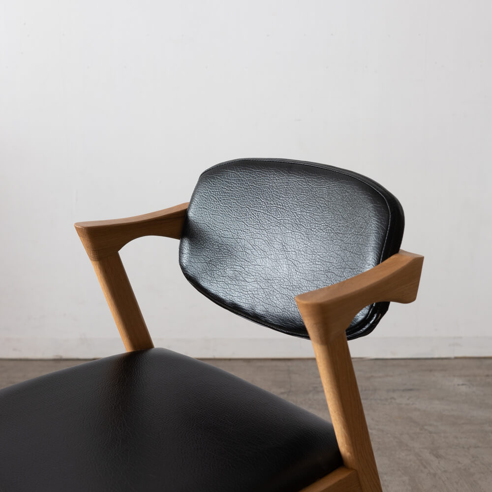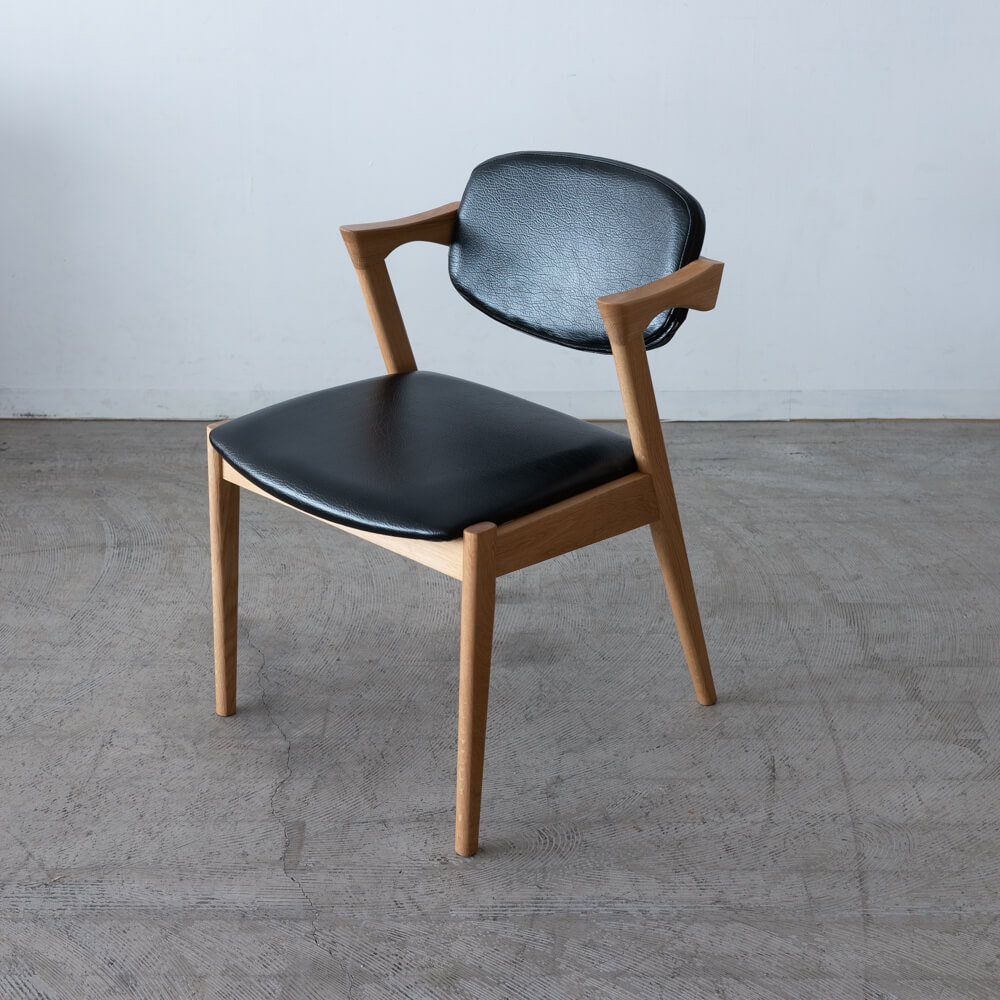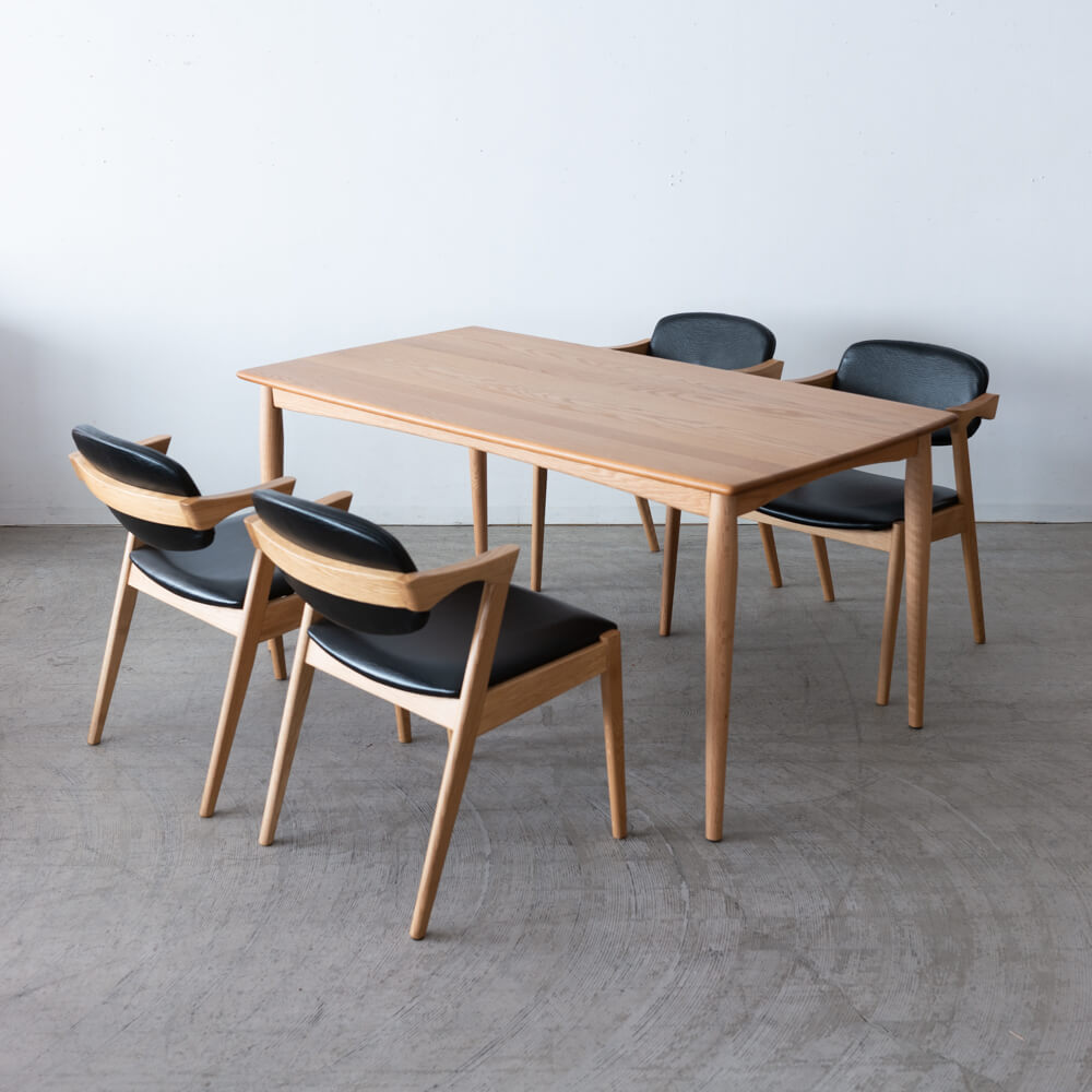 チェアはオーク材を贅沢に使用し、背板から肘木にかけて緩やかにカーブしたフォルムが特徴。背中を包み込むような安心感があり、ショートアームのため立ち座りがしやすく、空間も広く見せてくれます。