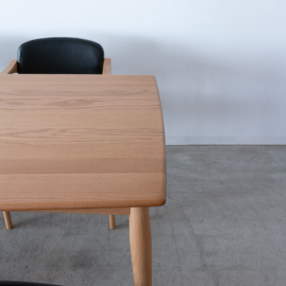 天板はカーブを描き、角・縁・幕板までも丁寧に丸く処理されています。触れたときの手当たりがやさしく、視覚的にも圧迫感のない仕上がりです。