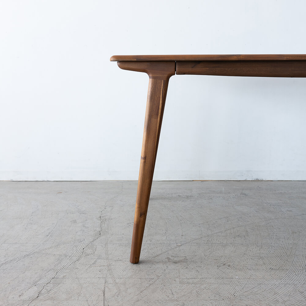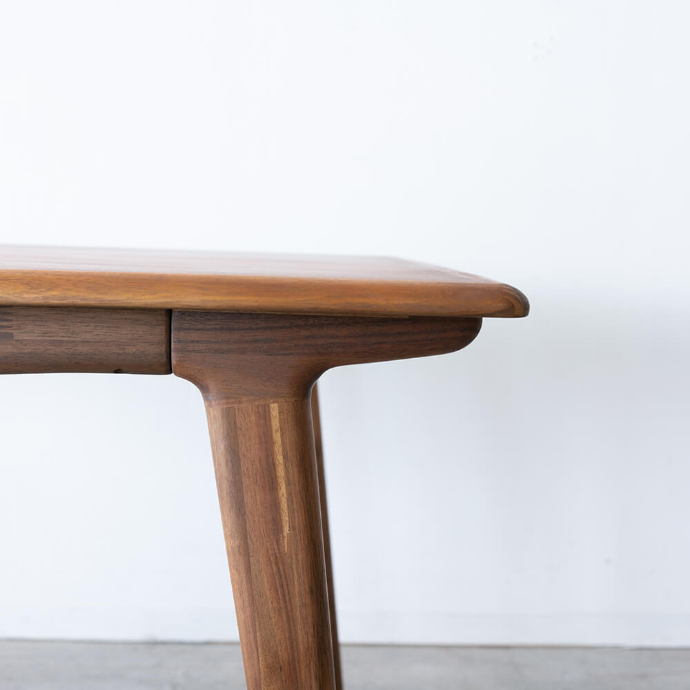 A. このテーブルは、ウォールナット突板で木目の美しさを広く活かしつつ、脚部にはアカシア無垢材を採用しています。見た目の上質さと強度を両立させているので、デザインも使いやすさもどちらも叶えてくれるんです。