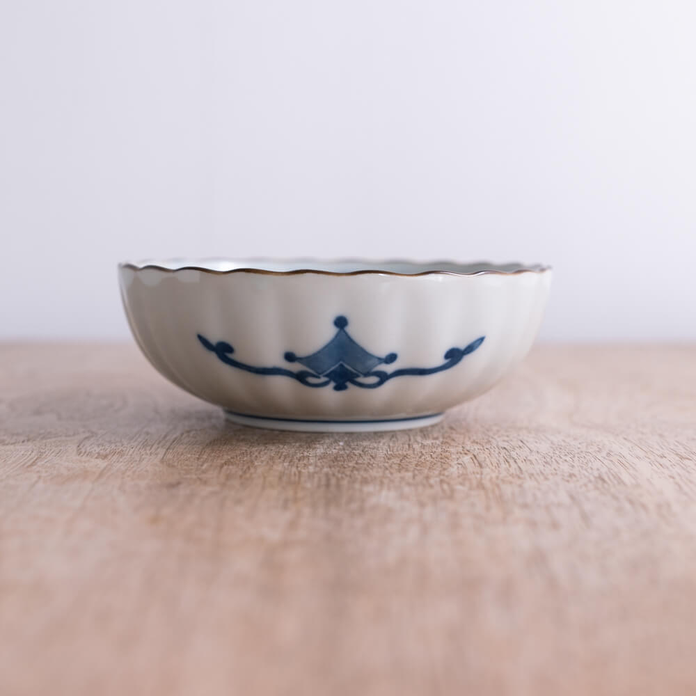やわらかな白磁に、端正な麻の葉文様を染め上げた小鉢です。縁は菊の花びらのように立ち上がり、手に取るたびに上品な陰影が生まれます。副菜や取り鉢として使いやすい4.5寸サイズで、日常の和食をすっと美しく整えてくれる器です。