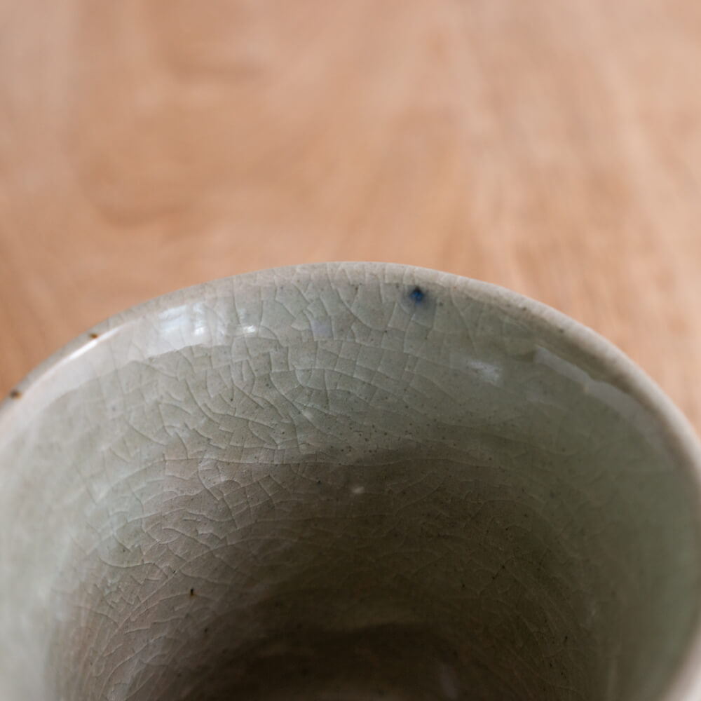 釉薬の中で細かな貫入がふわっと広がり、光の角度によって柔らかく表情が変わります。透明感のある部分、釉がたまって濃く見える部分、素地の色がのぞく部分が混ざり合い、一つひとつの器に“育つような美しさ”を感じさせます。