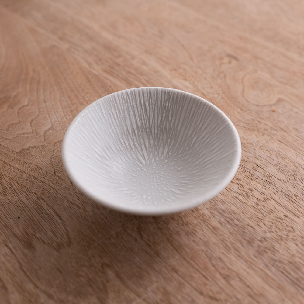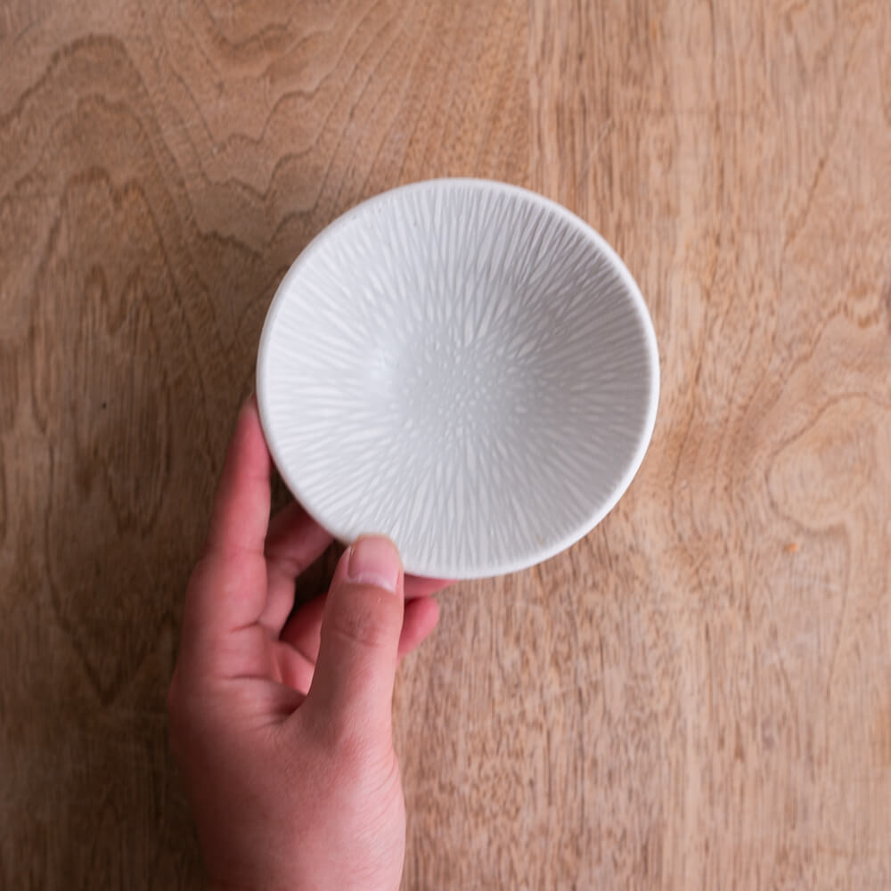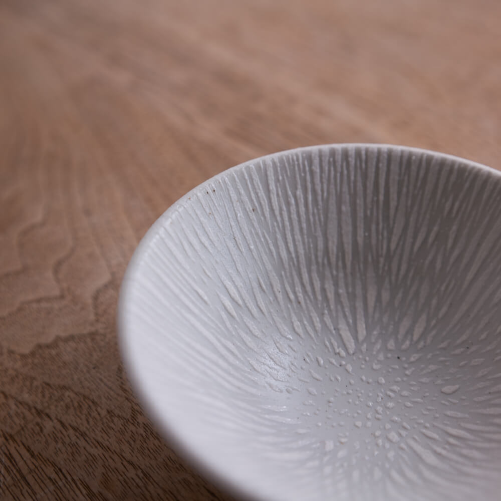 内側に放射状に広がる線文様は、光の角度で表情を変え、白い器に立体感をプラスします。きゅうりの浅漬け、ほうれん草のおひたし、煮物の取り鉢など、和食の色味がくっきり映え、食卓に上品なアクセントを添えます。