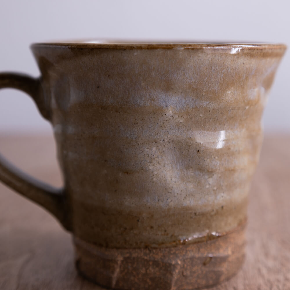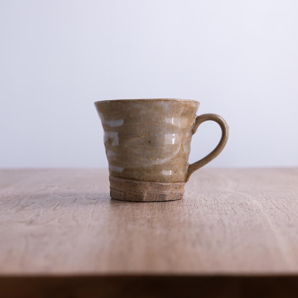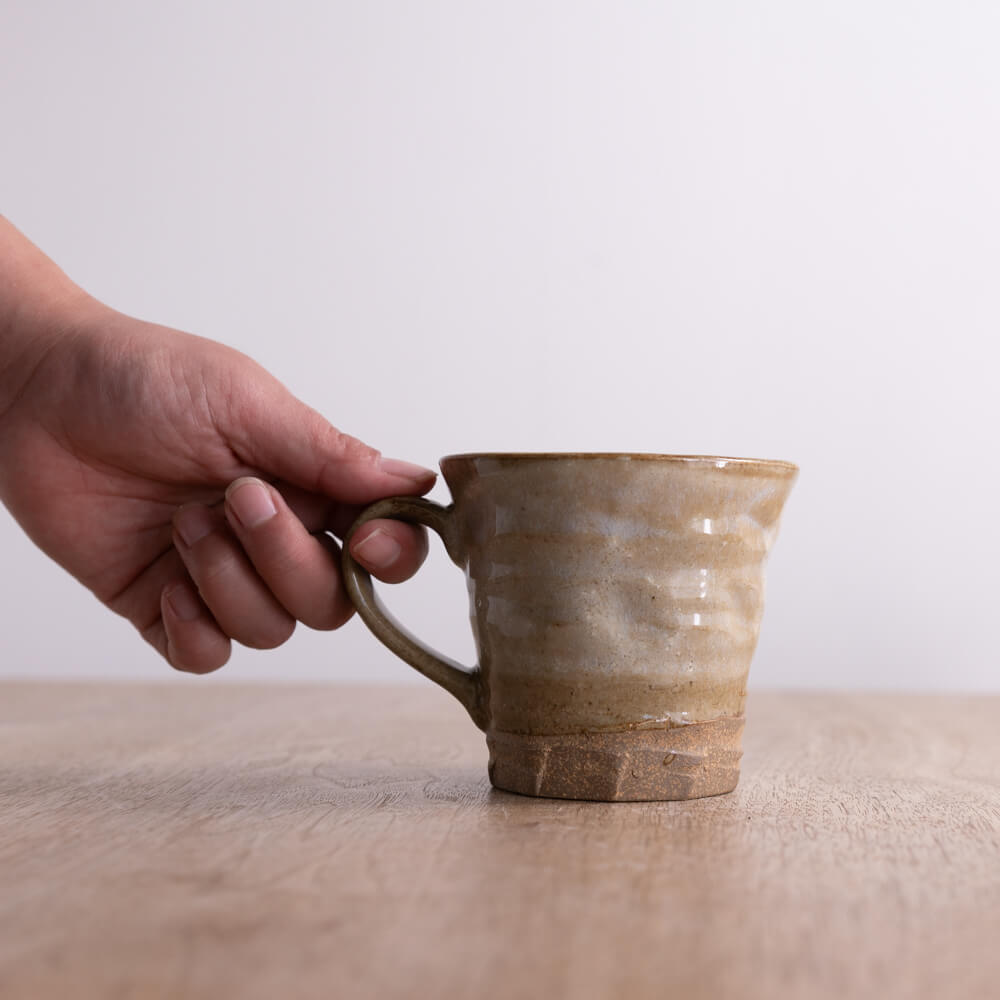 手で包むと、しっとりと馴染む粉引の質感。ろくろで引いたままの柔らかなラインと、手捻りならではのゆらぎが生む心地よいフォルム。淡い生成り色の中にふわりと現れる濃淡は、どんな飲みものにもそっと寄り添います。和食器のあたたかさを、毎日の一杯で感じられるマグです。
