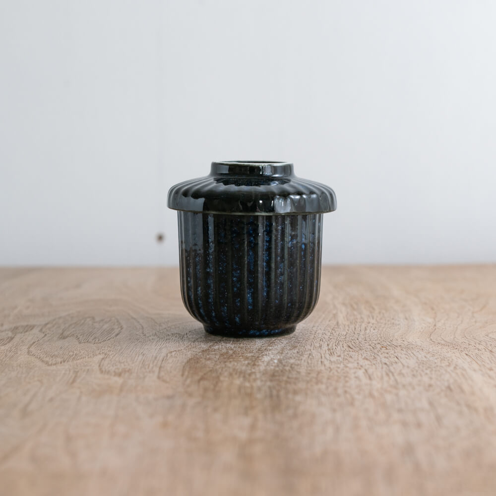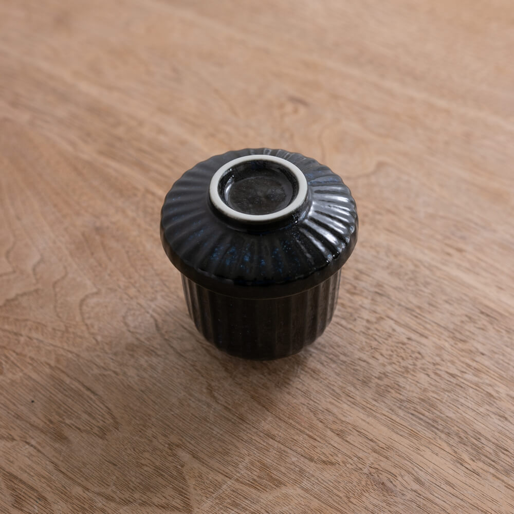 深い紺の釉薬に、星のような青い斑点が静かに浮かぶむし碗。窯変ならではの表情がひとつずつ異なり、手に取るたび“同じものがない喜び”を感じられる器です。縦に刻まれた凹凸が光を柔らかく受け止め、食卓の照明の下で上品に陰影をつくります。和食の場面はもちろん、普段の汁物や小鉢としても活躍する、使い勝手の良いサイズ感です。