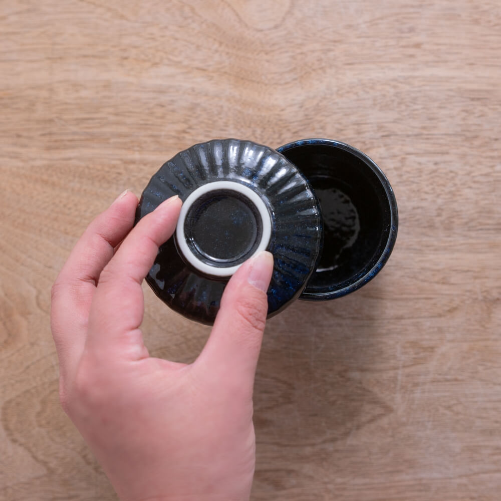 見る角度や光の強さで印象が変わる釉薬。黒に近い紺の中に、青い星屑のような窯変斑が浮かび、静かな奥行きを生み出しています。うつわを回すだけで表情が変わるので、手に取る瞬間から楽しめる表情です。