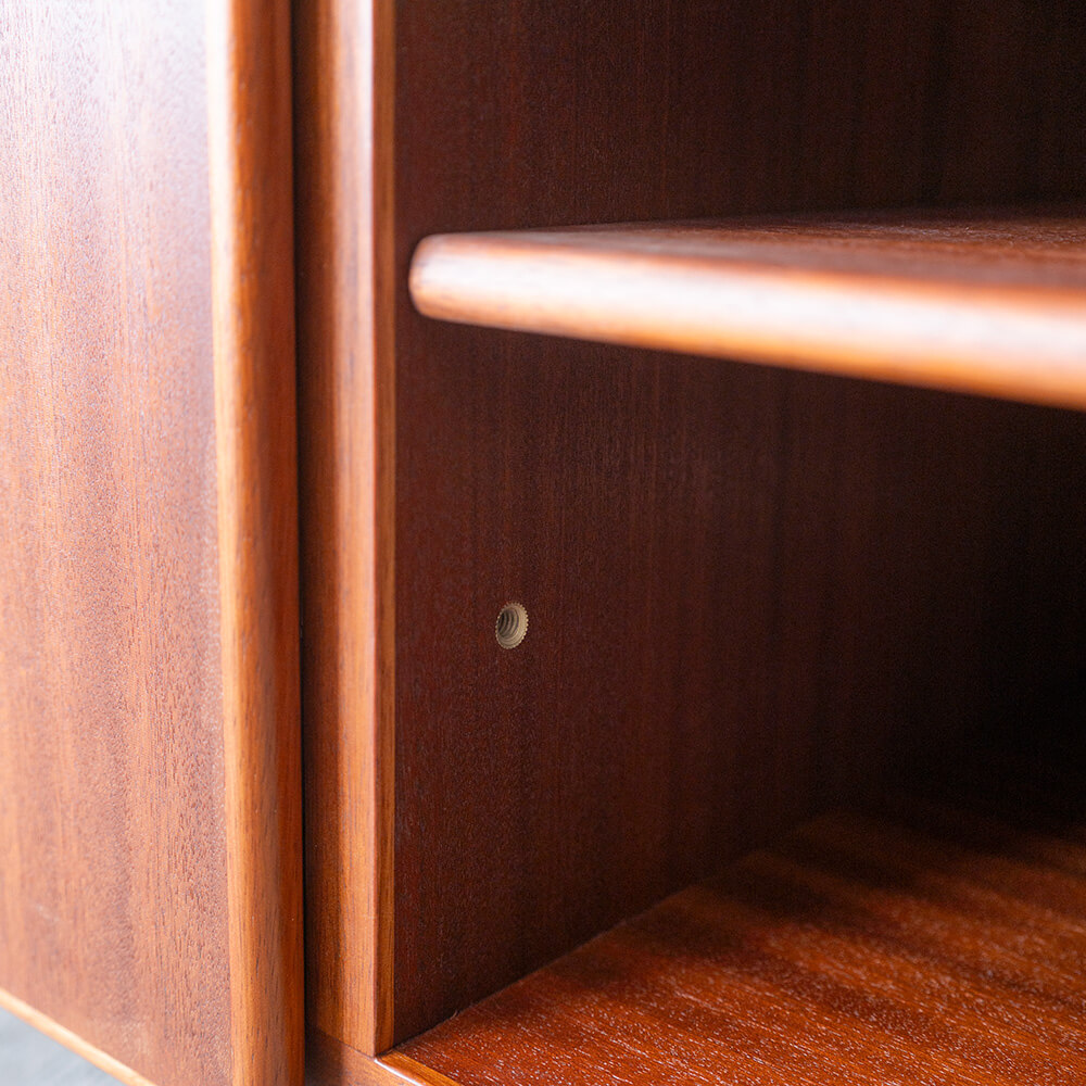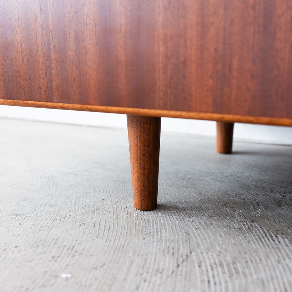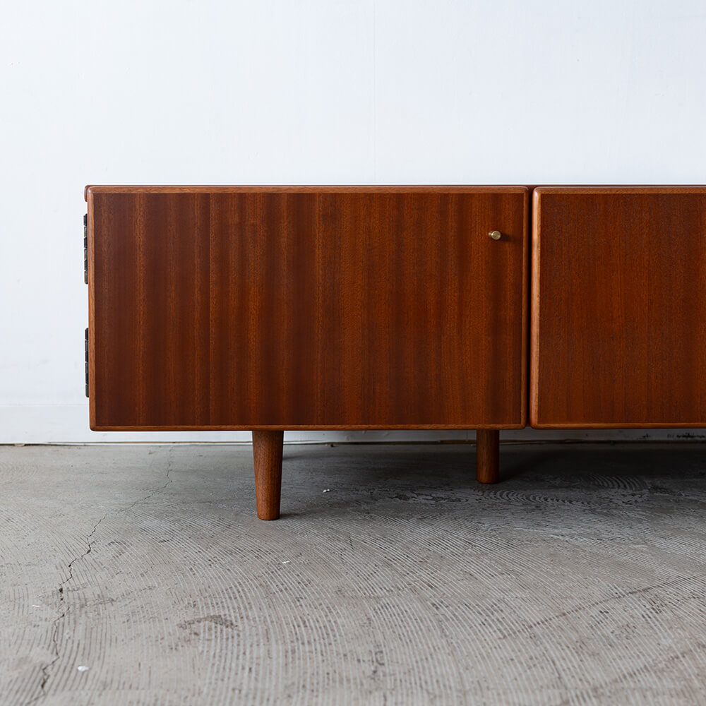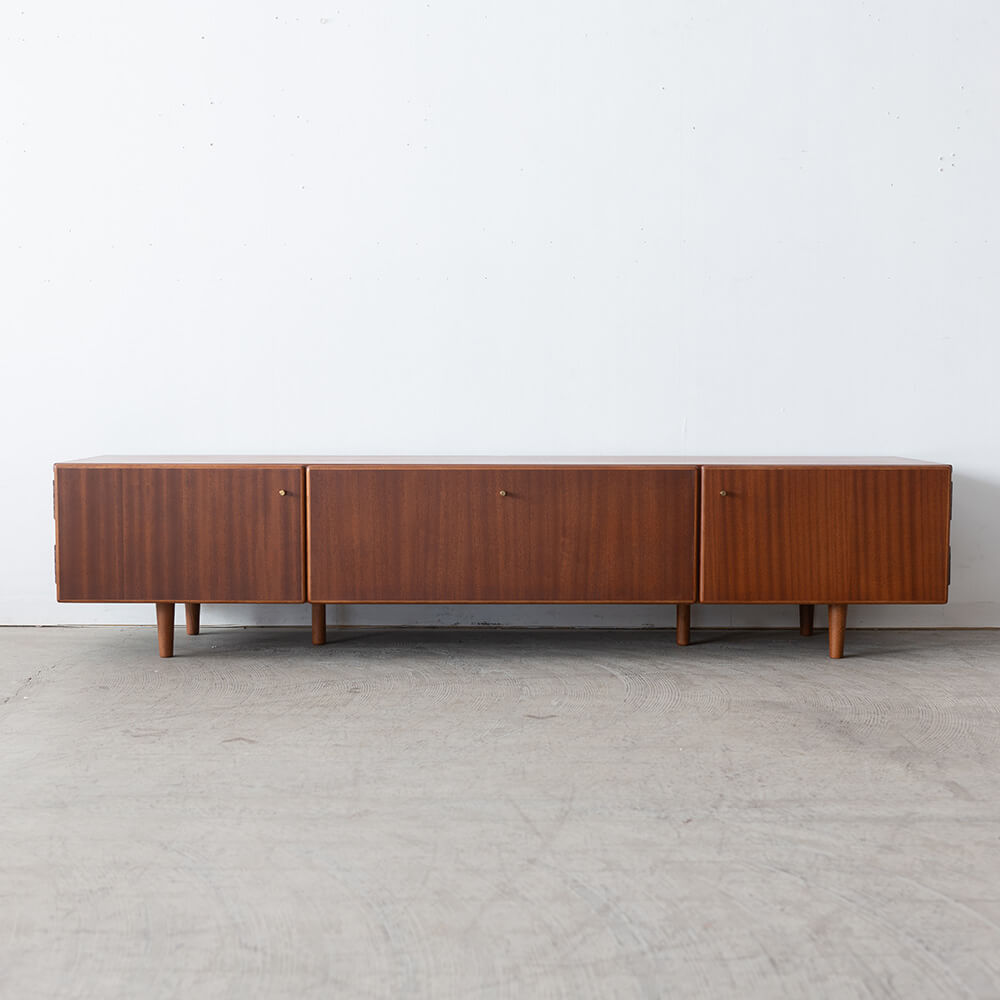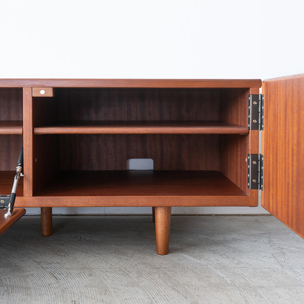 コクのある赤褐色と、マホガニー材特有のまろやかな艶。《Tid ローボード1800》は、直線的で無駄のないフォルムに、真鍮の取手をそっと添えた凛としたデザインが魅力のローボードです。扉越しでもリモコン操作ができ、テレビ周りの家電類をすっきり隠せる機能性も備えています。廃盤につき今ある在庫限り。木製ローボードを特別価格で迎えられる、数少ない機会です。