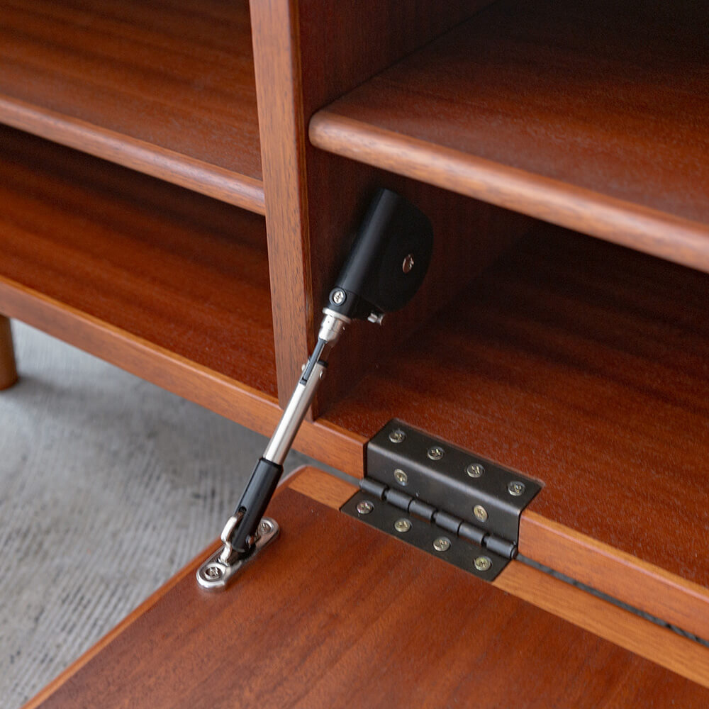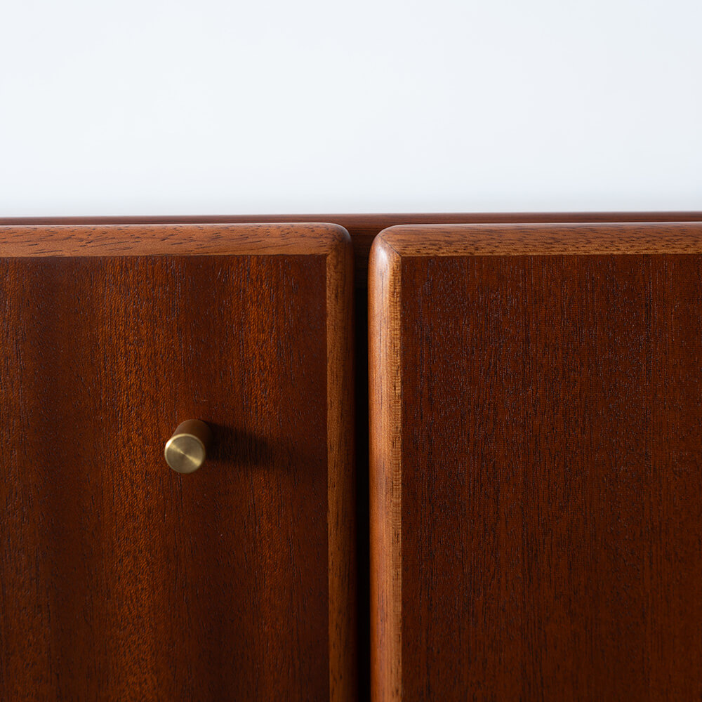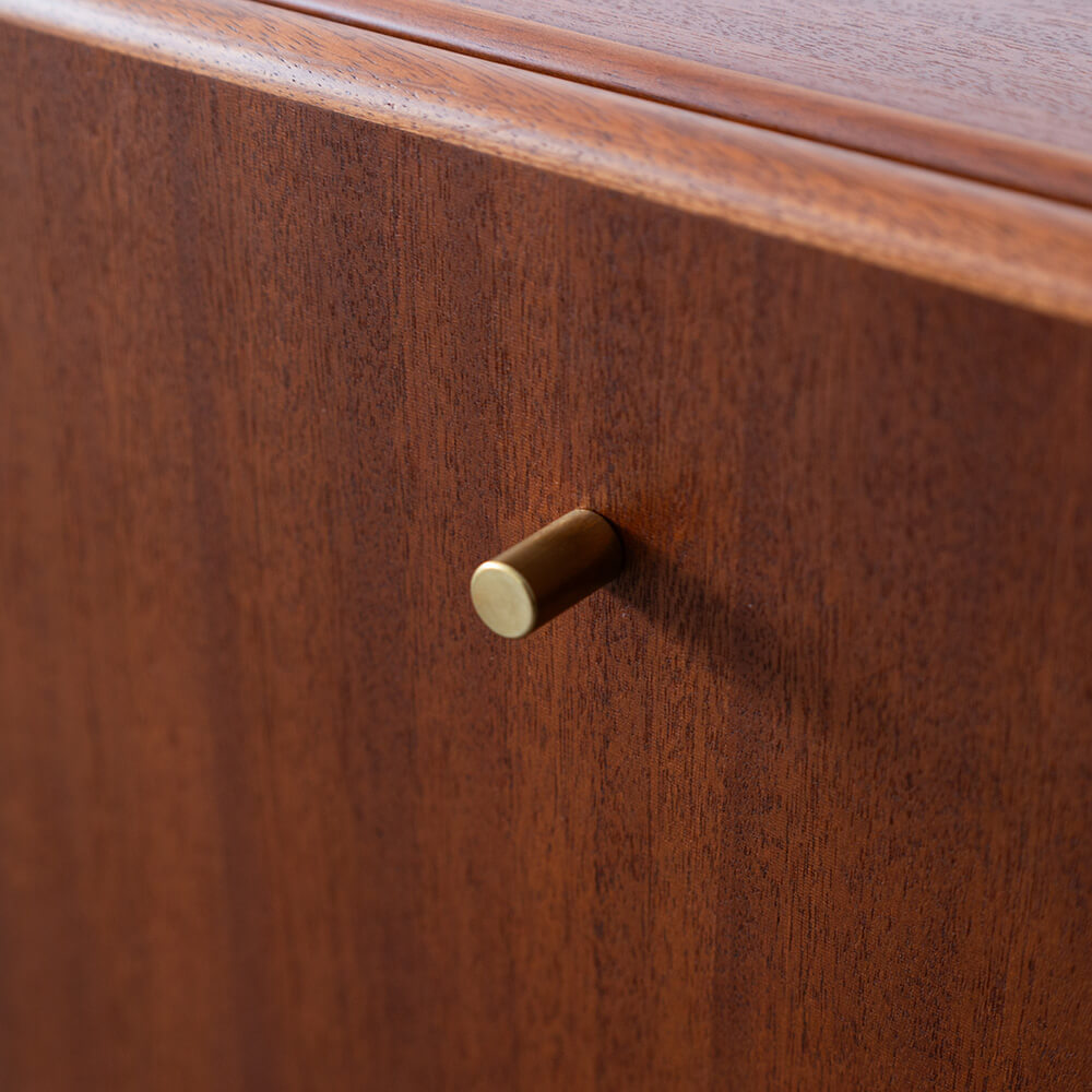 面の構成がすっきりと美しく、取手の真鍮が控えめに輝きます。木目とのコントラストがさりげなく上質。ミッドセンチュリーから北欧、和モダンまで、幅広い空間に調和します。