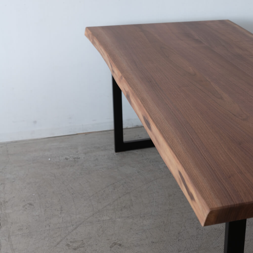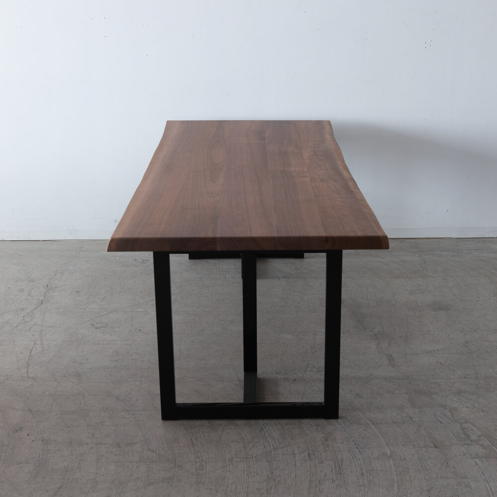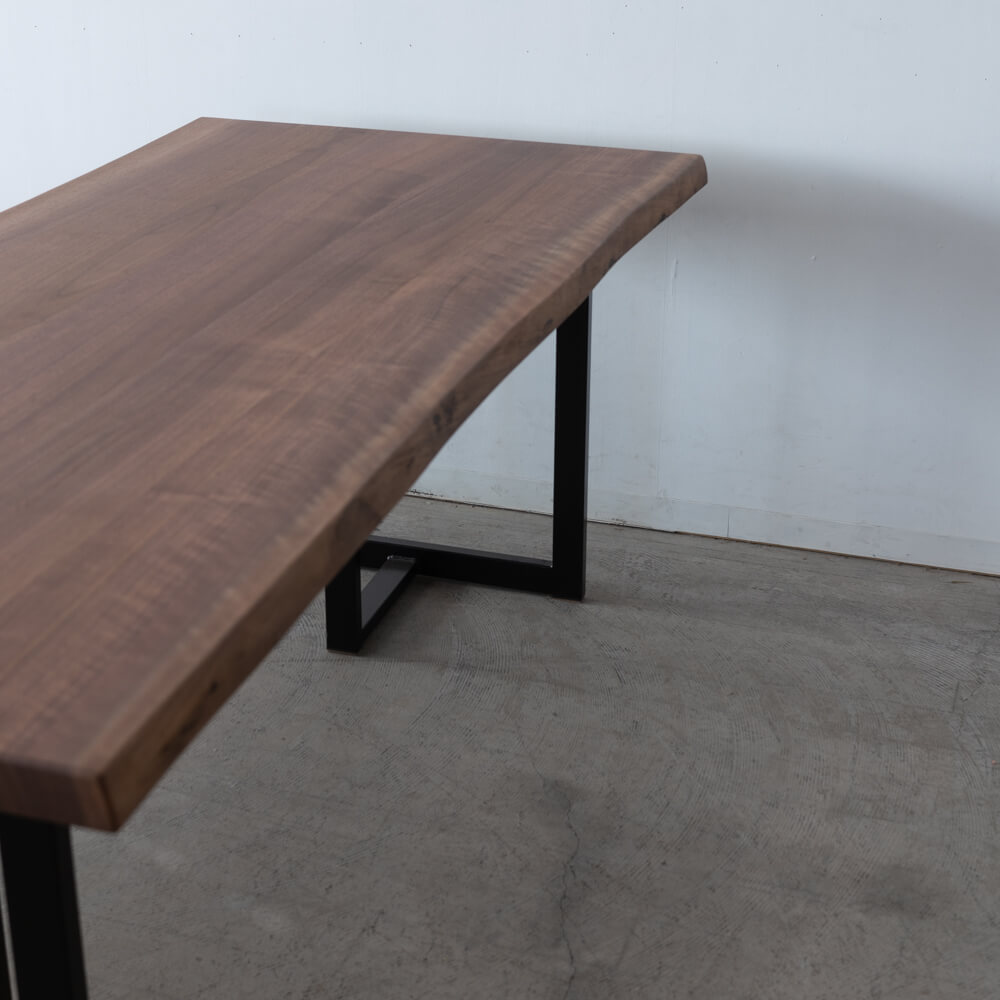 まっすぐすぎない、自然の曲線。ブラックウォールナット特有の奥行きあるブラウンと、耳付きのなめらかな稜線が印象的なダイニングテーブルです。直線的なスチール脚との相性も良く、モダンにもナチュラルにも寄りすぎない絶妙なバランスに仕上がっています。現品限りの特別価格です。
