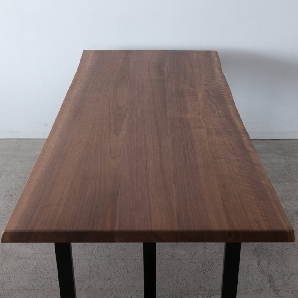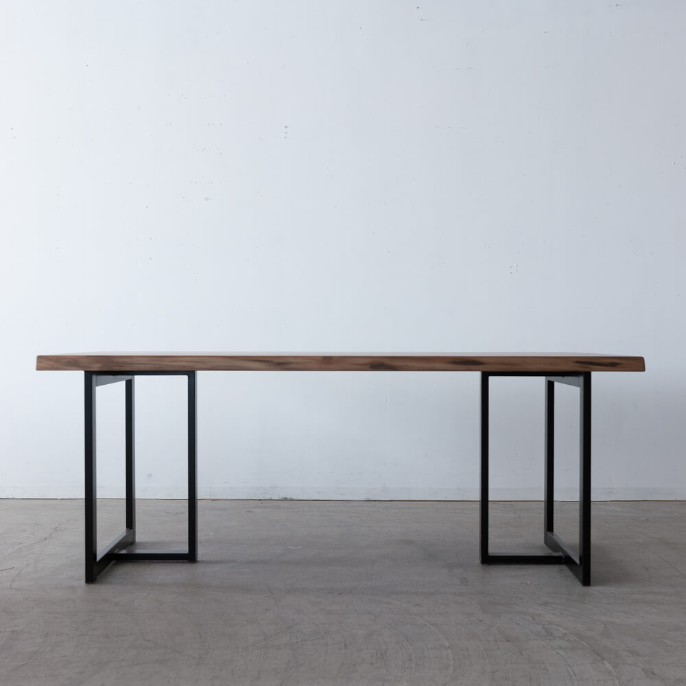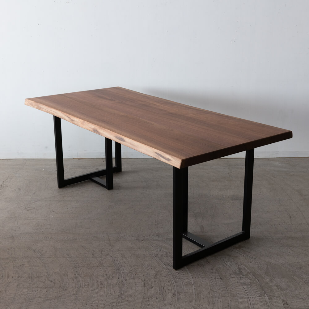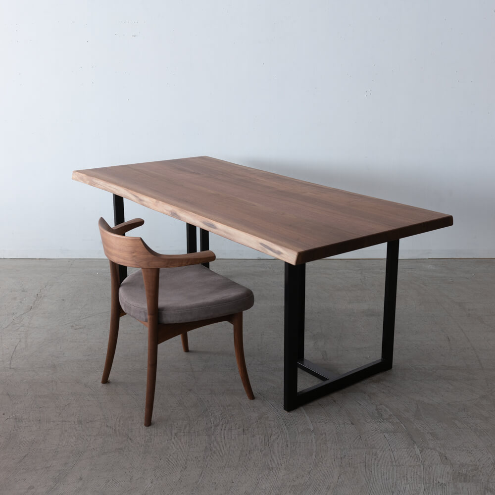 まっすぐすぎない、自然の曲線。ブラックウォールナット特有の奥行きあるブラウンと、耳付きのなめらかな稜線が印象的なダイニングテーブルです。直線的なスチール脚との相性も良く、モダンにもナチュラルにも寄りすぎない絶妙なバランスに仕上がっています。現品限りの特別価格です。