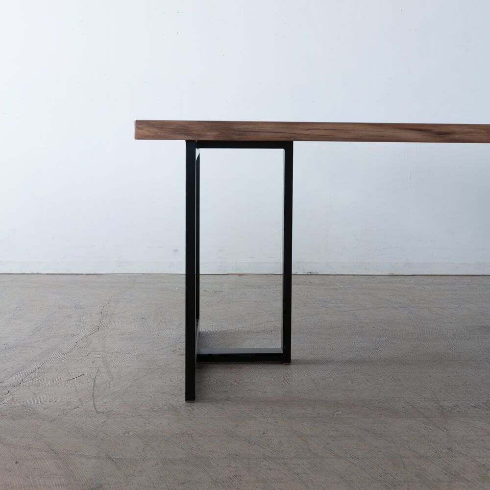 脚部はマットなブラック粉体塗装。直線的なラインが木のやわらかさと好対照で、全体を引き締めつつ空間に軽やかさをもたらします。脚間W600mm・D300mmのバランスはチェアの収まりも良く、ダイニングでもワークスペースでも活躍します。