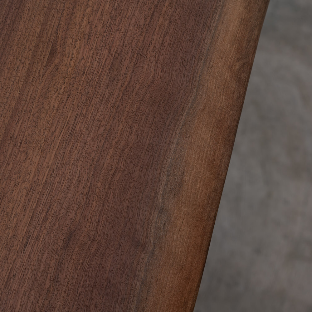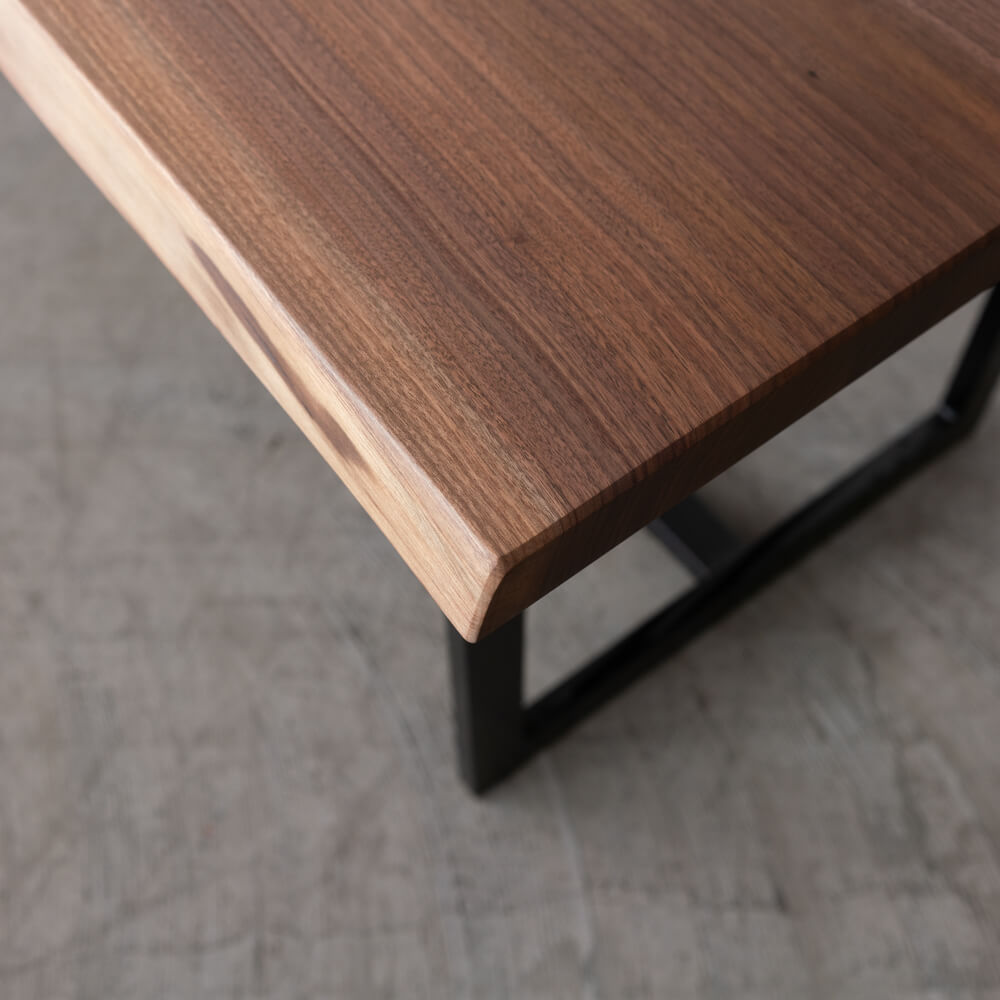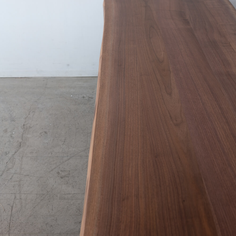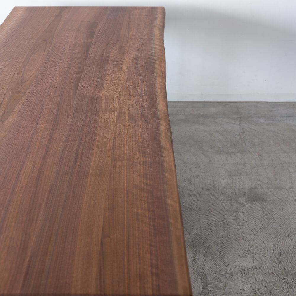 ブラックウォールナット無垢板の魅力のひとつが“耳付き”のライン。木が元々持つ外皮近くの揺らぎを残しており、光の当たり方で縁の陰影がやわらかく変わります。削りすぎず自然な輪郭を活かすことで、無垢材ならではの素材感がより引き立つ仕上がりです。
