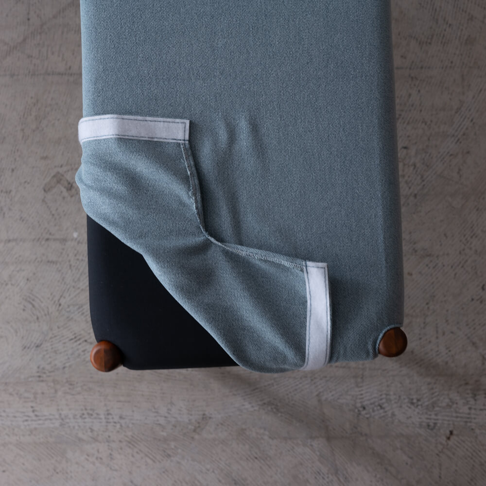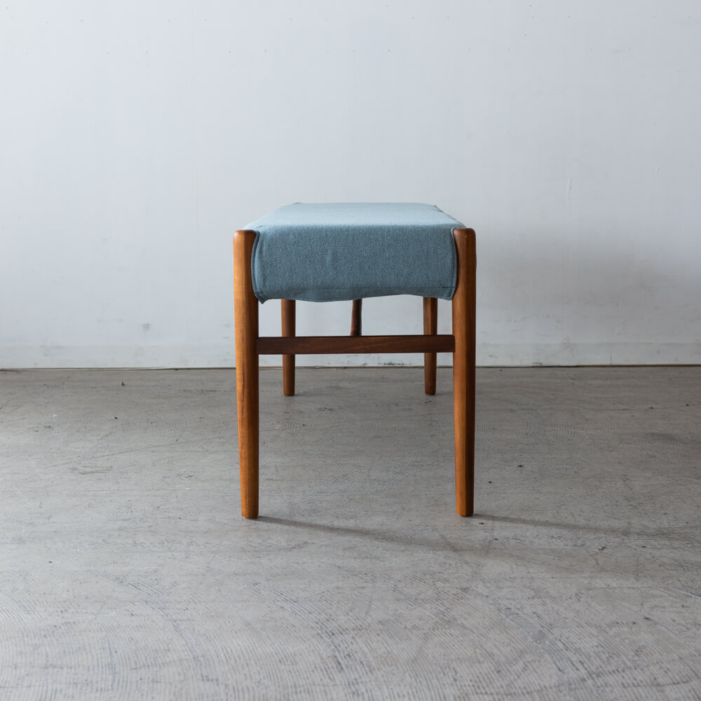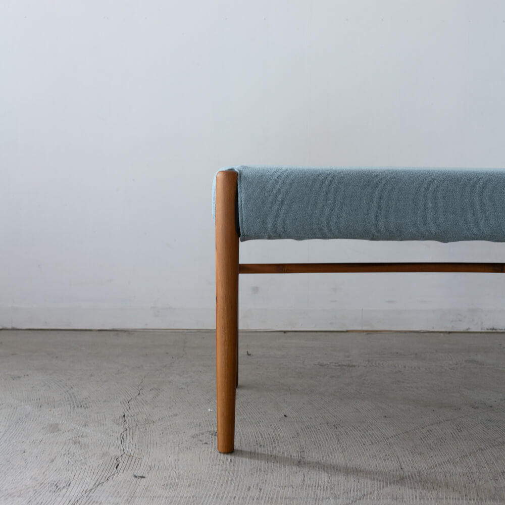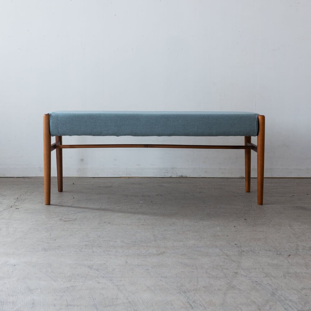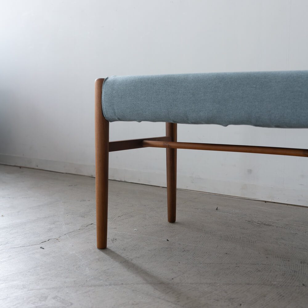 このベンチに使われているのは くすみ感のある淡いブルー。主張しすぎず、北欧ファブリックのようにふんわりと空間に馴染みます。