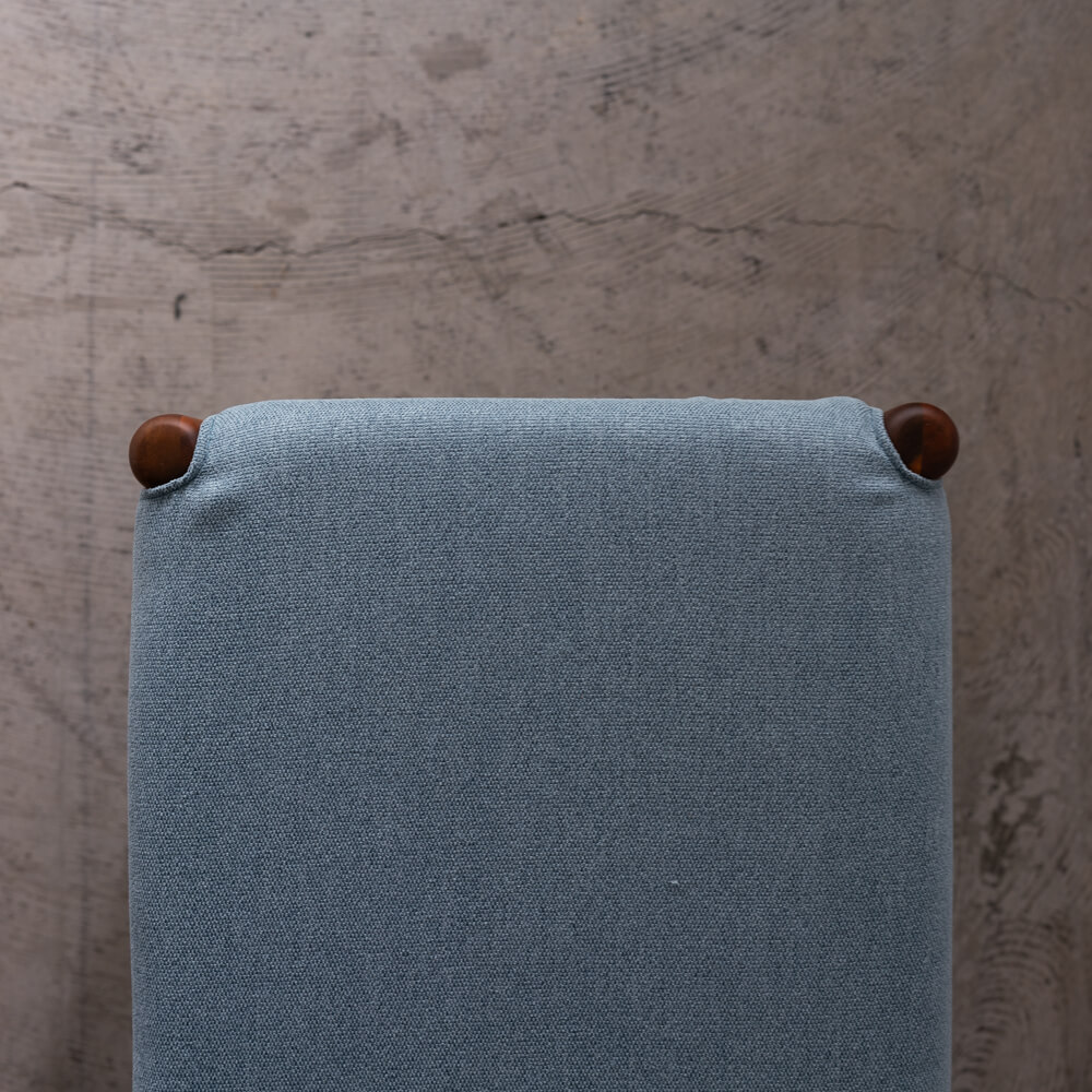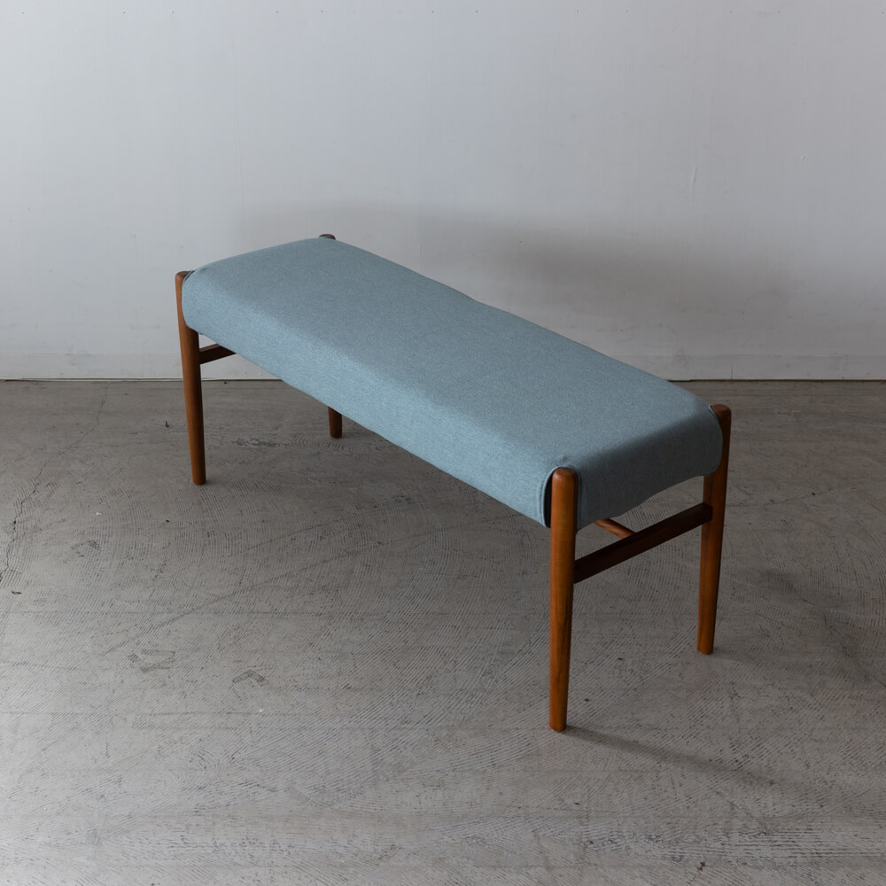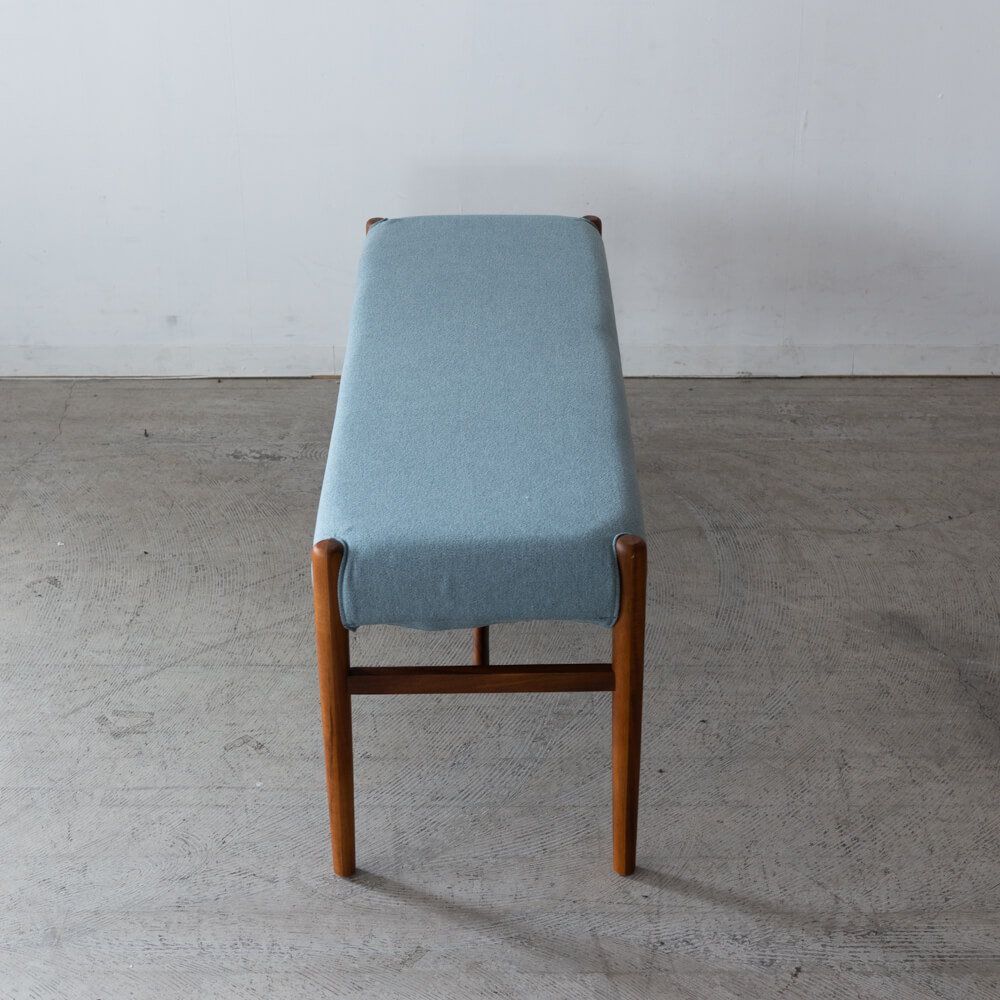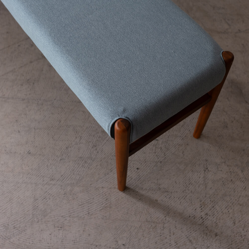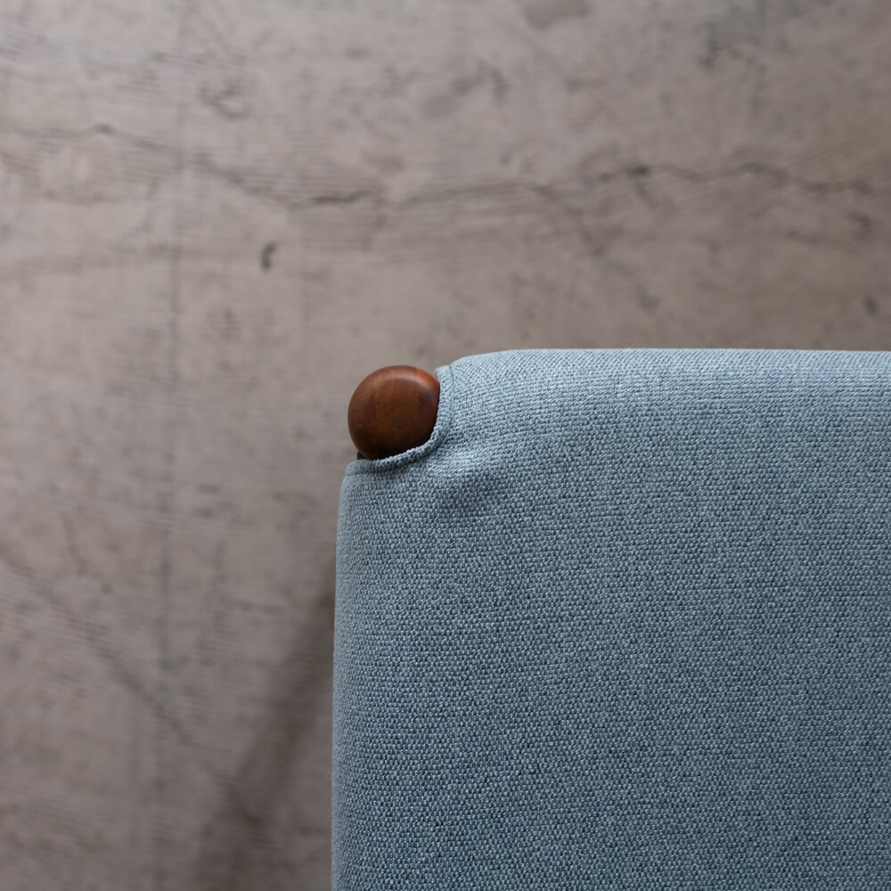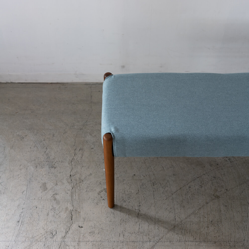 このベンチに使われているのは くすみ感のある淡いブルー。主張しすぎず、北欧ファブリックのようにふんわりと空間に馴染みます。