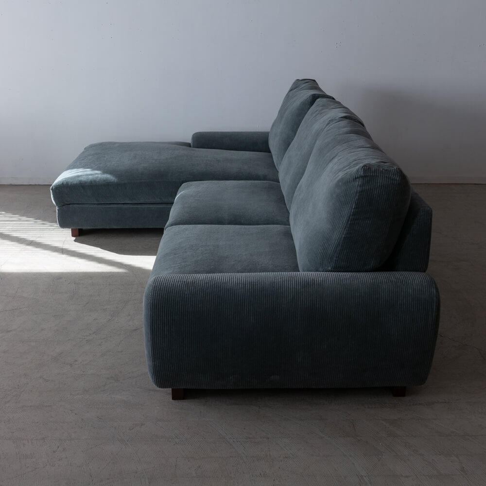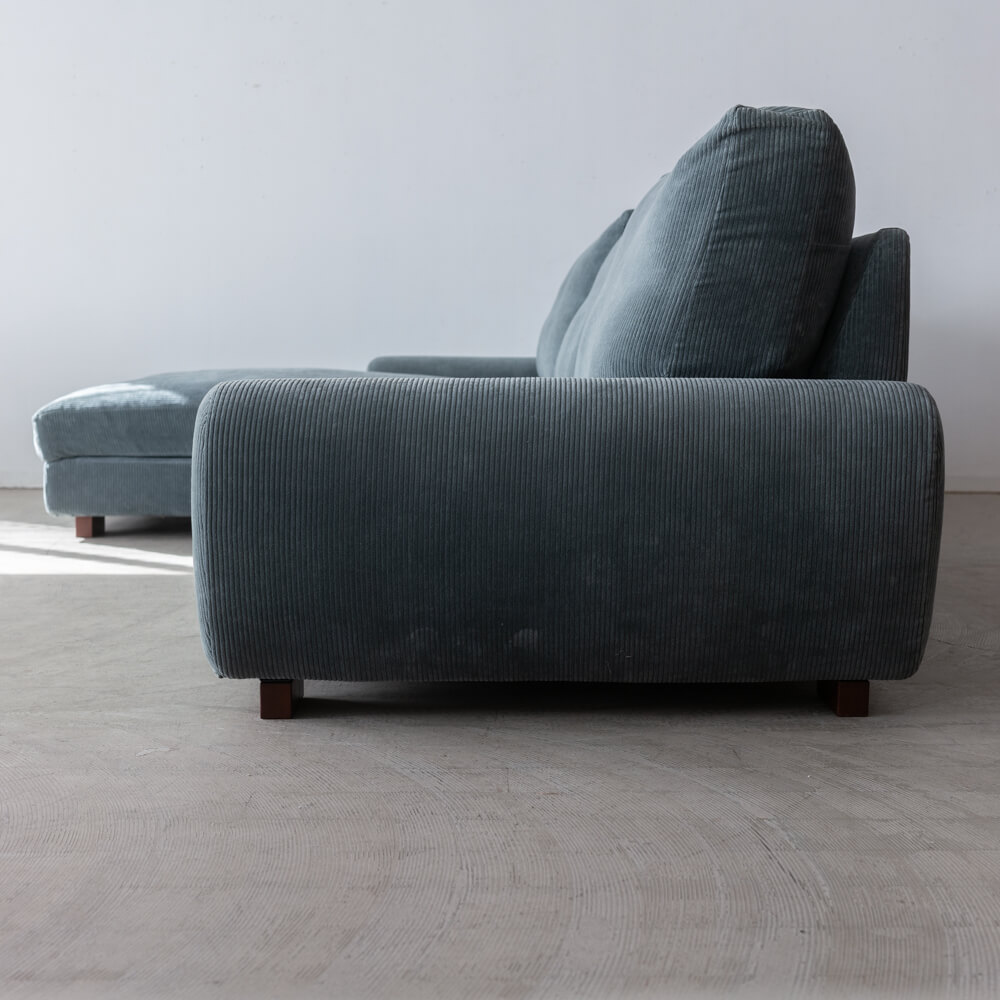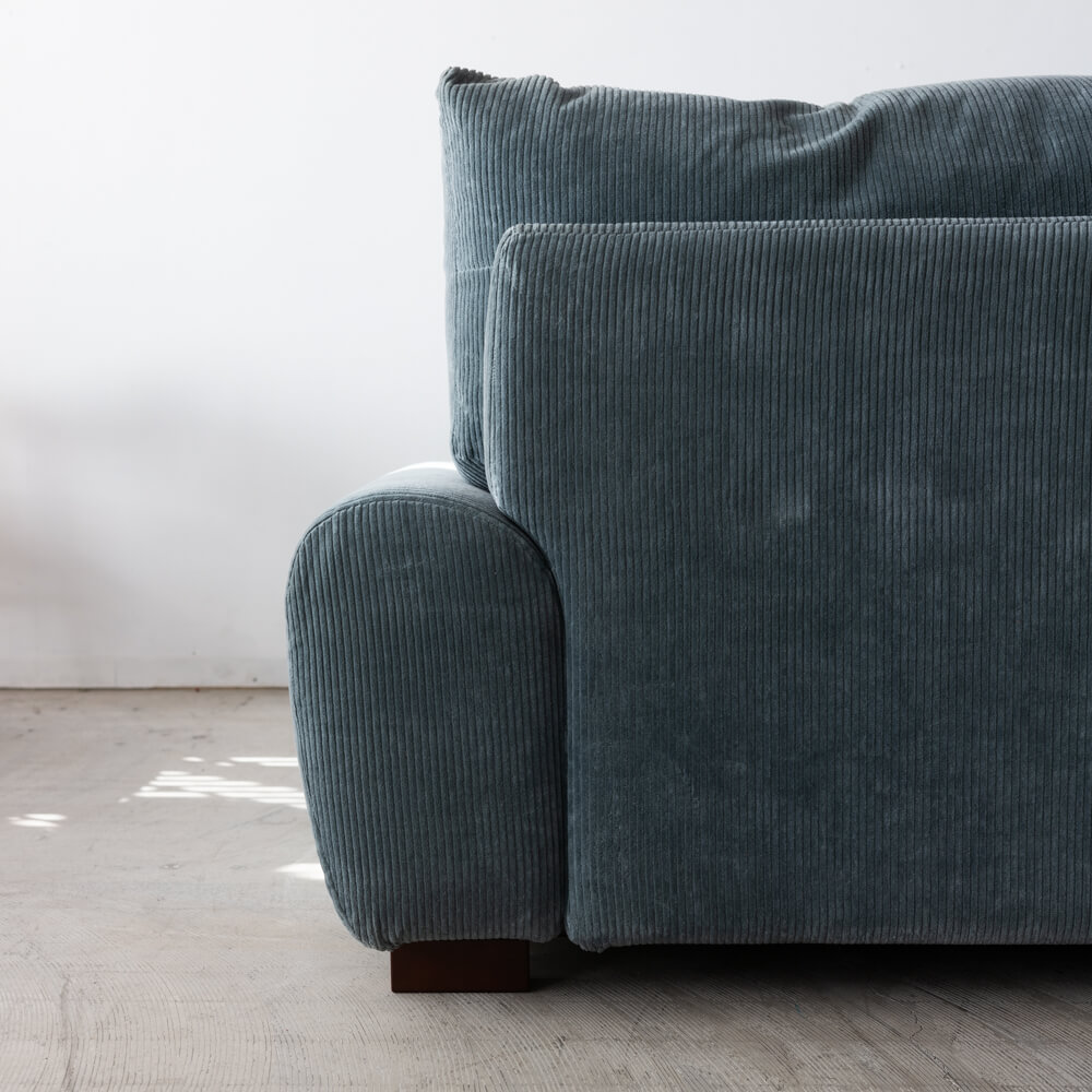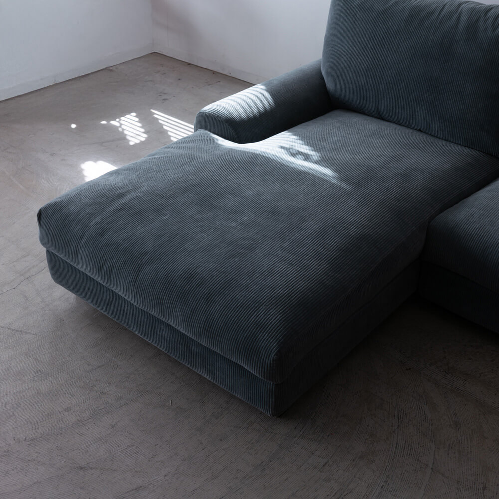 奥行き106cm。ゆったりと身体を預けるだけで肩の力がふっと抜けていく——。このカウチソファは、三層ウレタンとたっぷりのフェザーを重ねることで、“沈まず、しかし沈みこむ”ような心地よさを実現しました。国産コットン100%コーデュロイの柔らかな手触りと、光で表情が変わる上質なブルーが、リビングに静かな深みとくつろぎを添えます。