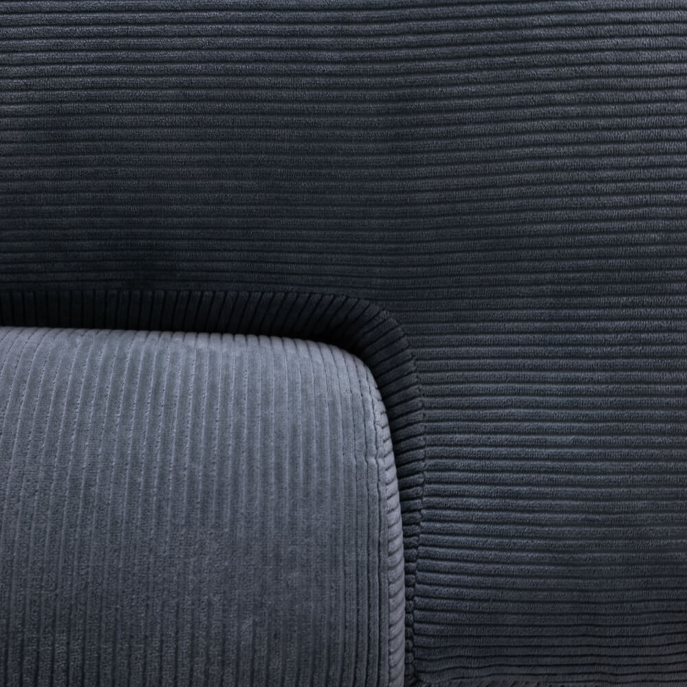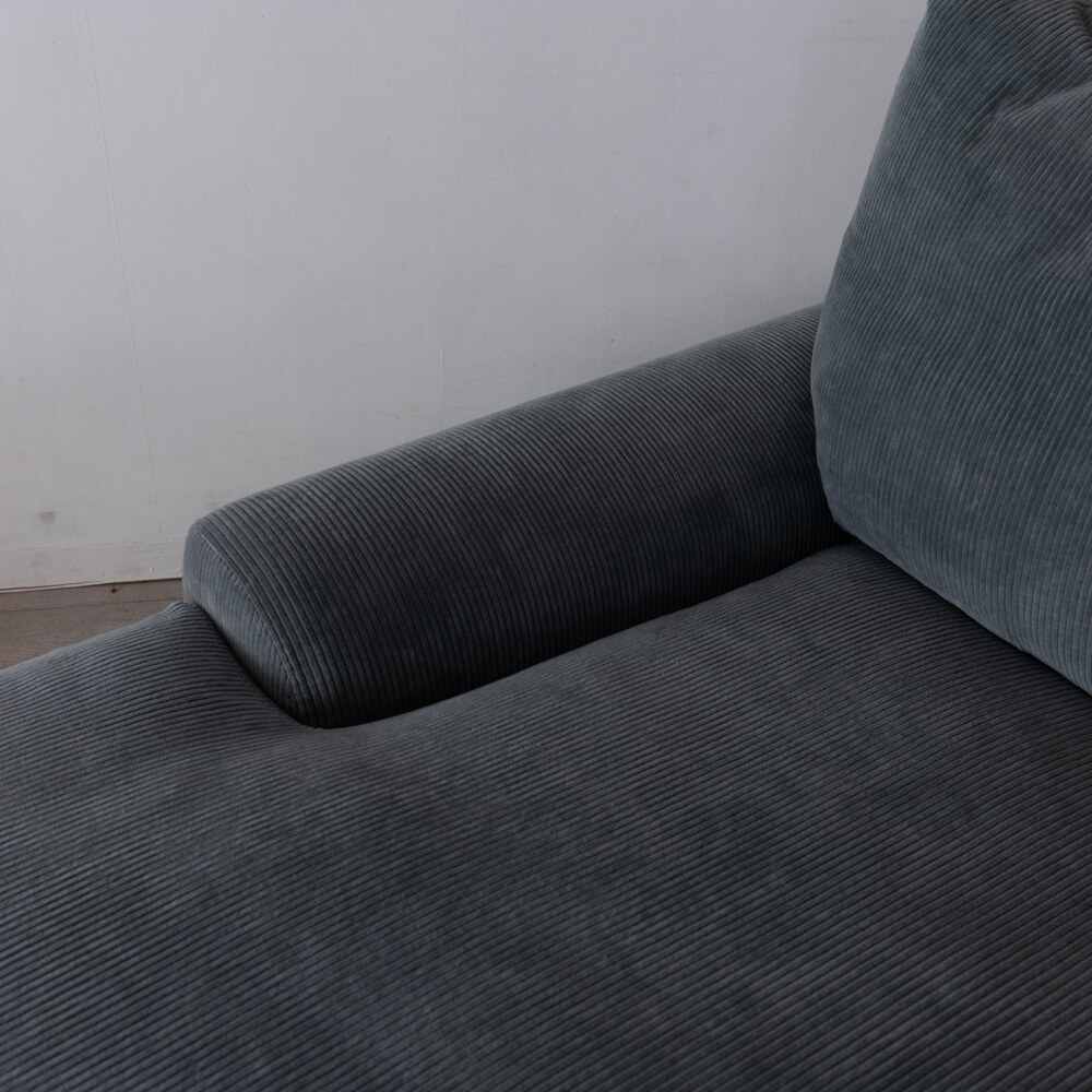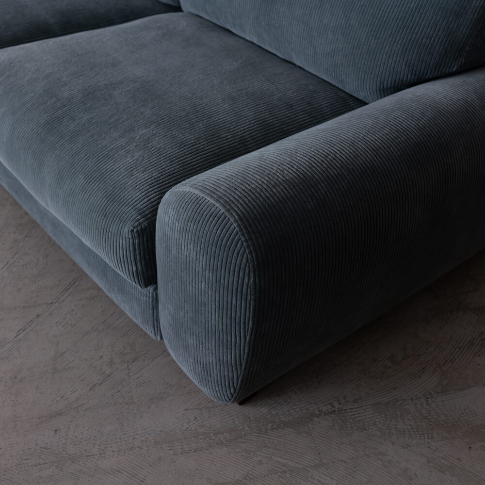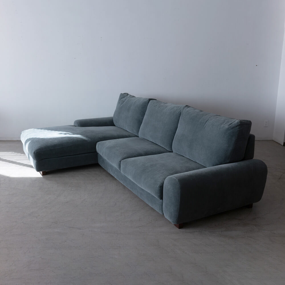 奥行き106cm。ゆったりと身体を預けるだけで肩の力がふっと抜けていく——。このカウチソファは、三層ウレタンとたっぷりのフェザーを重ねることで、“沈まず、しかし沈みこむ”ような心地よさを実現しました。国産コットン100%コーデュロイの柔らかな手触りと、光で表情が変わる上質なブルーが、リビングに静かな深みとくつろぎを添えます。