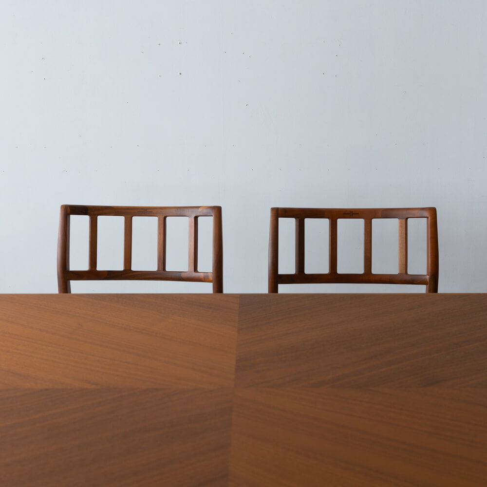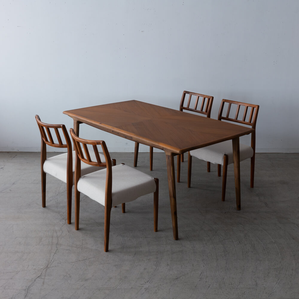 テーブル天板にはウォールナット突板を矢張りに配置。木目の向きが美しく交差し、光を受けるたびに豊かな表情が広がります。無垢材では出しづらい、端正で均一な美しさも魅力です。