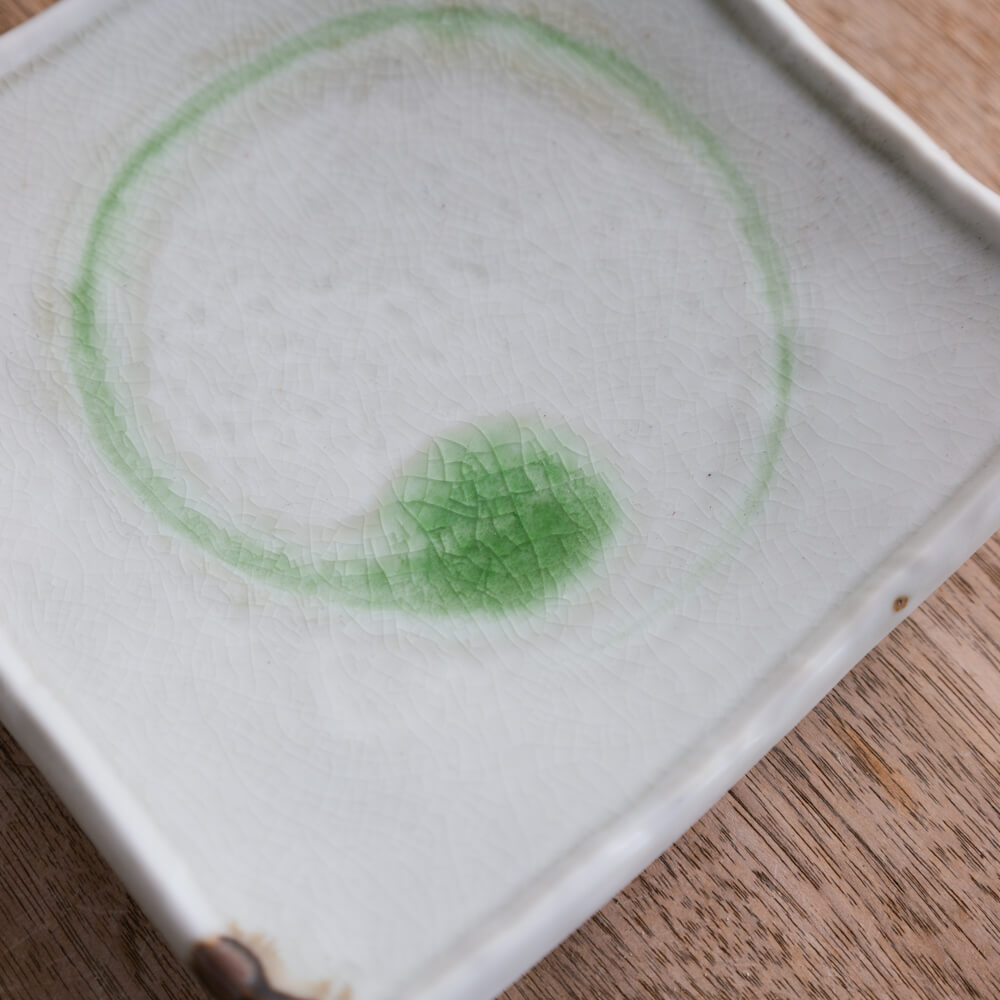 白釉の中に淡く滲む緑が、そっと渦を描くように広がる角皿。表面に細やかに走る「貫入」が光を柔らかくとらえ、和食器ならではの奥行きを生み出しています。四つ足で持ち上がった形は、食卓に軽やかな影を落とし、盛り付けの余白まで美しく演出してくれます。