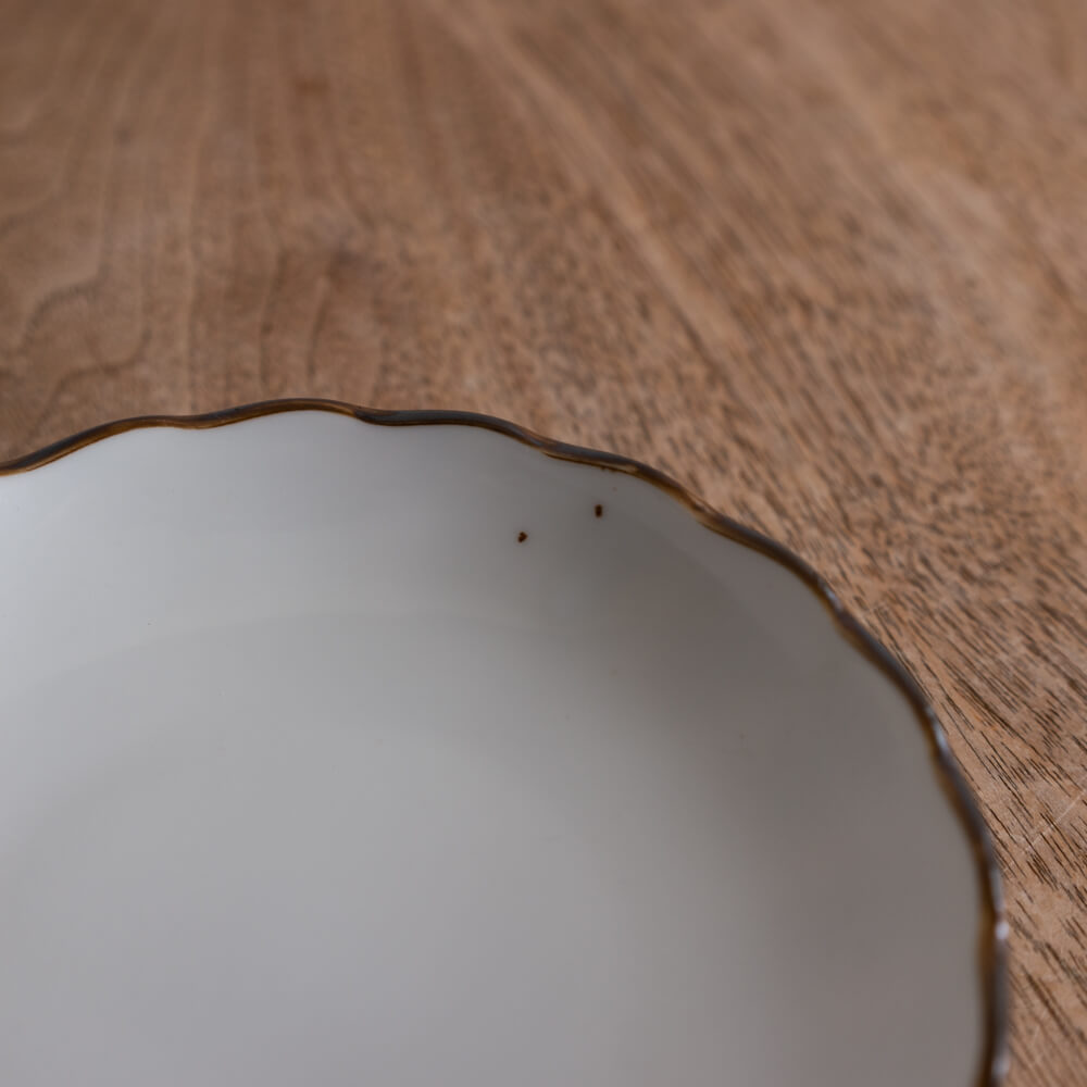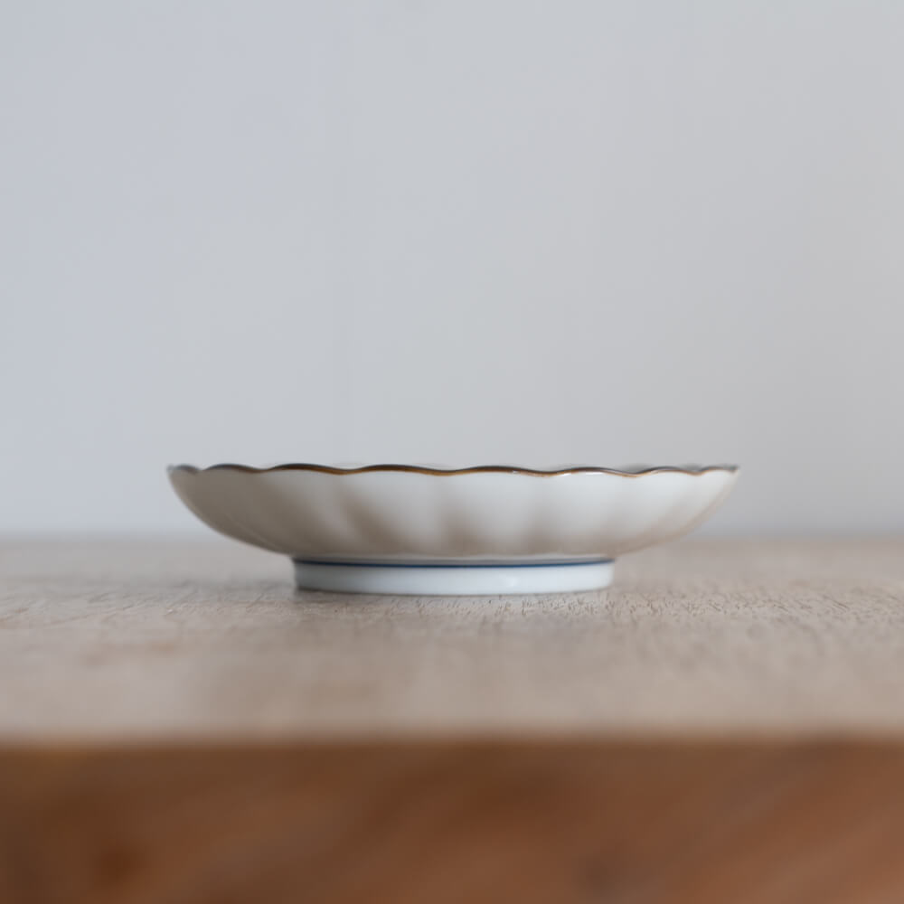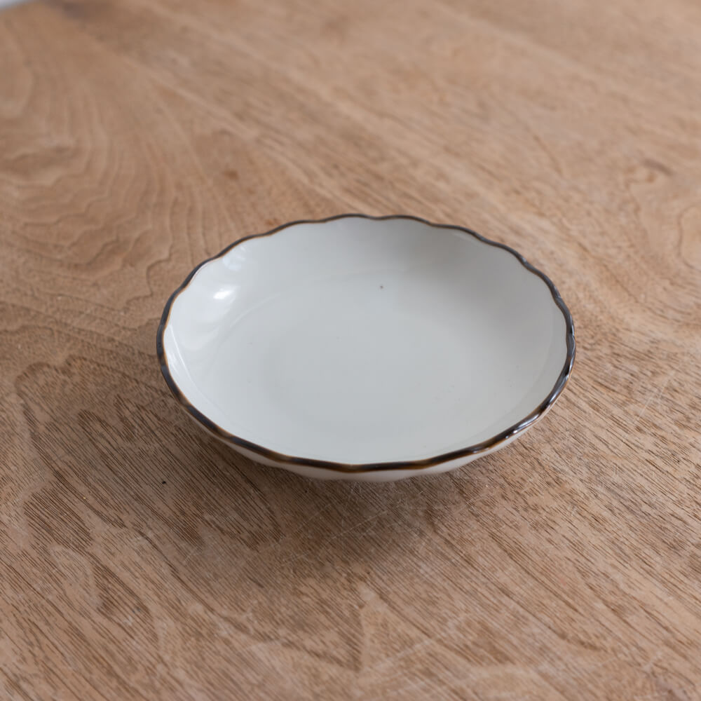 白磁のやさしい表情に、細く添えられた錆色の縁取り。素朴さと凛とした印象が共存する小さな和食器です。菊形のやわらかなラインが光を受けて陰影を生み、料理をそっと引き立てます。毎日の食卓で“使いやすさ”と“美しさ”の両方を叶えてくれる小皿です。