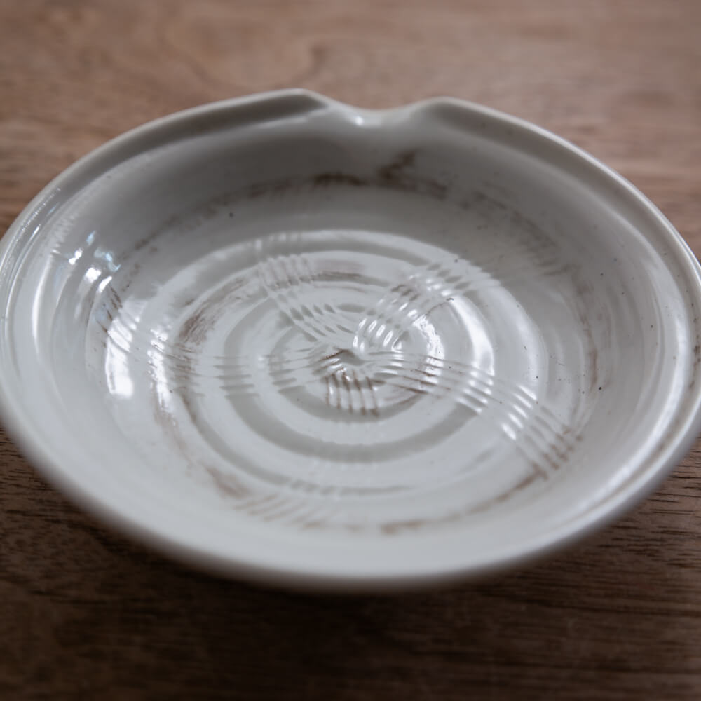 やわらかな粉引の白に、手仕事のリズムがそのまま残るようなうず模様。片口の小さなアクセントがほどよく遊び心を添え、和食器の素朴な温もりをふっと感じさせてくれる小皿です。薬味、タレ皿、副菜…どんな場面にもすっと馴染み、毎日の食卓で頼れる一枚になります。