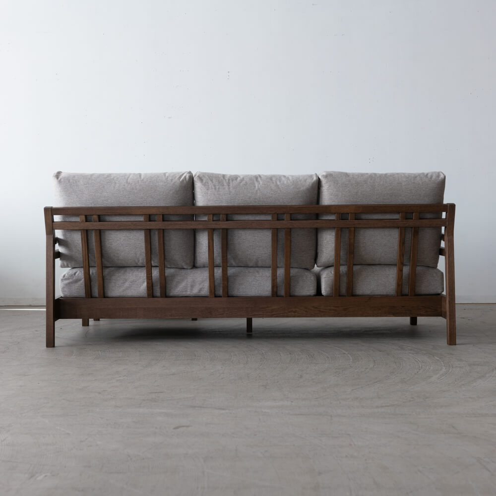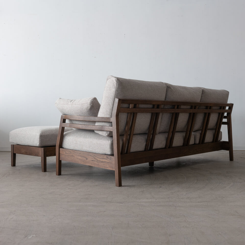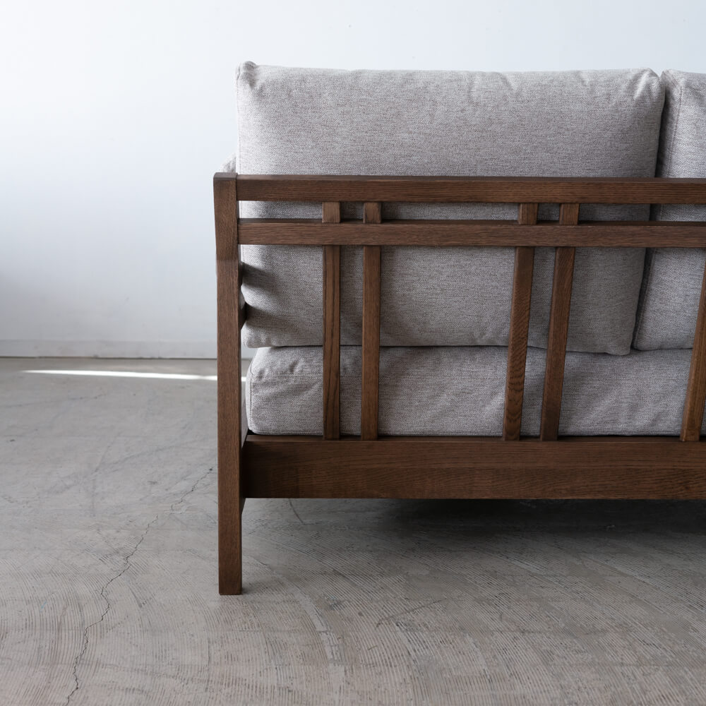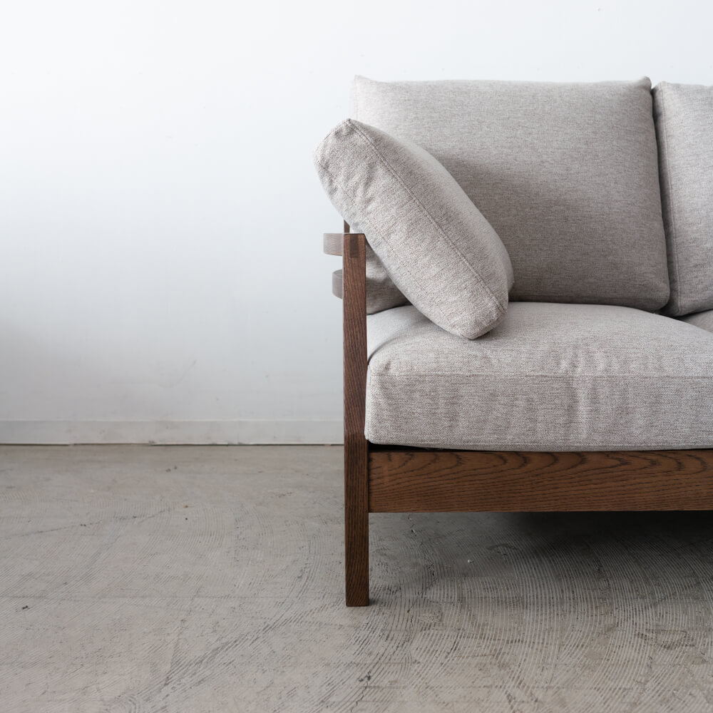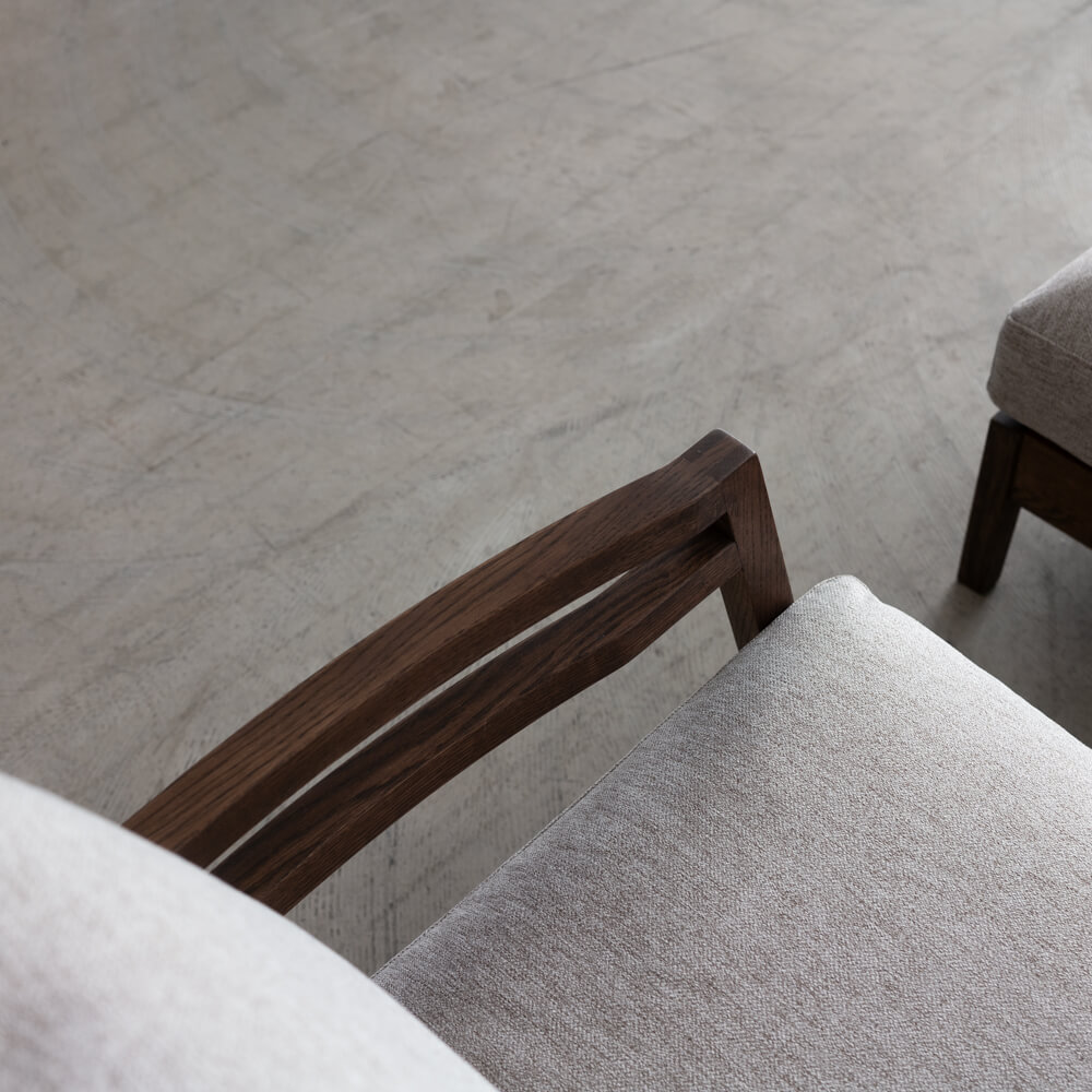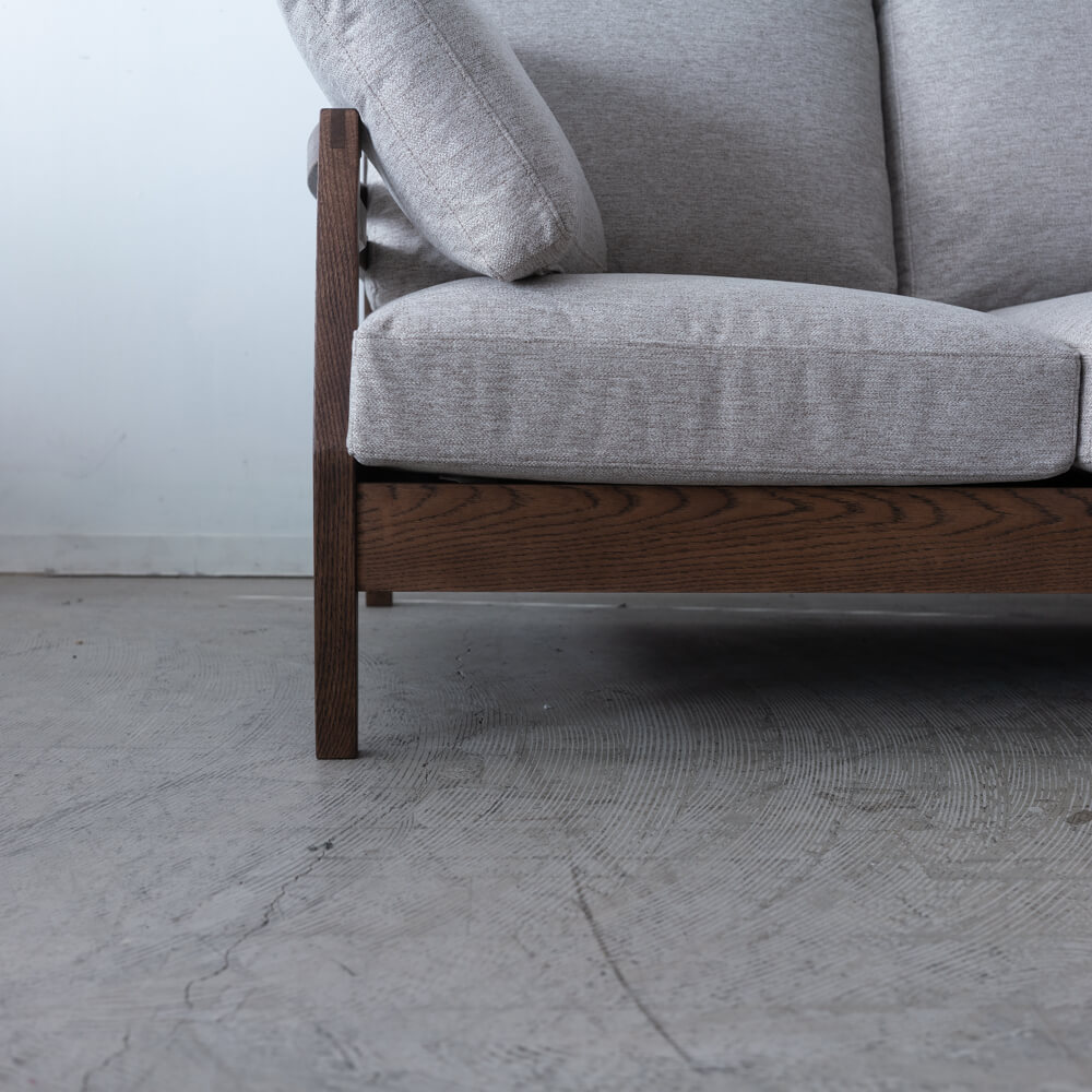 フレームには、豊かな木目が魅力のオーク材を使用。自然な風合いを引き立てるオイル仕上げにより、使うほどに色つやが増し、暮らしになじんでいきます。脚部は軽やかなデザインで、視覚的にも空間に“抜け”を演出。