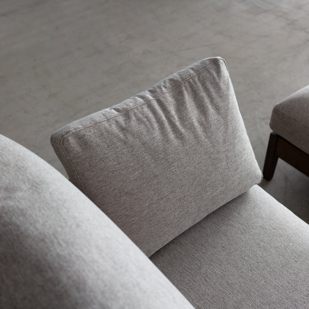 足を伸ばして深く腰を預けた瞬間、ふんわりと身体を受け止めるやさしい感触。軽やかなスモールフェザーと、芯で支えるウレタンの組み合わせが生む“包み込まれる安心感”が、リビングをいちばんのくつろぎ空間へ導きます。