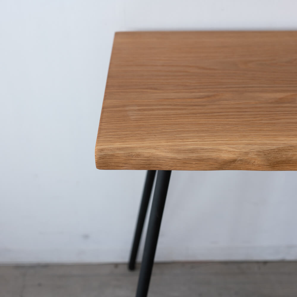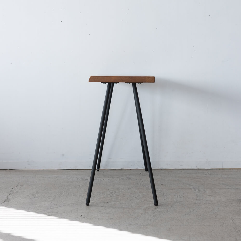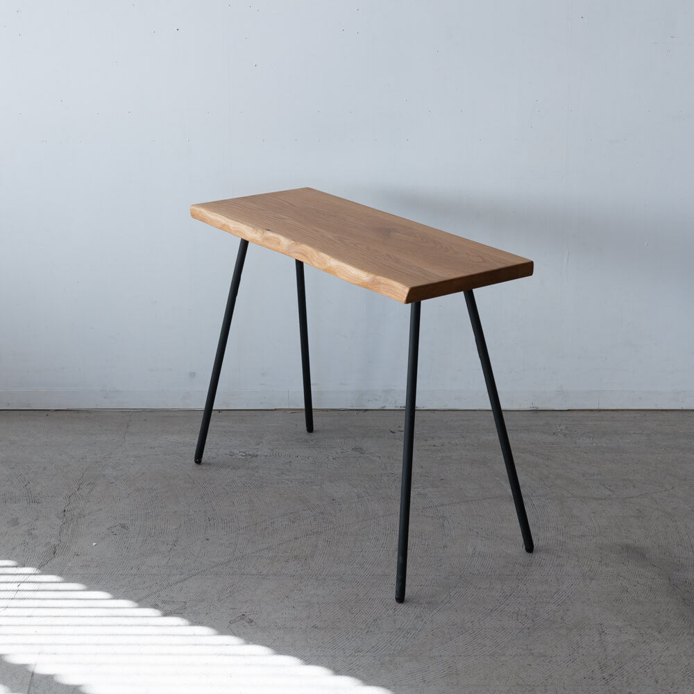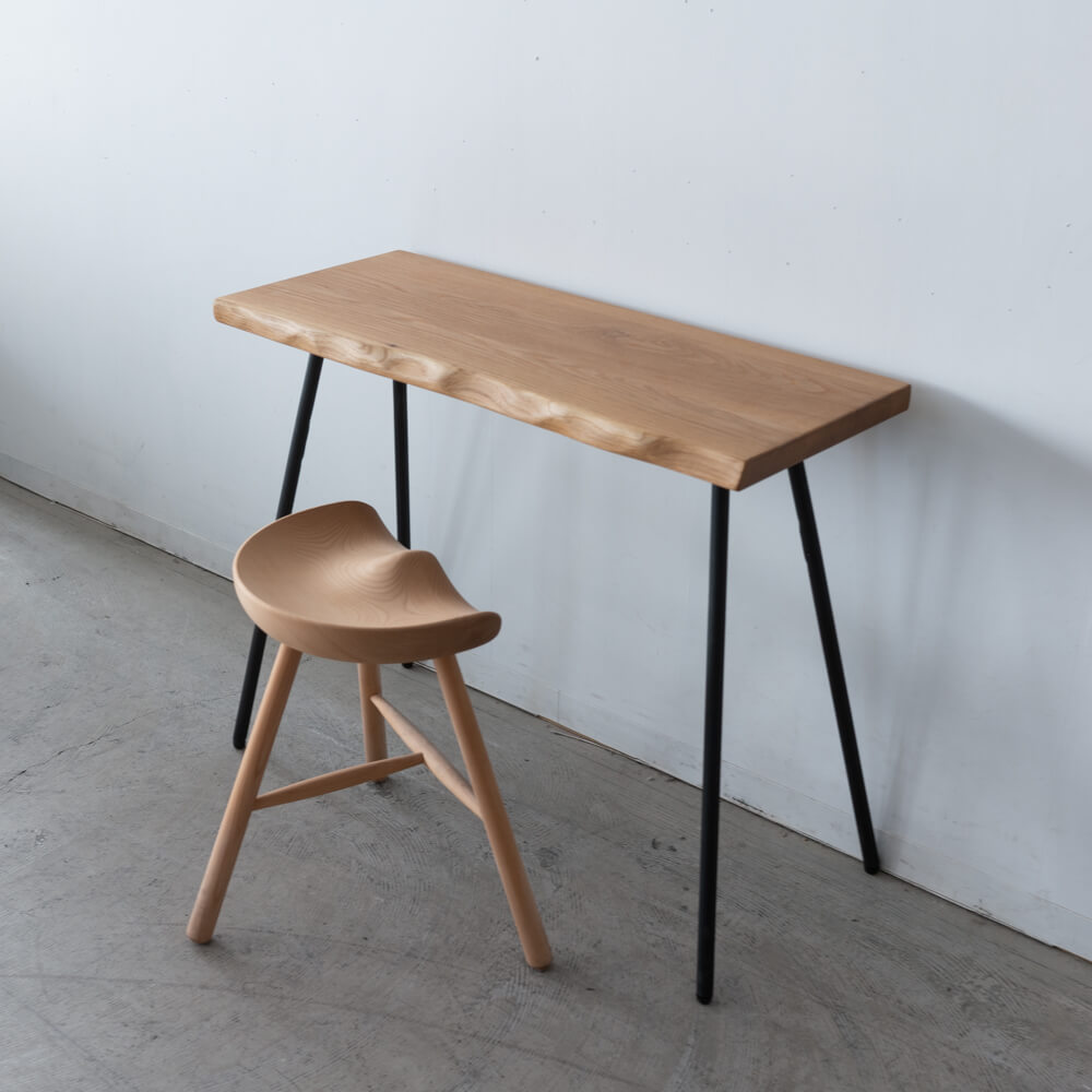 北海道産サワグルミのやわらかな木肌と、自然な輪郭を残した耳付きラインが魅力のコンパクトテーブル。軽くて扱いやすい素材に、細身のアイアン脚を組み合わせ、空間にそっと馴染む軽快な佇まいをつくりました。ワークデスクにもディスプレイ台にも使いやすい、現品SALEならではの一点ものです。