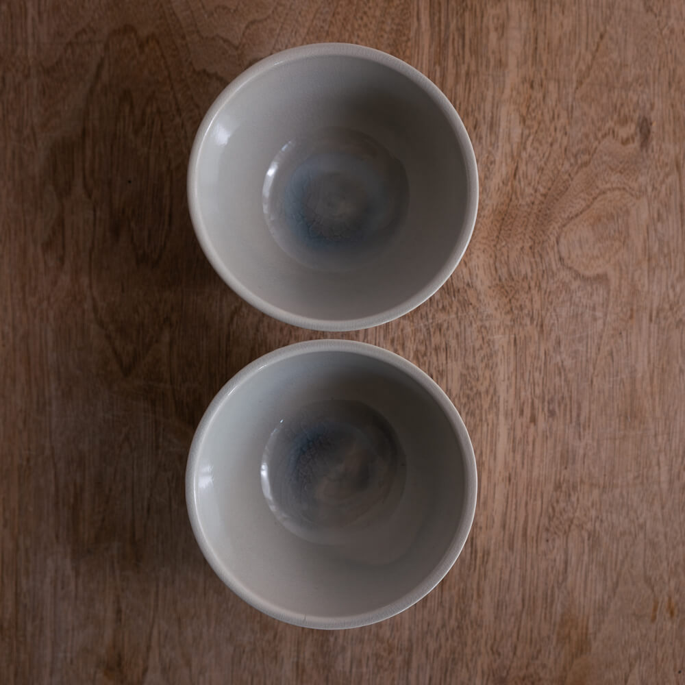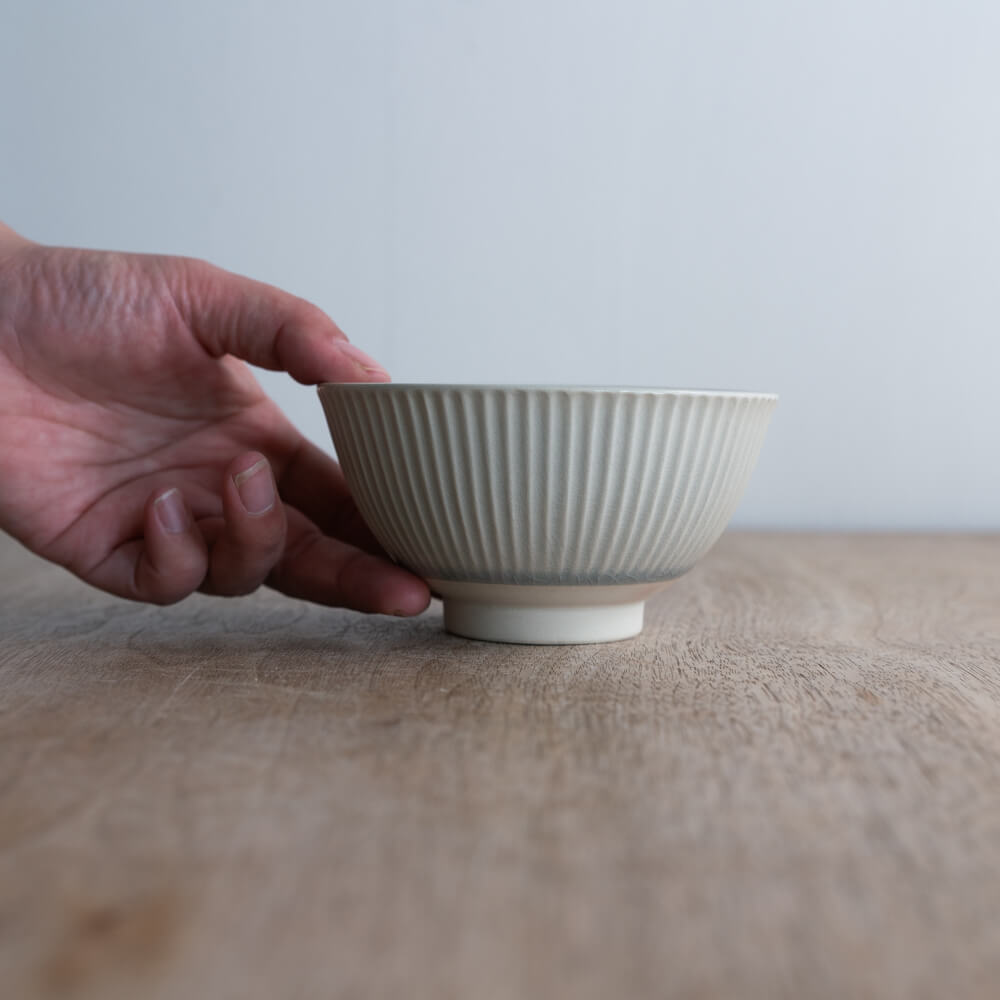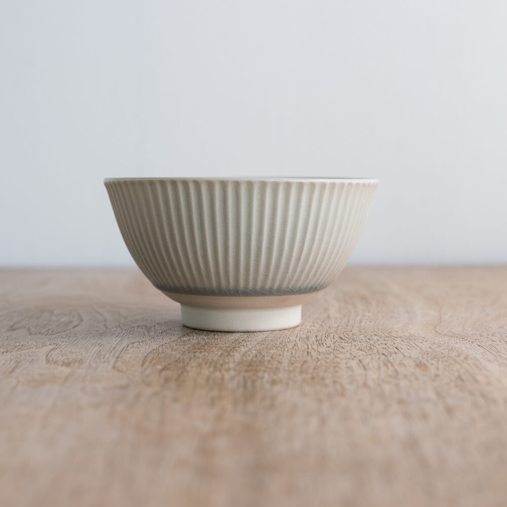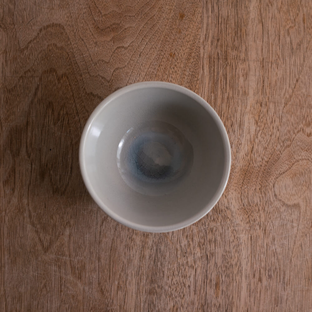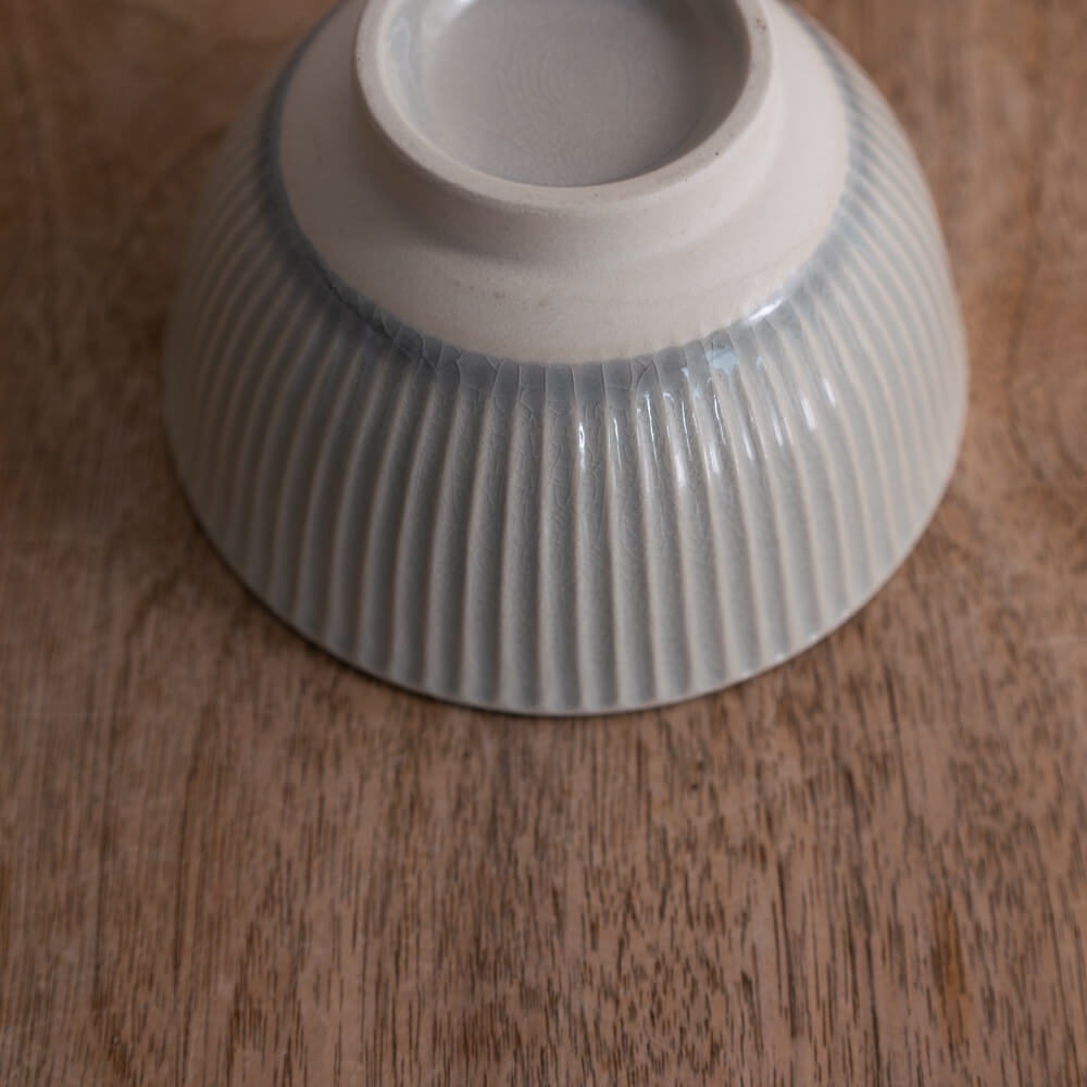 淡く溶け込むような灰青色が、見込みから外側へとふわりと広がる小さな茶碗。釉薬の下に静かに浮かぶ貫入が、ひとつずつ異なるやわらかな景色を描いています。外側のしのぎ模様が立体感を添え、素朴さと清らかさが同居する佇まいが魅力です。