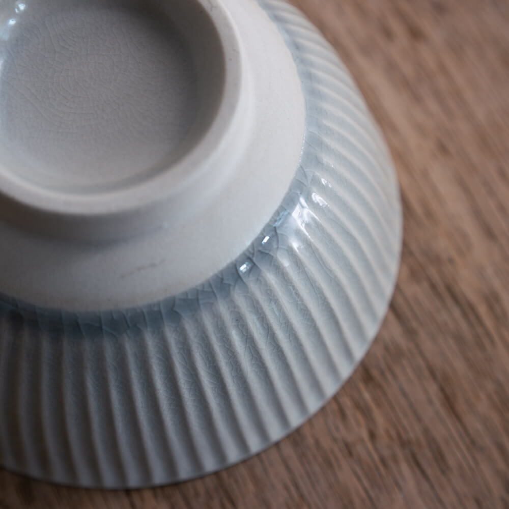 高台は無釉で仕上げられ、素地の白が清らかに残っています。淡い灰青色とのコントラストが器の輪郭を引き締め、置いた姿まで美しく見せてくれます。