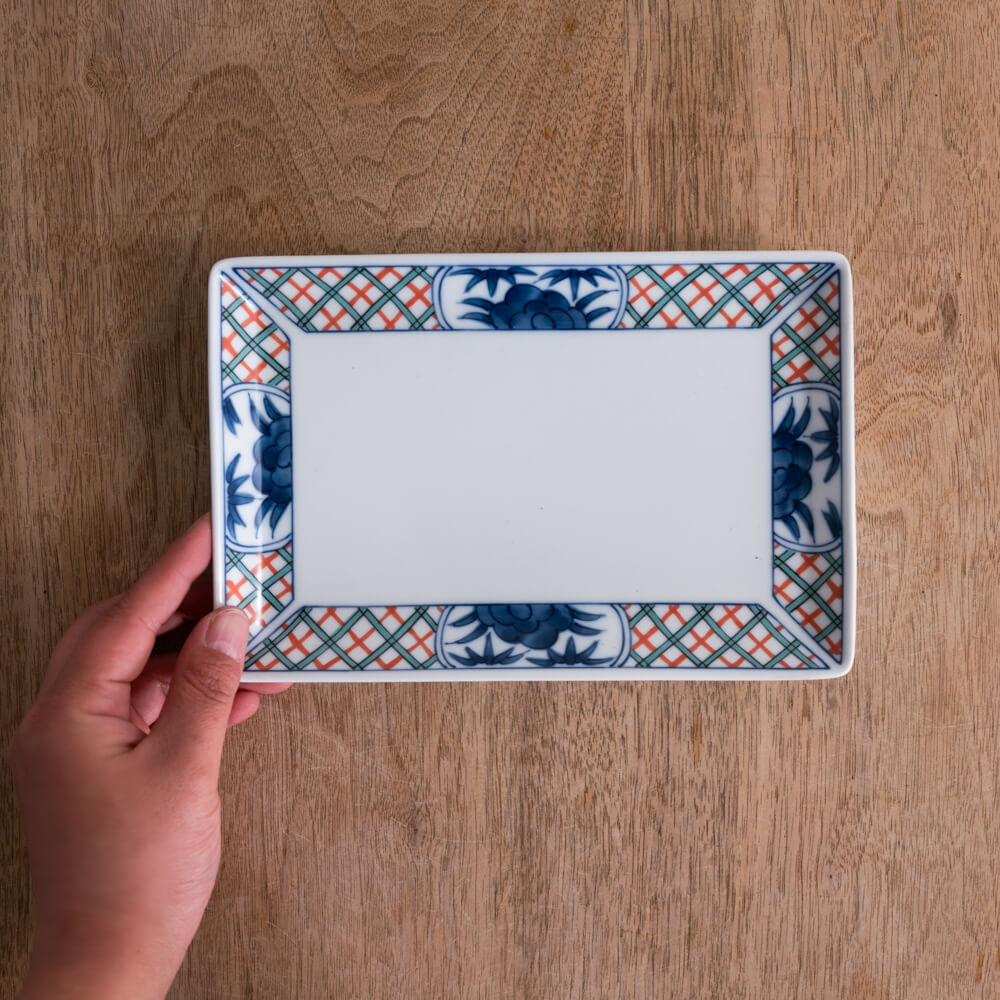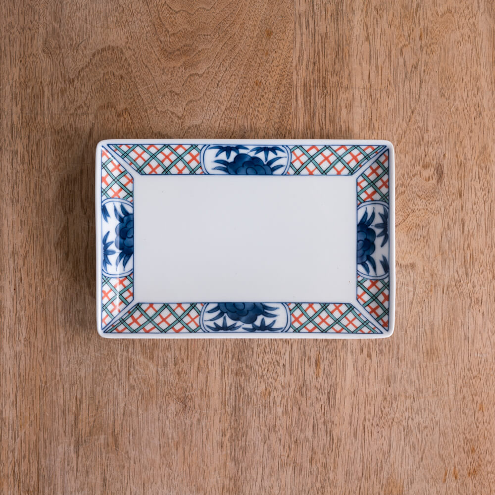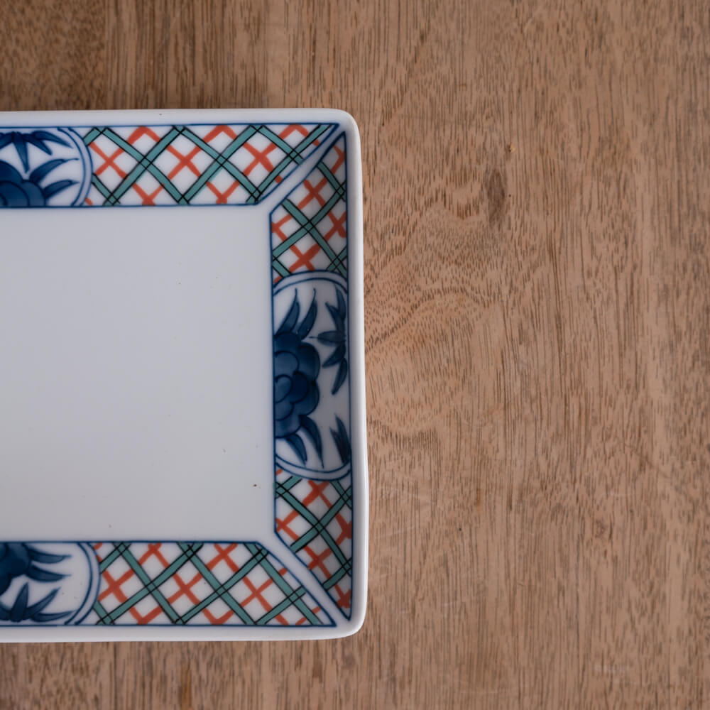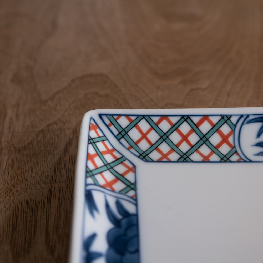 赤絵(錦手)の華やかさと、染付の落ち着きが一枚に調和した角皿です。縁に描かれた格子文様と藍の花文が、料理をそっと囲むように彩り、和食器ならではの品のよさを感じさせます。焼き魚、卵焼き、副菜の盛り付けまで幅広く活躍する、日常使いにうれしいサイズ感です。
