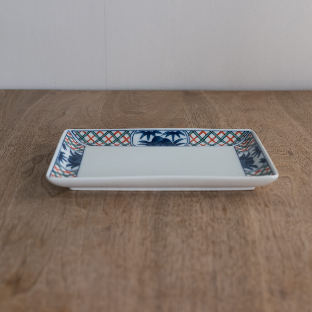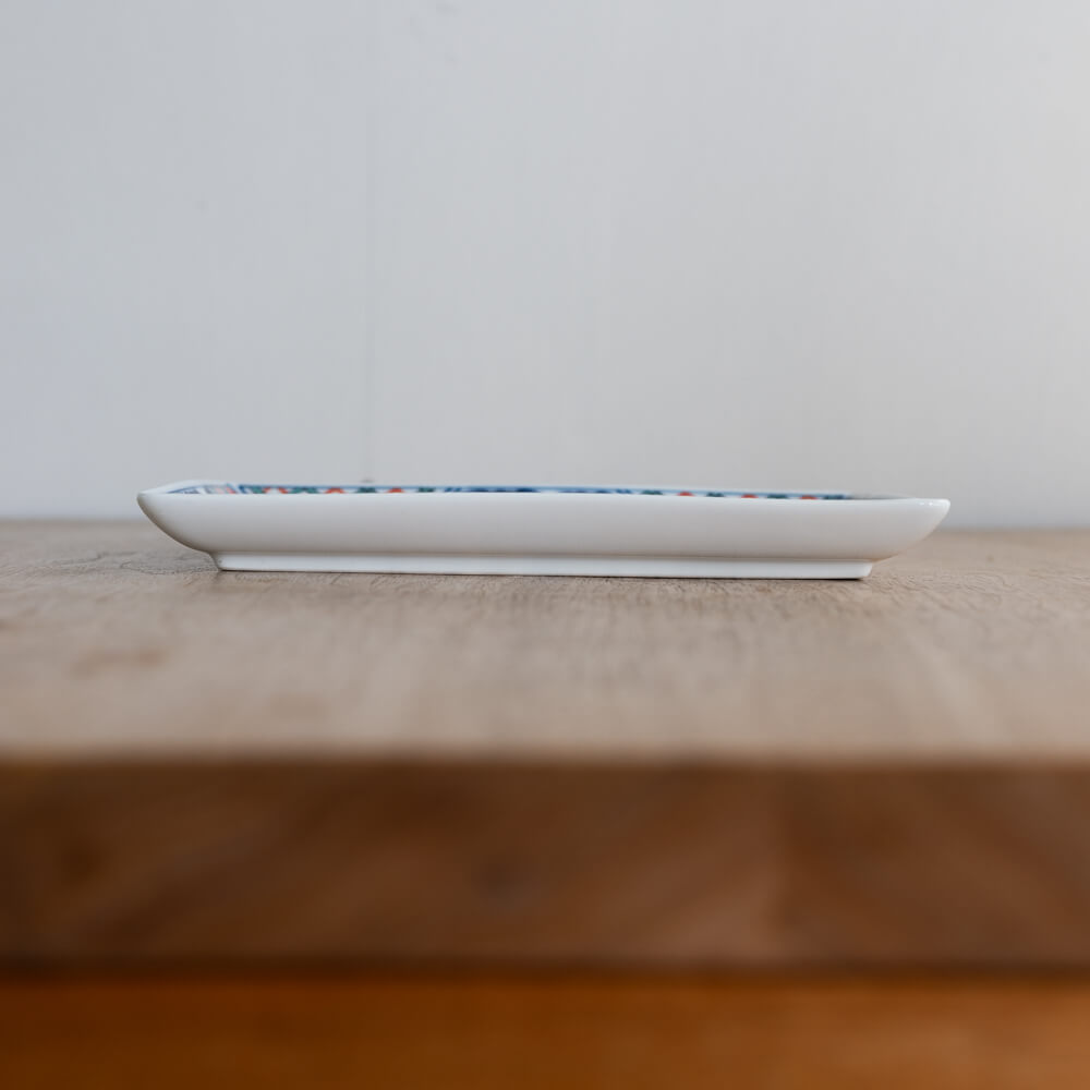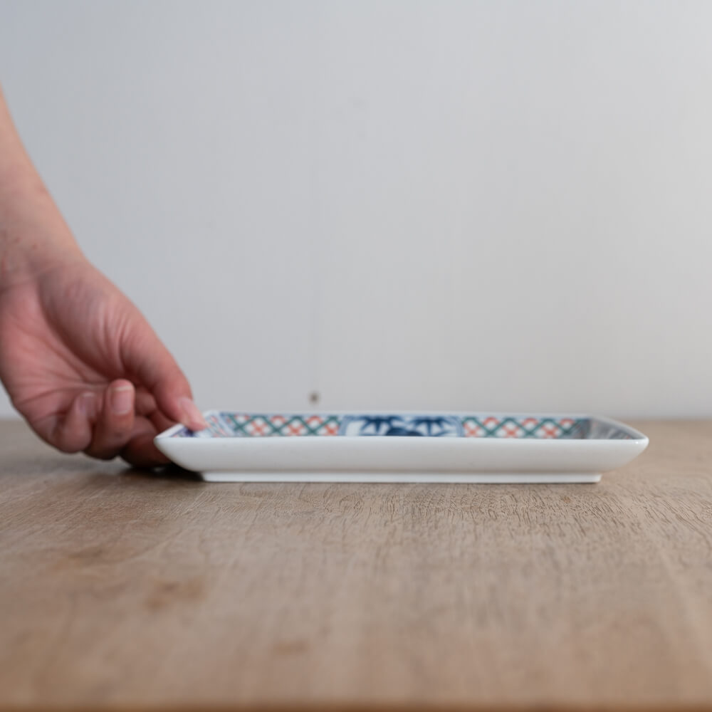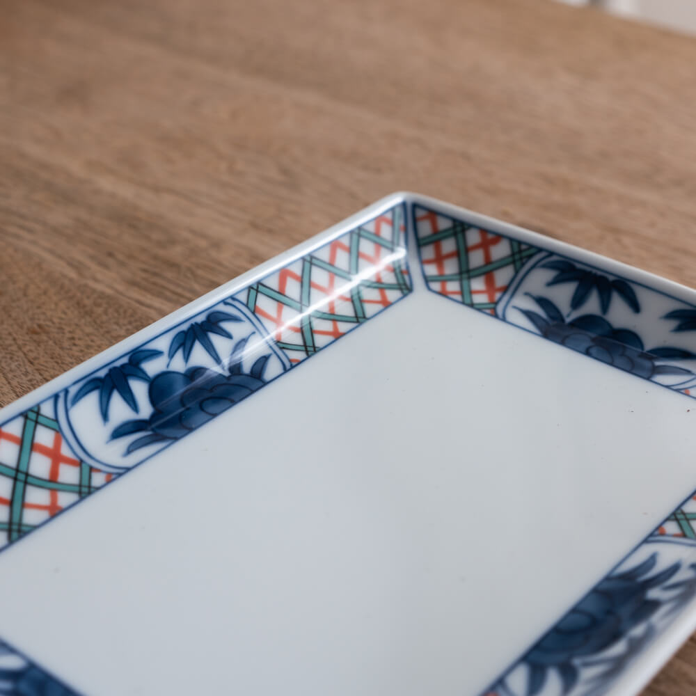 赤絵(錦手)の華やかさと、染付の落ち着きが一枚に調和した角皿です。縁に描かれた格子文様と藍の花文が、料理をそっと囲むように彩り、和食器ならではの品のよさを感じさせます。焼き魚、卵焼き、副菜の盛り付けまで幅広く活躍する、日常使いにうれしいサイズ感です。