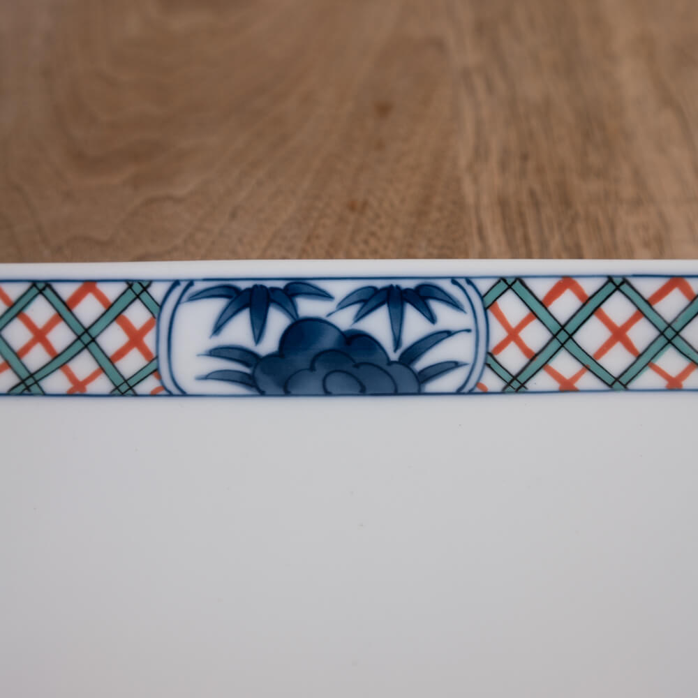 緑・朱・藍の三色を使った錦手の文様が、品よく食卓に映えるデザイン。格子文様のリズムと藍の花文が、料理をよりおいしそうに見せてくれます。和の要素がありつつ、どこか軽やかで現代的な印象も併せ持っています。